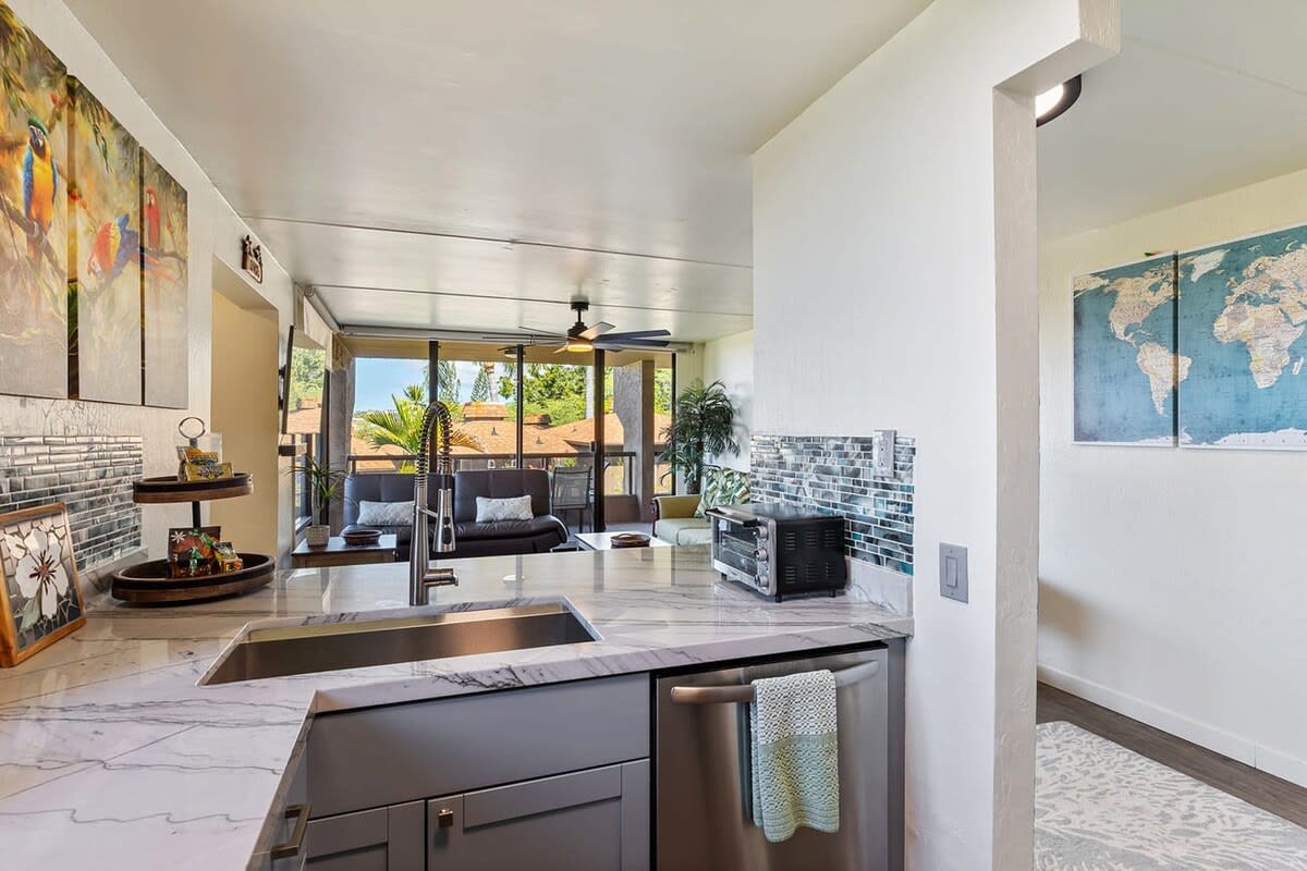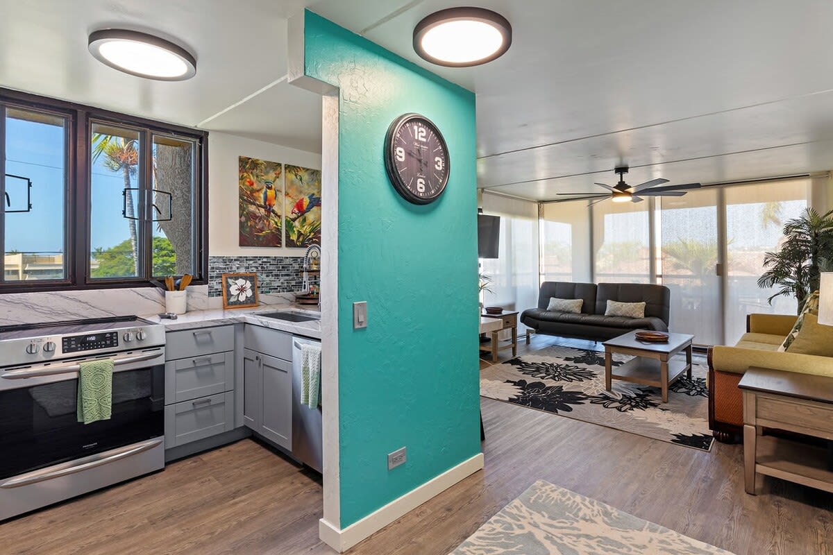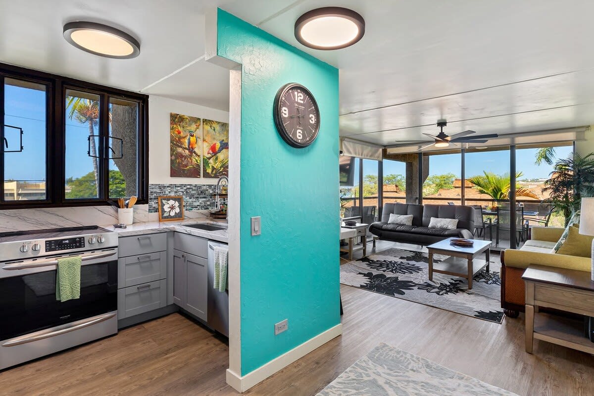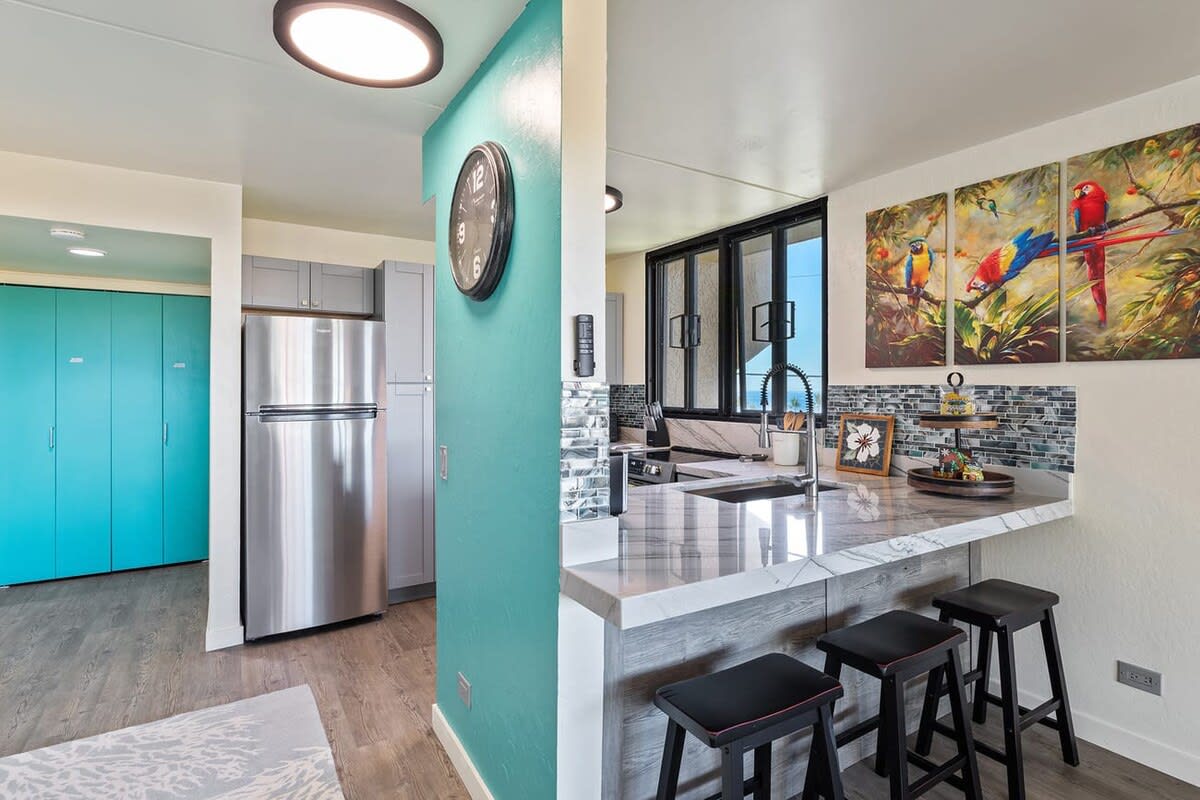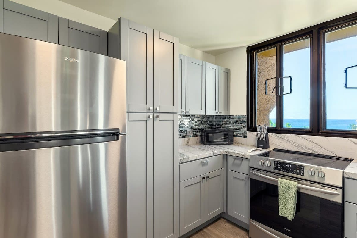 As you enter the unit the kitchen can be found on your right. Equipped with cherry wood cabinets and black appliances, the kitchen will help you prepare meals. A dining table is steps away with seating for 6 guests.
