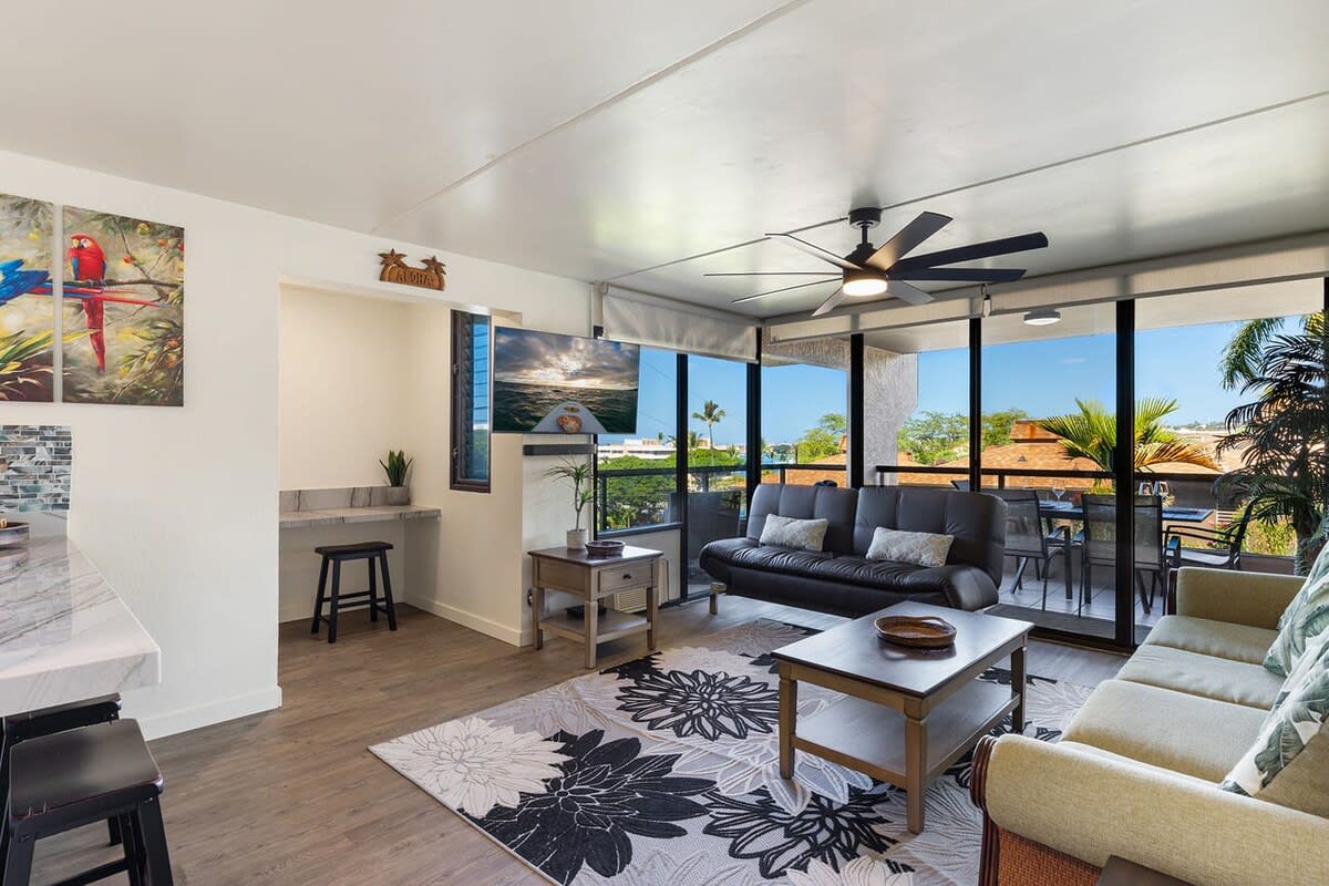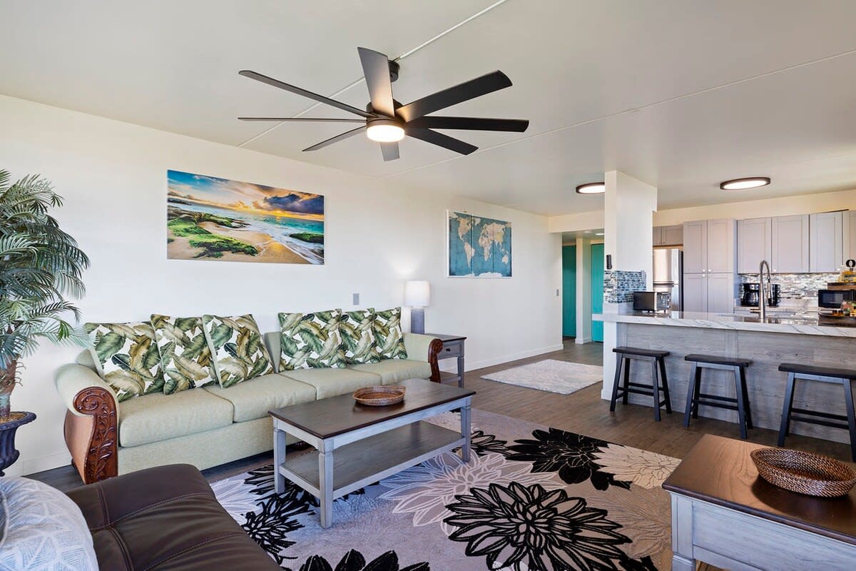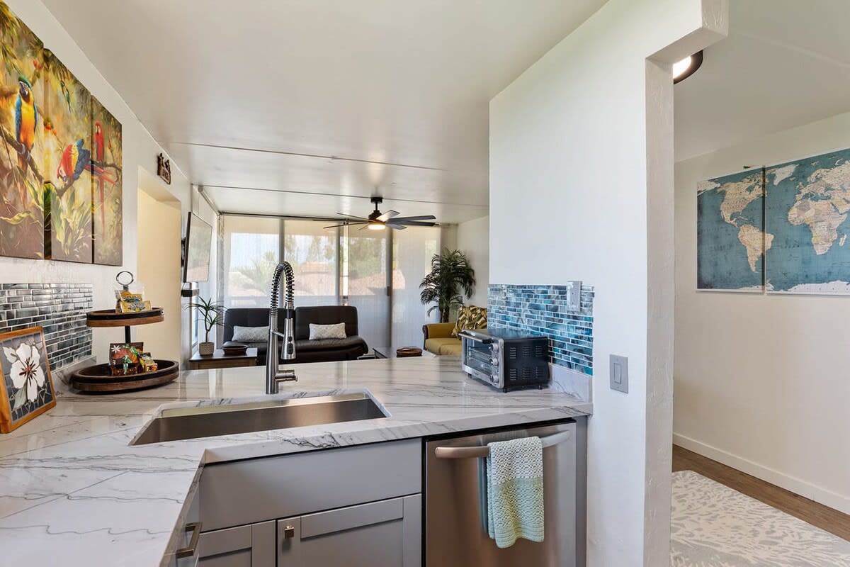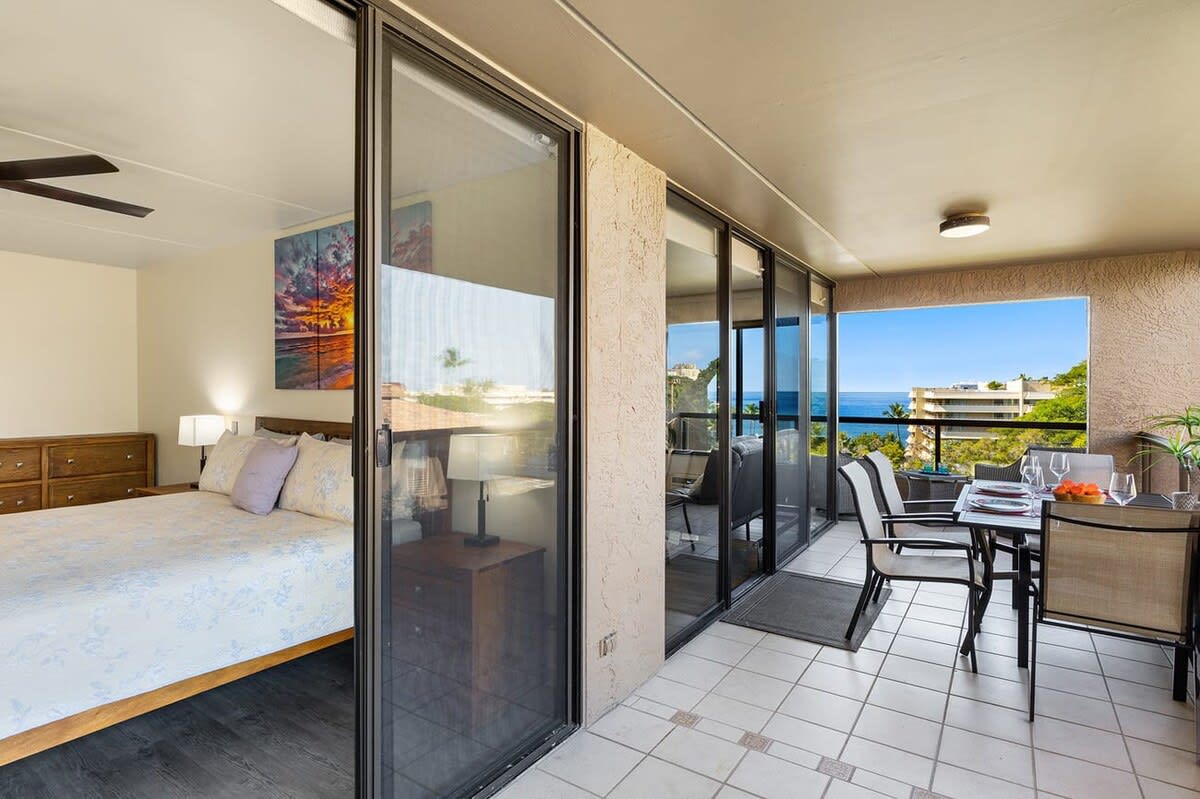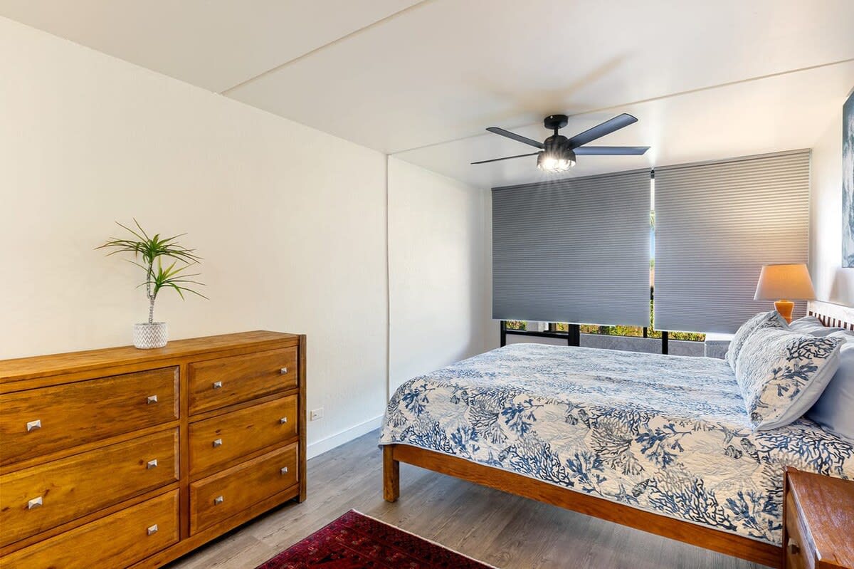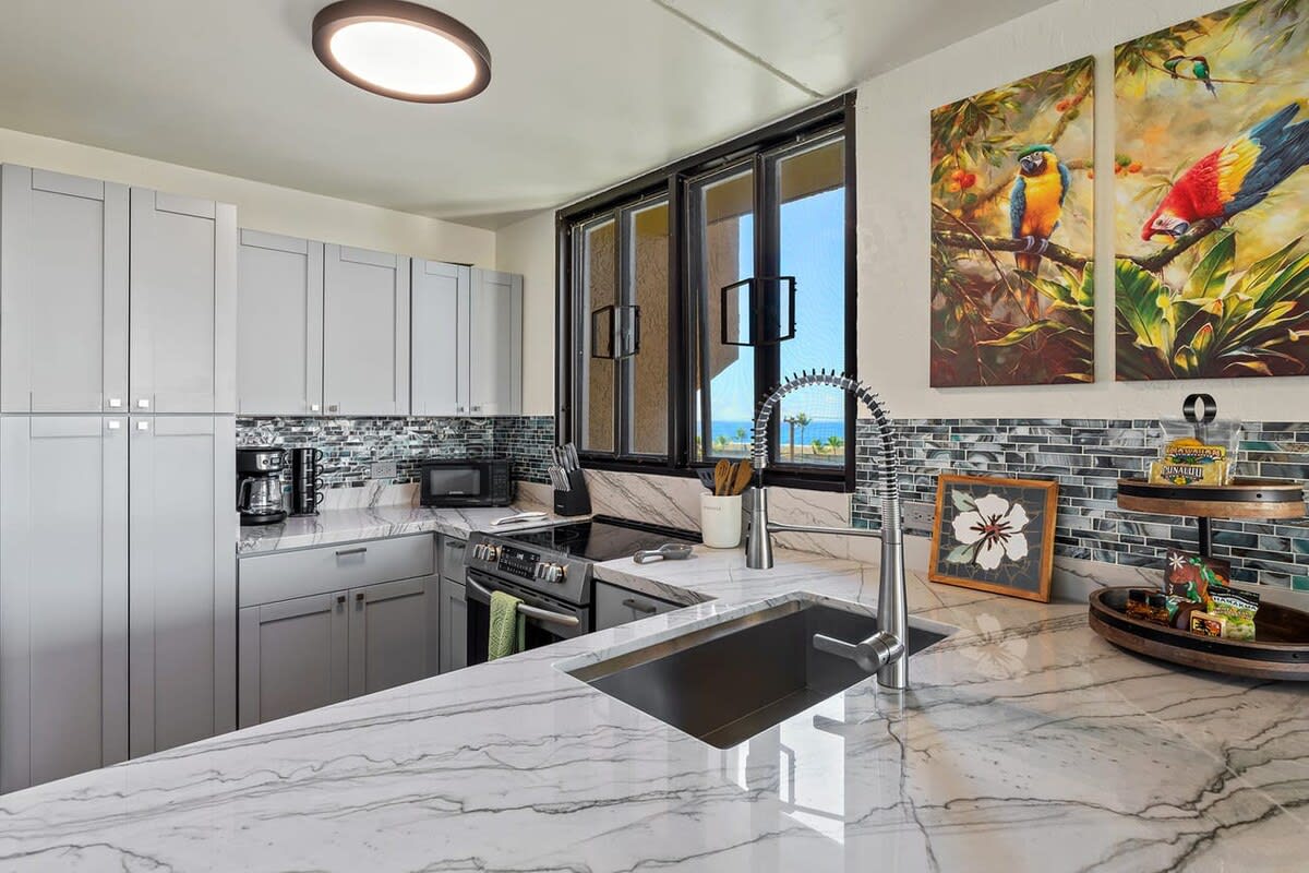 As you enter the unit the kitchen can be found on your right. Equipped with cherry wood cabinets and black appliances, the kitchen will help you prepare meals. A dining table is steps away with seating for 6 guests.