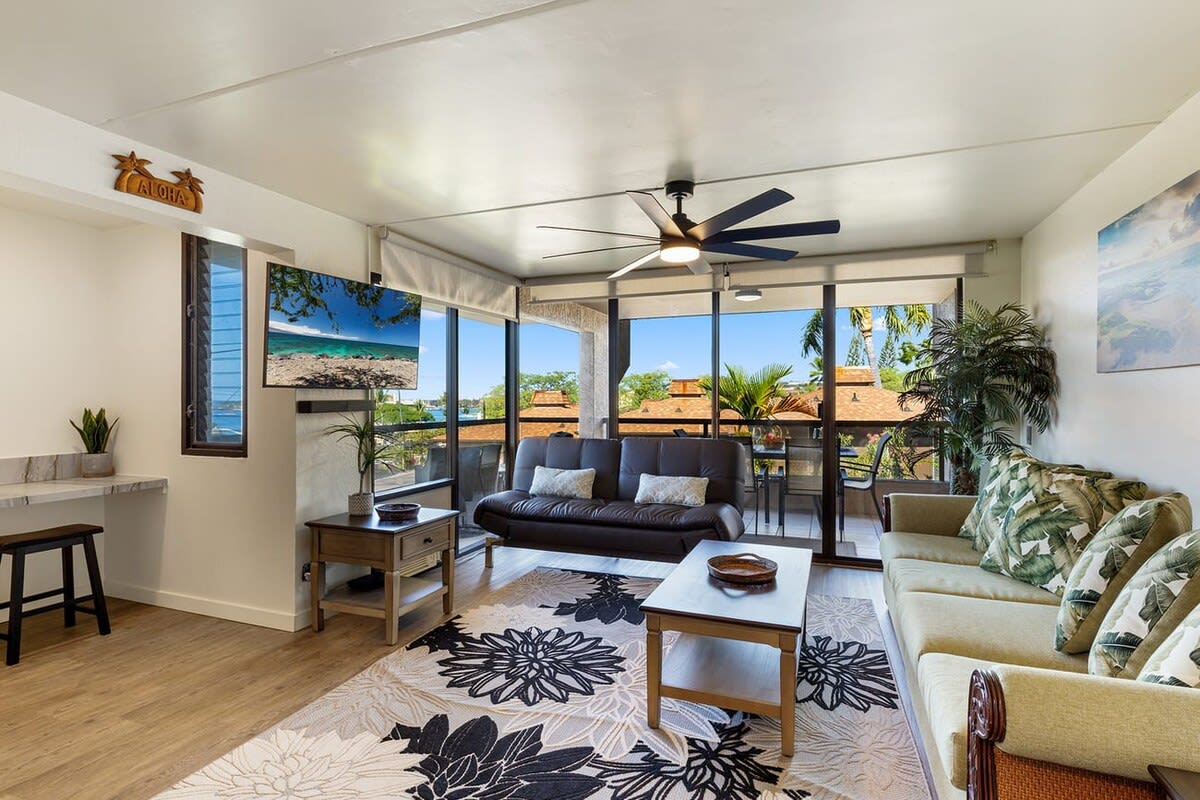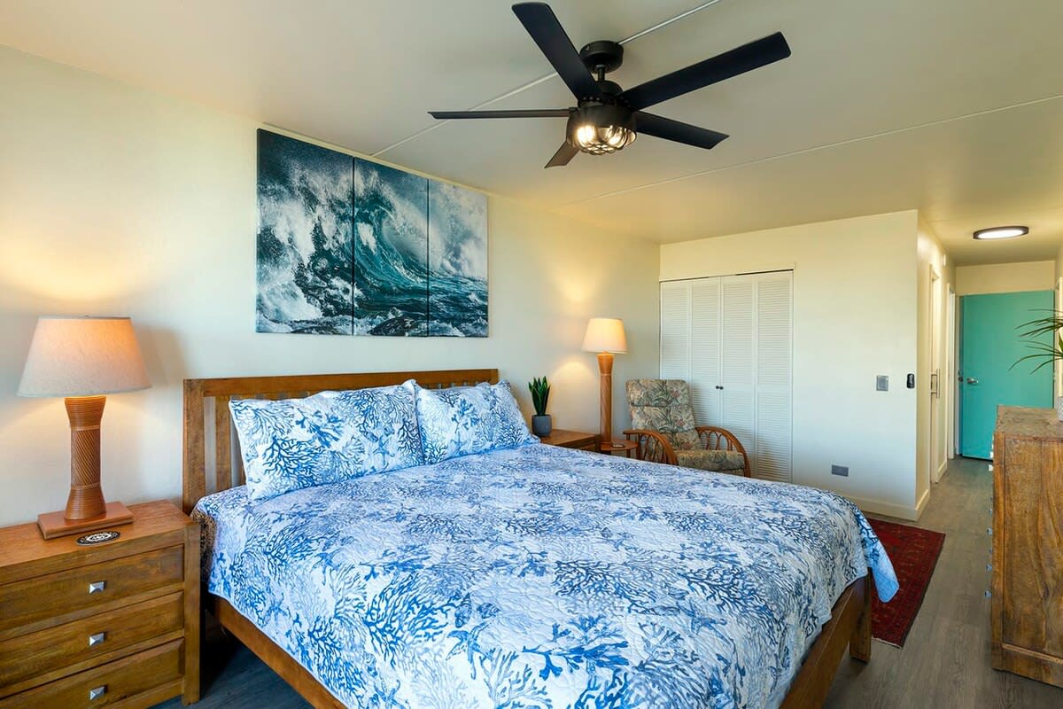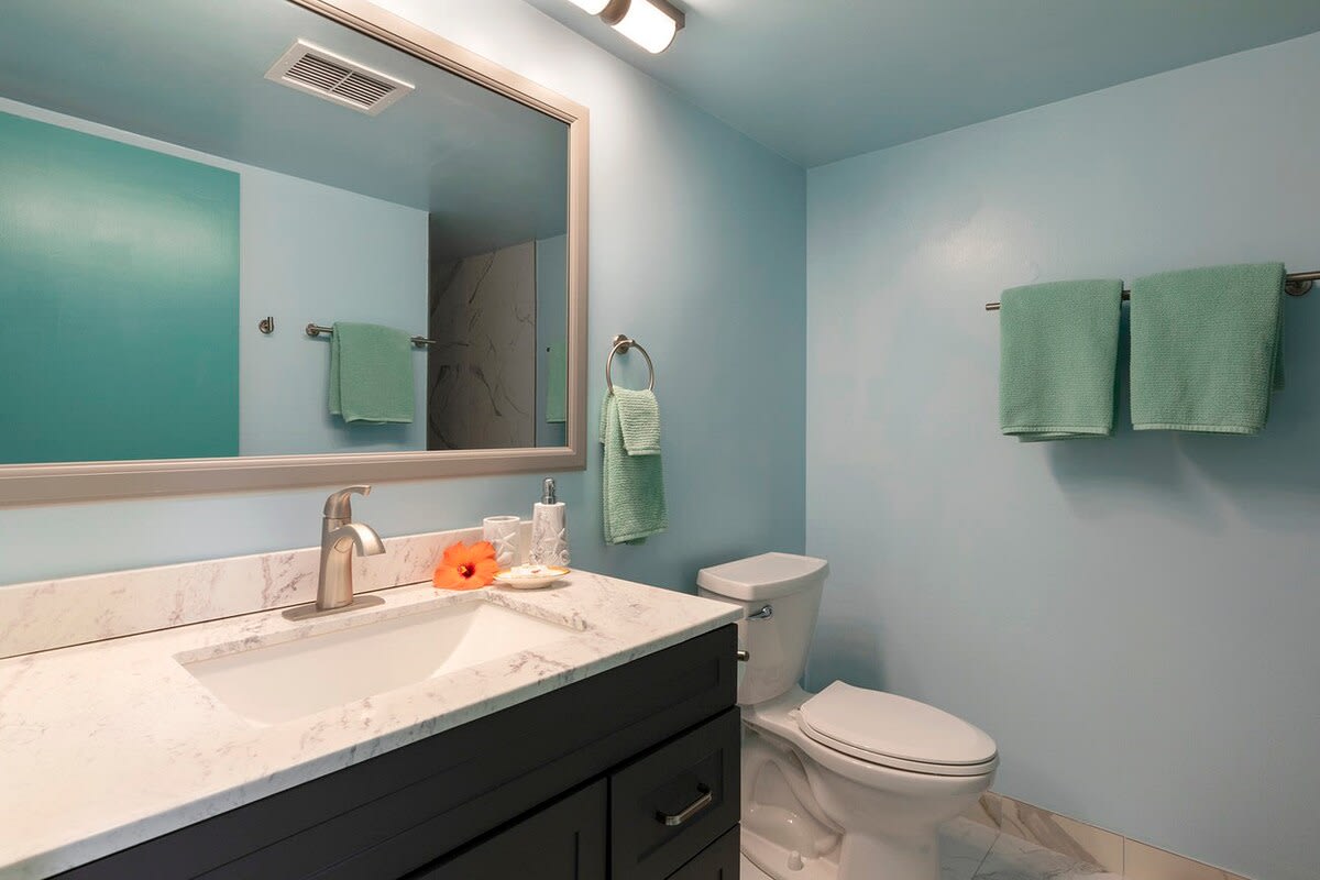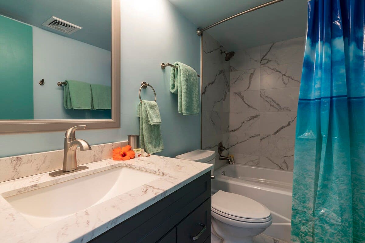 The master bedroom is furnished with a King-sized bed and 42' flat screen TV. A private bathroom is attached with a shower and tub combo. The second bedroom has 2 Twin-sized beds placed together to make a King-sized bed. This room has a TV and private bathroom as well.