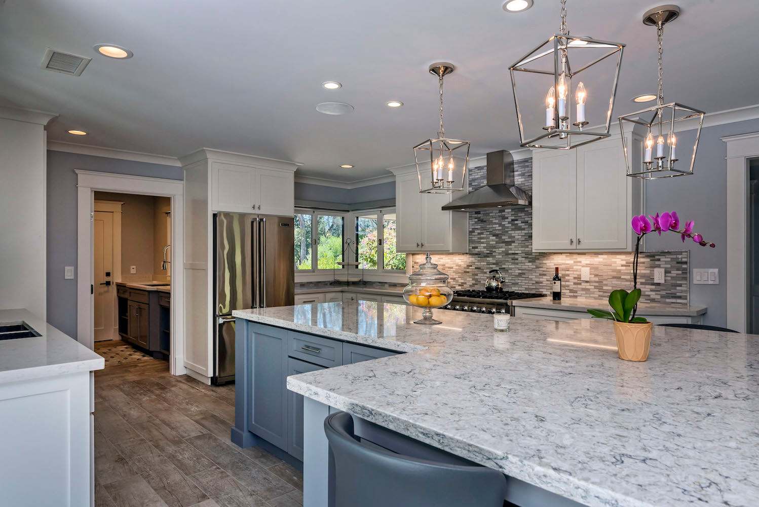 Past the living room and sitting area is a beautifully designed kitchen. A chef will truly be in heaven using the updated stainless steel appliances and marble countertops. Whip up scrumptious snacks and mouthwatering meals for everyone to enjoy. In addition to these FIVE seats, there is an OUTSIDE dining table with seating for eight.