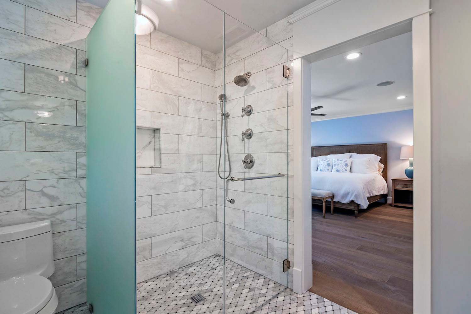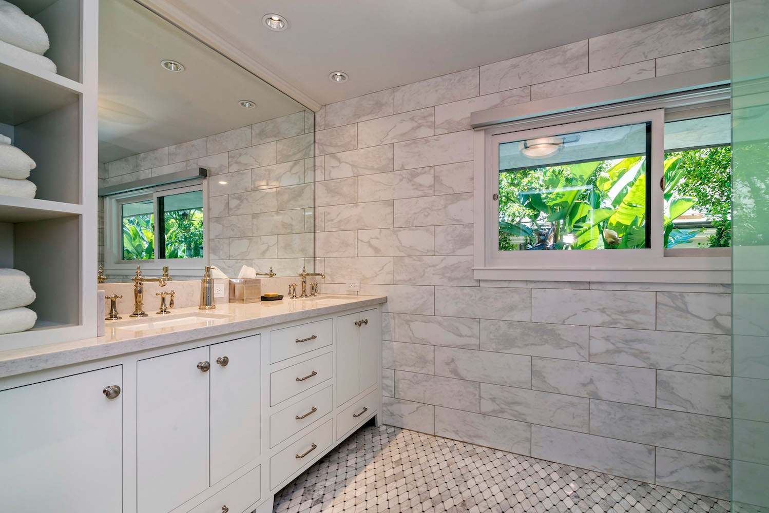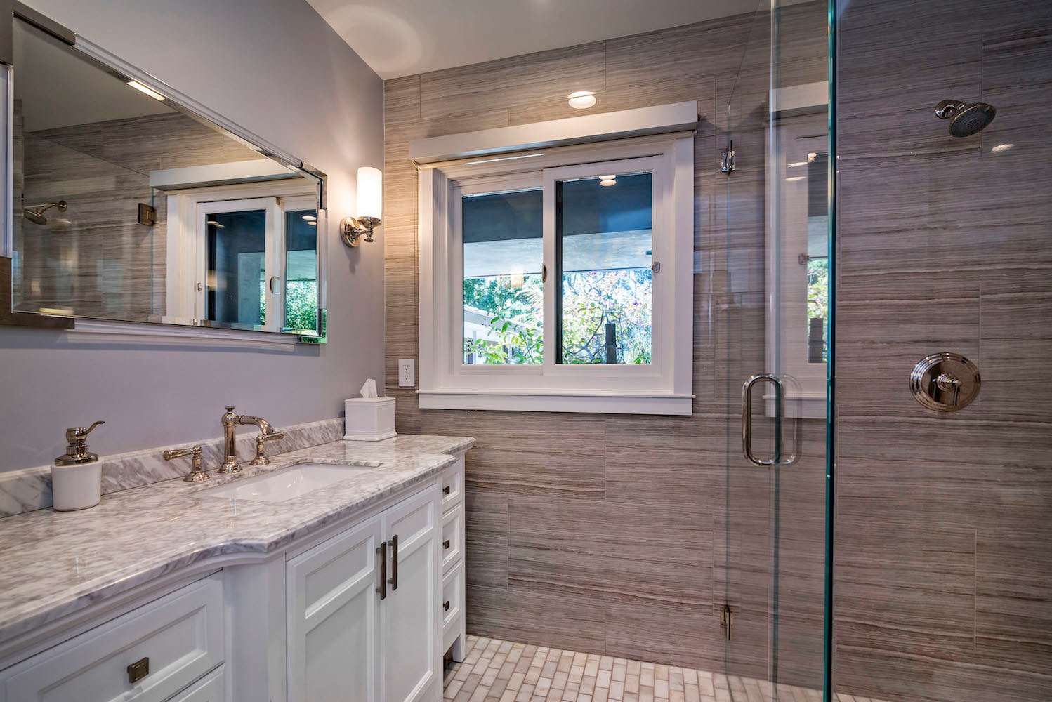 When you are ready to retire for the evening and receive a good night's rest, there are three bedrooms. The lavish master bedroom is furnished with a King-size bed, has doors to the back patio, and has an ensuite master bathroom. The master bathroom is spa-worthy with a walk-in shower, dual sinks, and marble tiling. The first guest bedroom holds a Queen-size bed and has doors leading to the side of the home. The second guest bedroom similarly has a Queen-size bed. A guest bathroom with a walk-in shower can be found in the hallway between these bedrooms.
