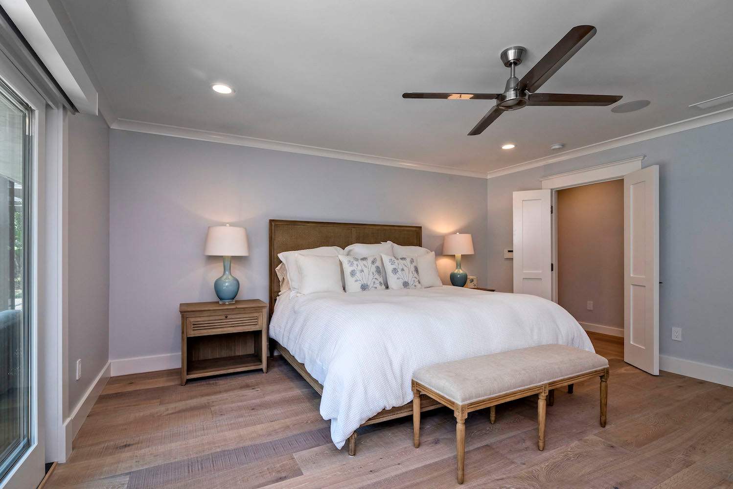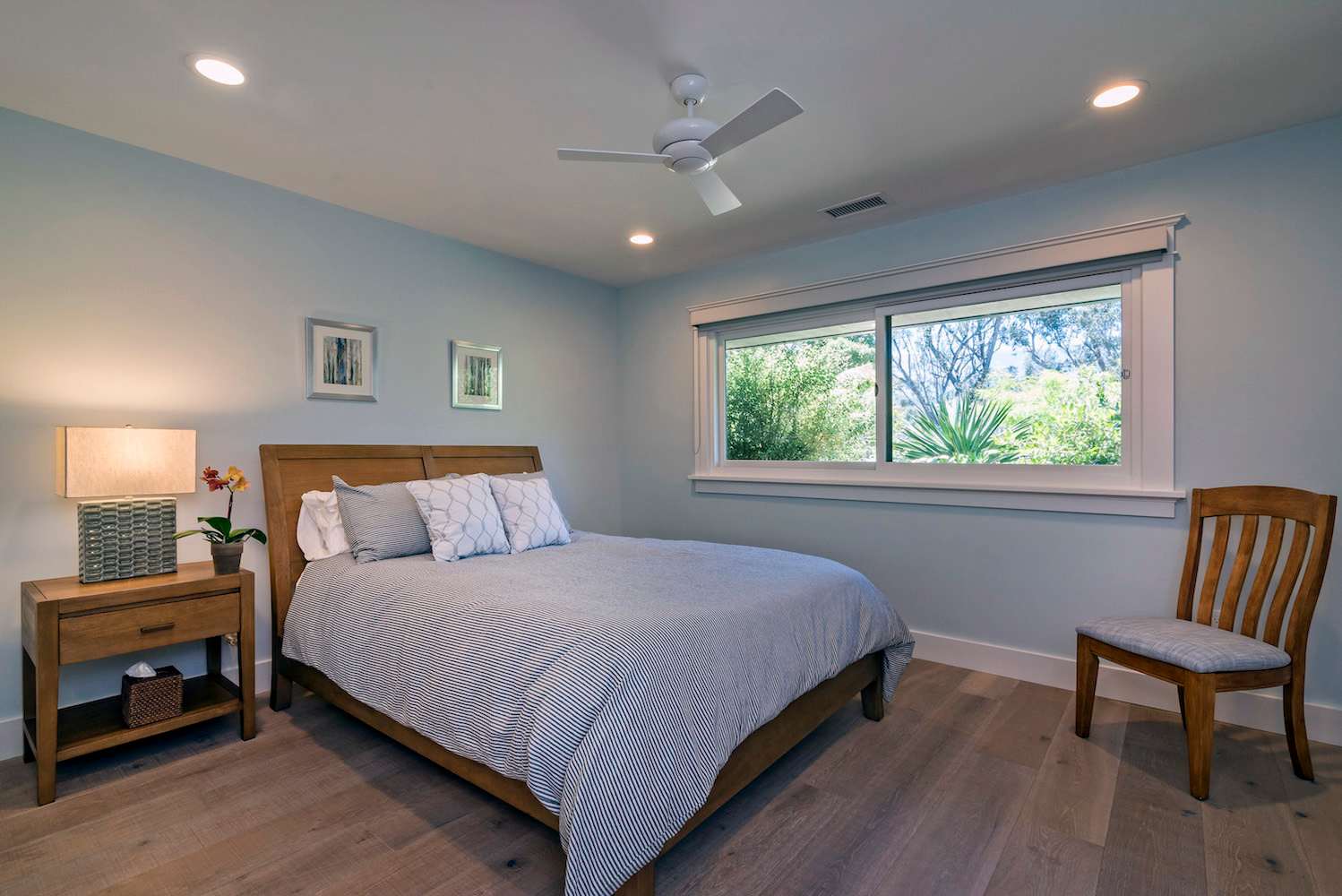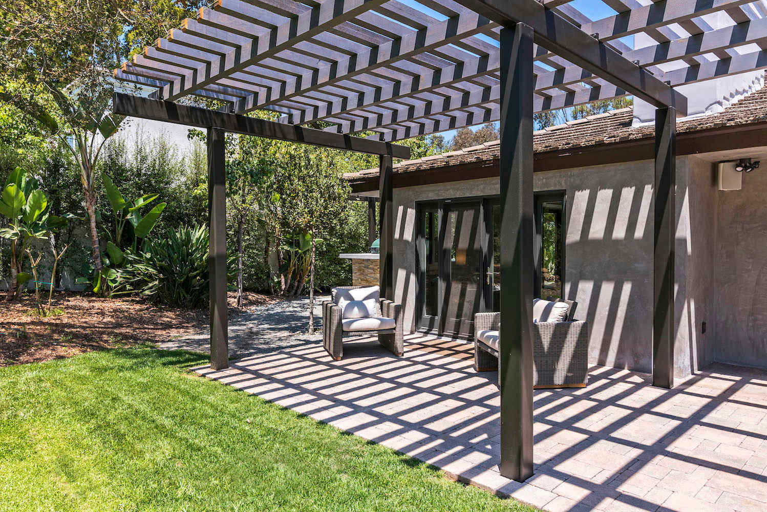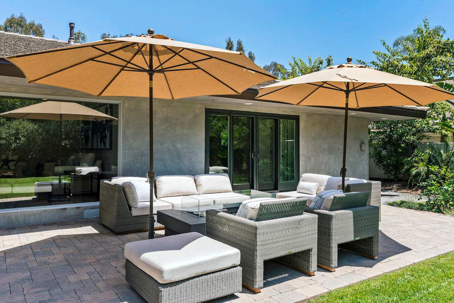 One of the best features of Modern Serenity is the sprawling backyard and patio. The fenced in backyard is landscaped with lush plants and an ample amount of grass space. This area is ideal for the kids to run around freely or to relax and bask in the sun. The patio is arranged with outdoor lounge seating gathered around a fit pit. Spend nights out here chatting over the fire creating unforgettable memories.