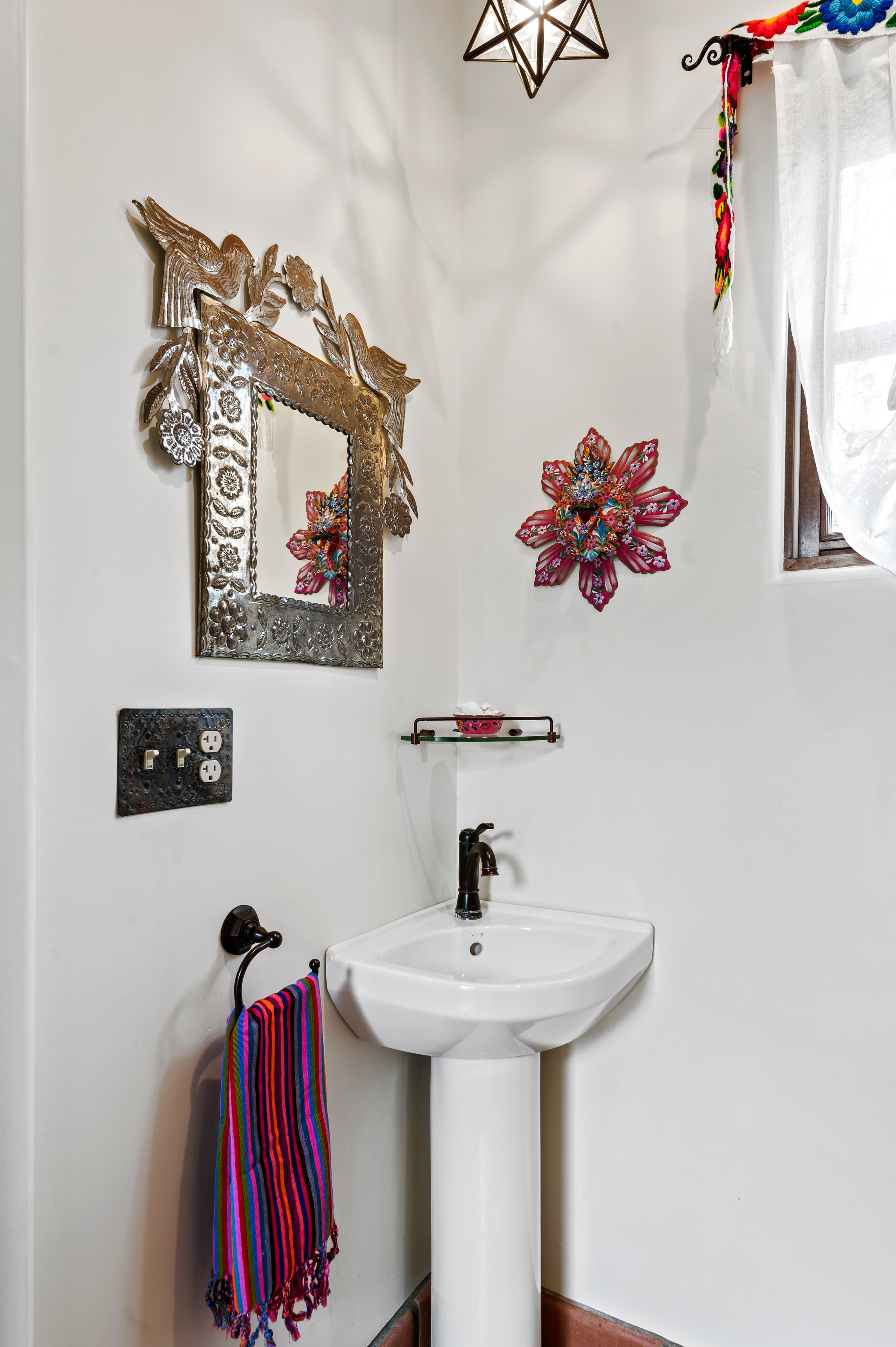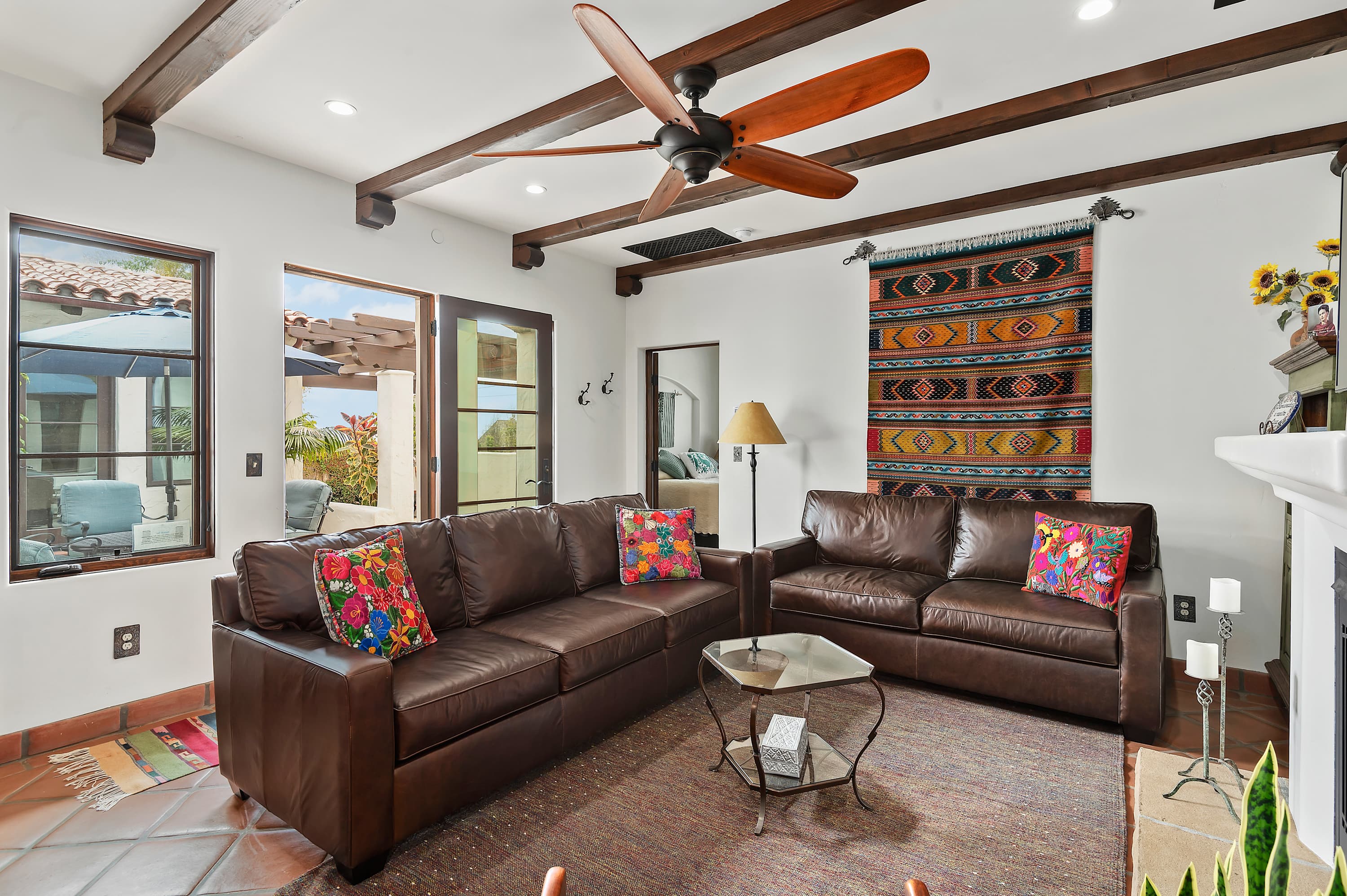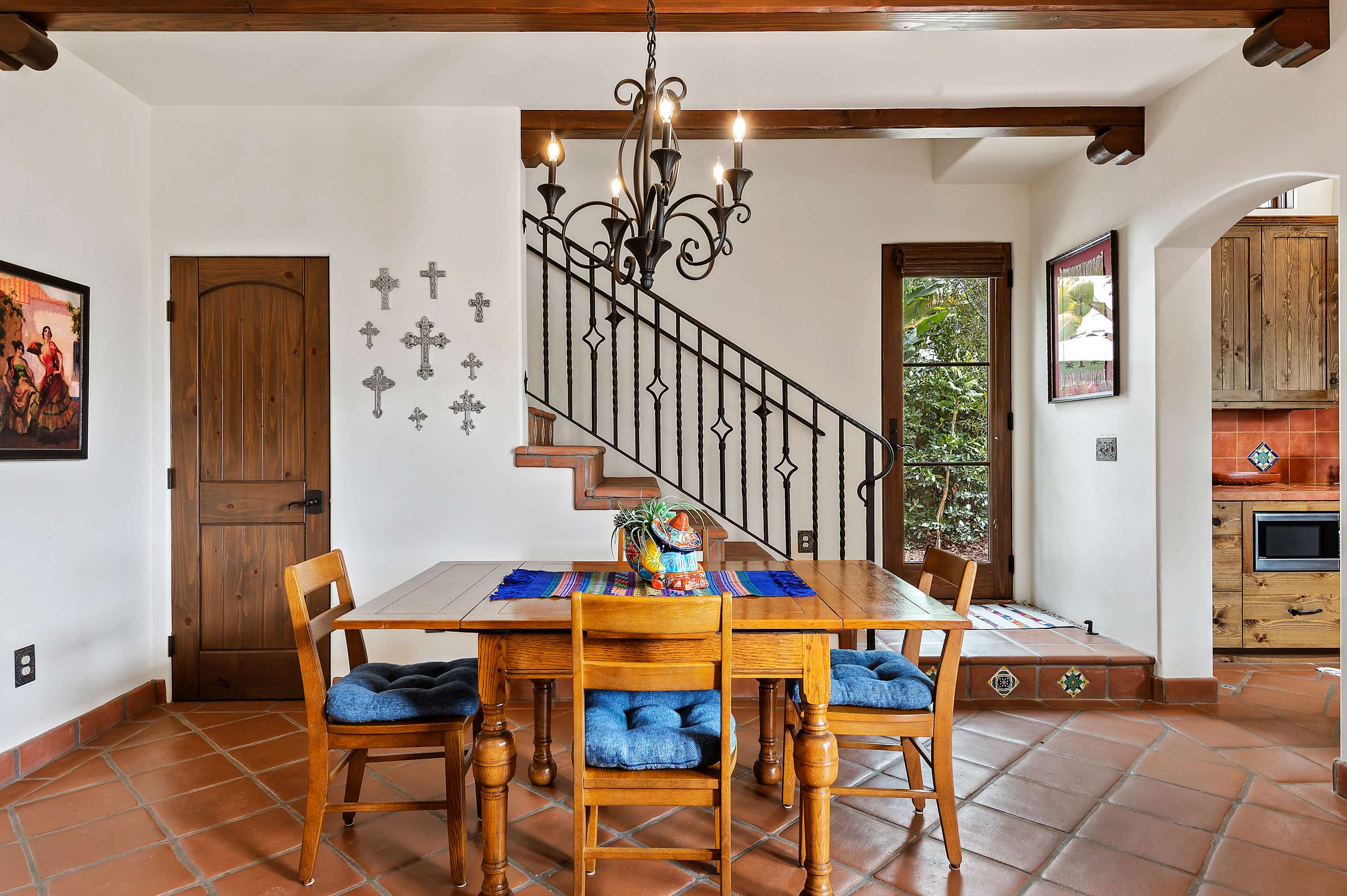 Spanish-inspired motifs and tiling run throughout the home creating a fun fiesta ambiance. Guests enter into the colorful living and dining area. This common living space seamlessly connects the living room, kitchen, and dining area. The living room is furnished with comfortable seating arranged around a fireplace and mounted flat screen TV. As the coastal breeze picks up at night, light a fire and get cozy on the couch. WIFI is provided for your entertainment. A washer and dryer are conveniently tucked away great for any wet swimsuits after a trip to the beach.
