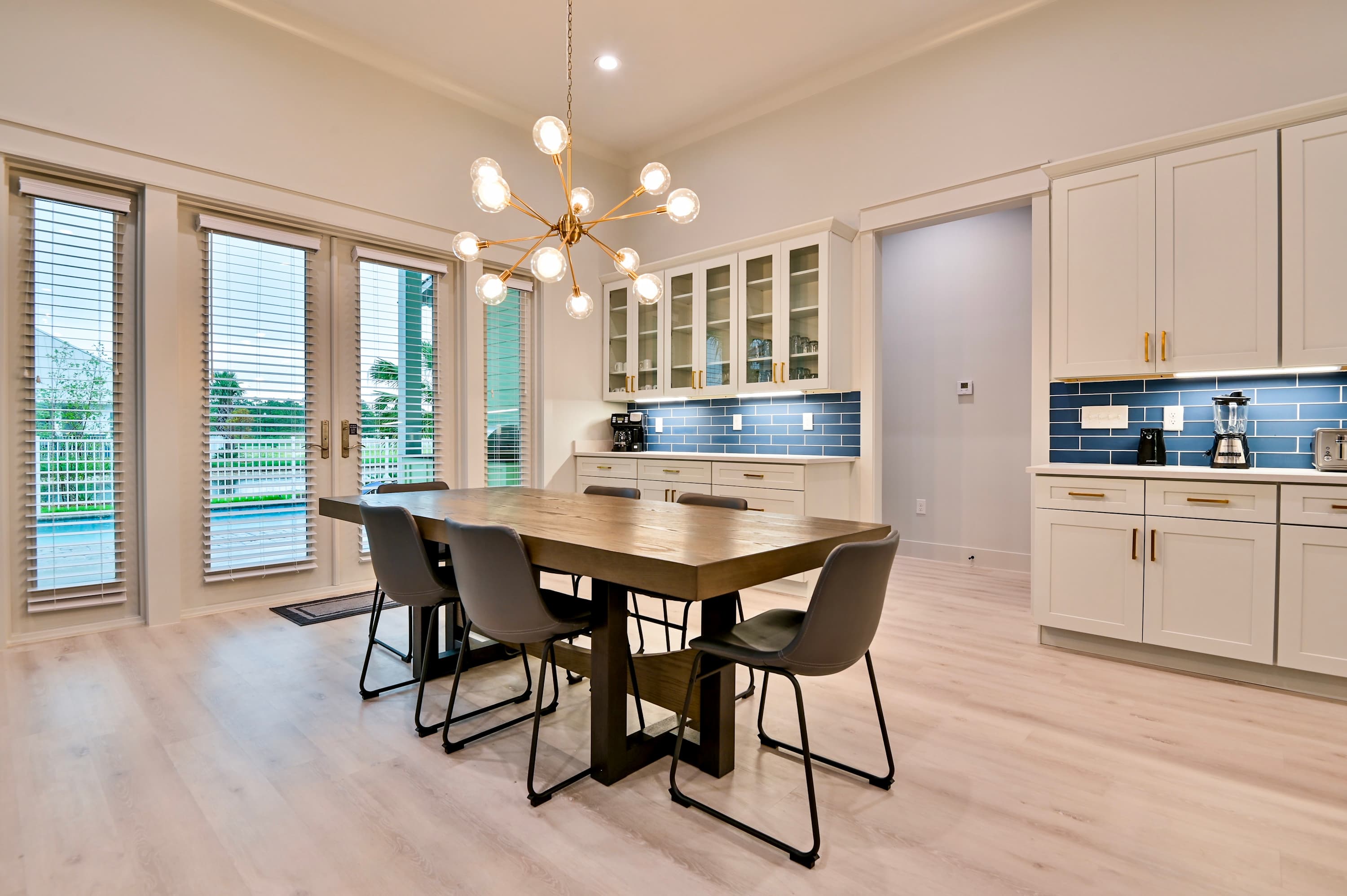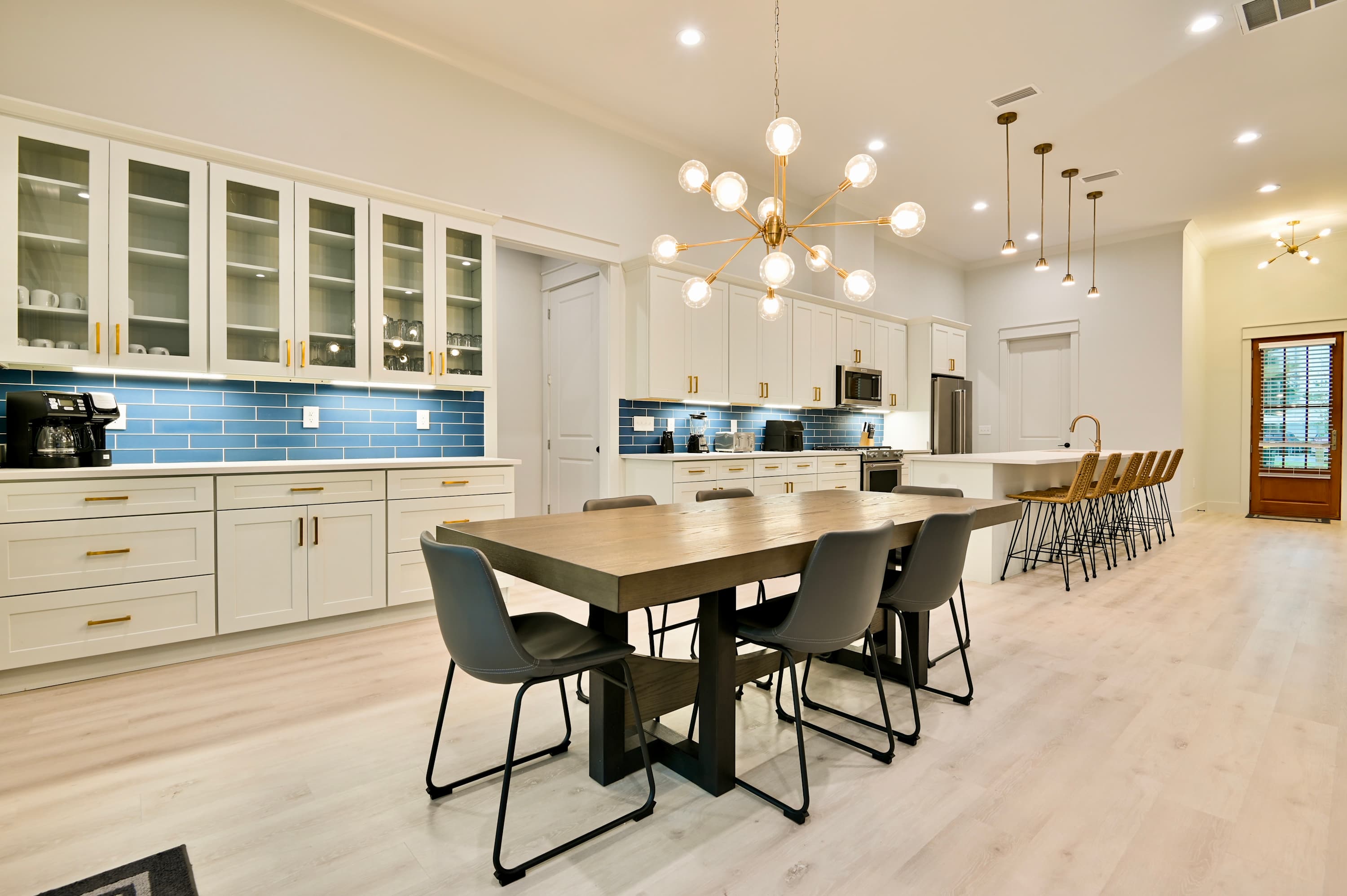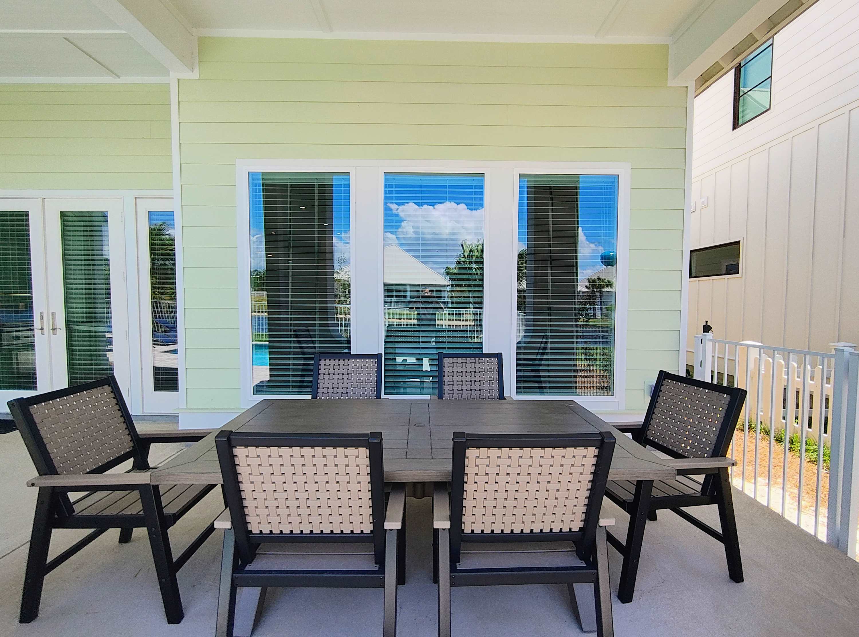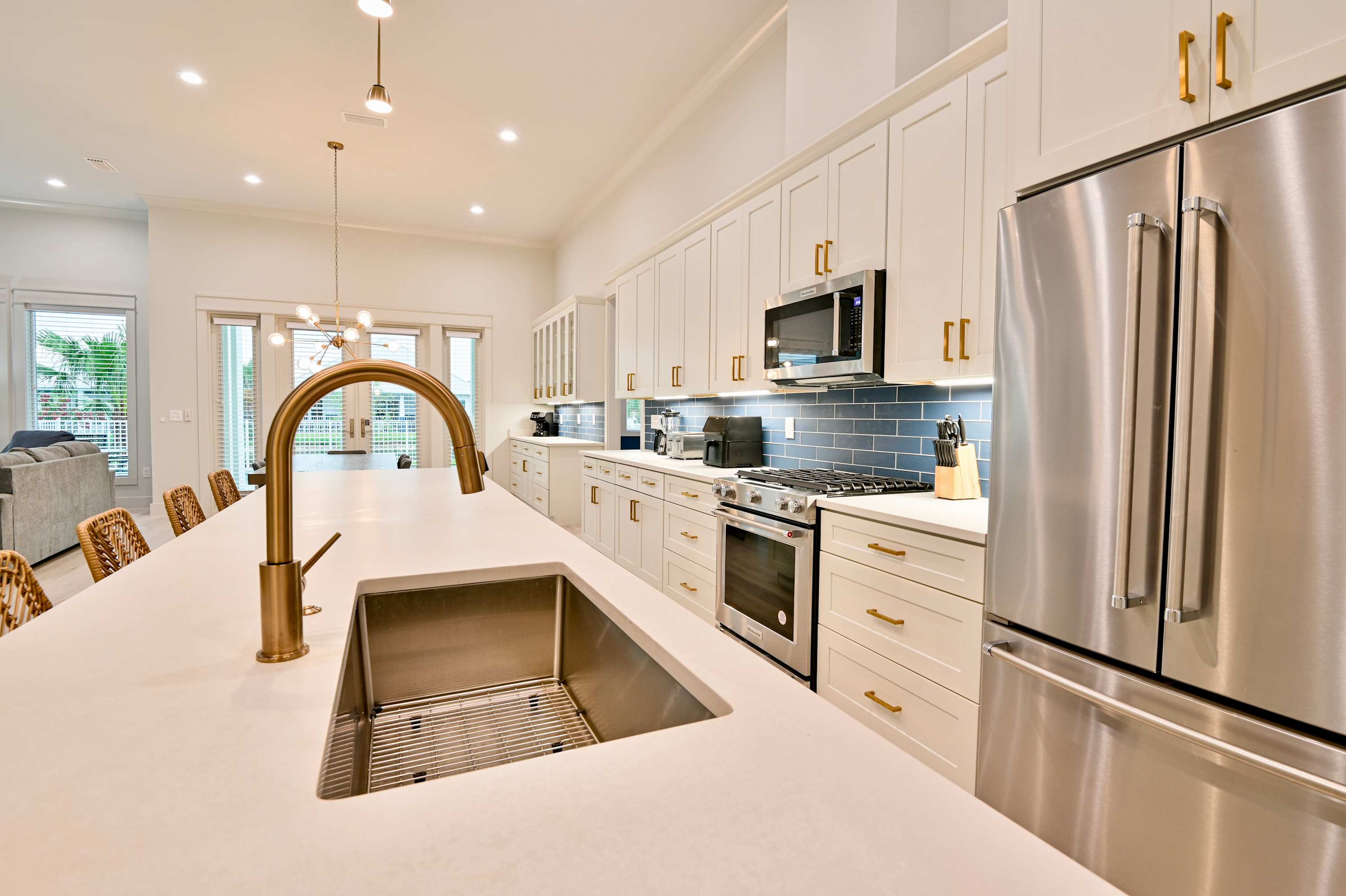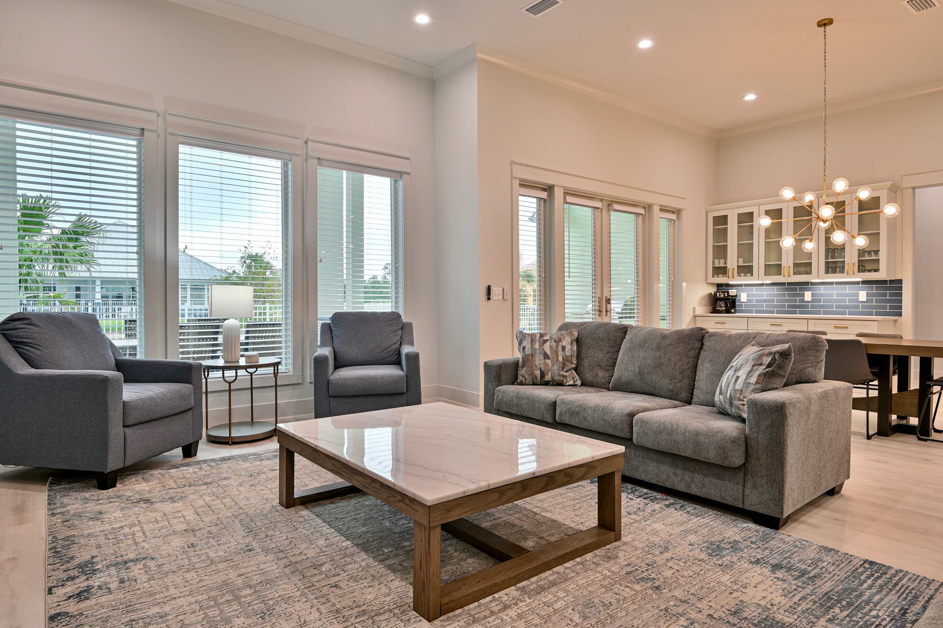 The home itself leaves nothing to be desired, from the bright and modern interior to the picturesque exterior both providing spaces primed for connectivity and entertainment. Have a refreshing swim in the glittering inground pool and catch some plentiful Alabama rays while you lounge on the spacious back patio or fire up the grill and enjoy a meal or two al fresco under the cooler, covered area, a built-in fan keeping the coastal air circulating around you. As you step inside, you’ll be greeted by stylish indoor spaces expertly curated with contemporary furnishings and sophisticated décor. Tall ceilings sit atop plush sofa and armchair seating in the living room, an ideal spot for kicking up your feat to stream all your favorite entertainment on the smart TV. The sparkling kitchen showcases stainless steel appliances, sleek stone countertops, and ample cabinetry stocked with cookware and dining ware. Dine together at the formal table with seating for 8 or keep things casual at the island with high-top stool seating for 6.