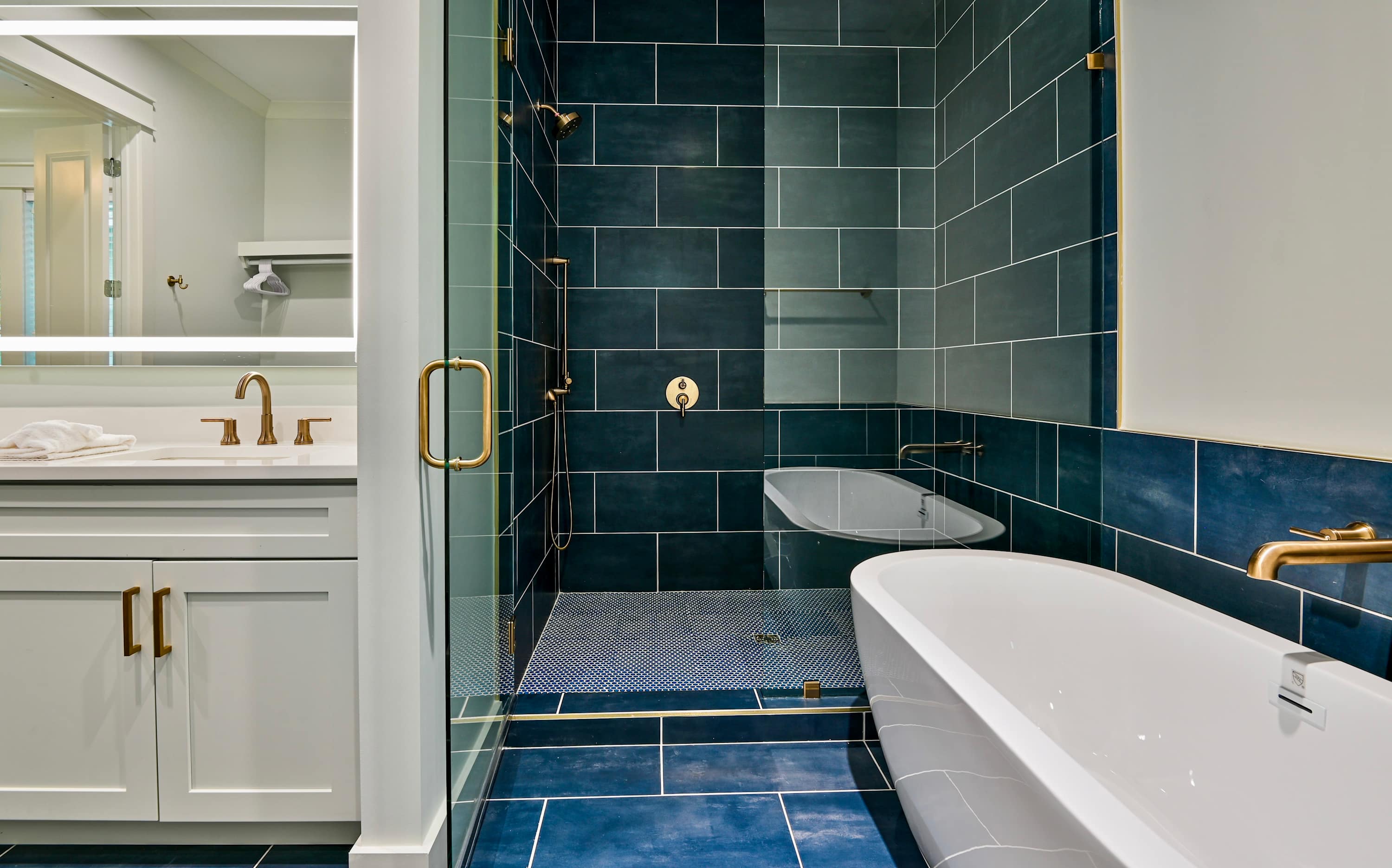 Bedroom #4 includes a king size bed, smart TV, and ensuite bathroom with a dual vanity and soaking tub/walk-in shower combo.