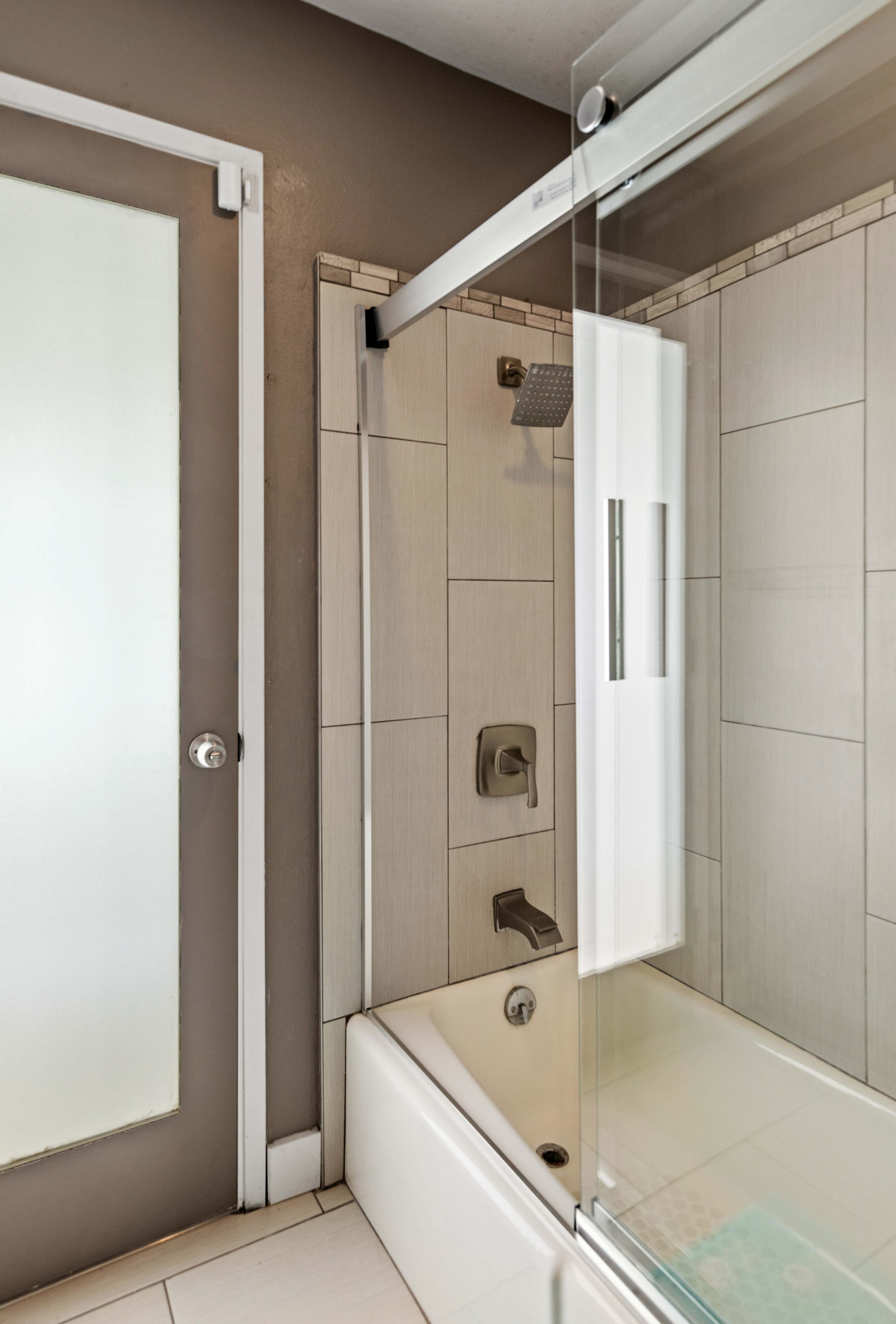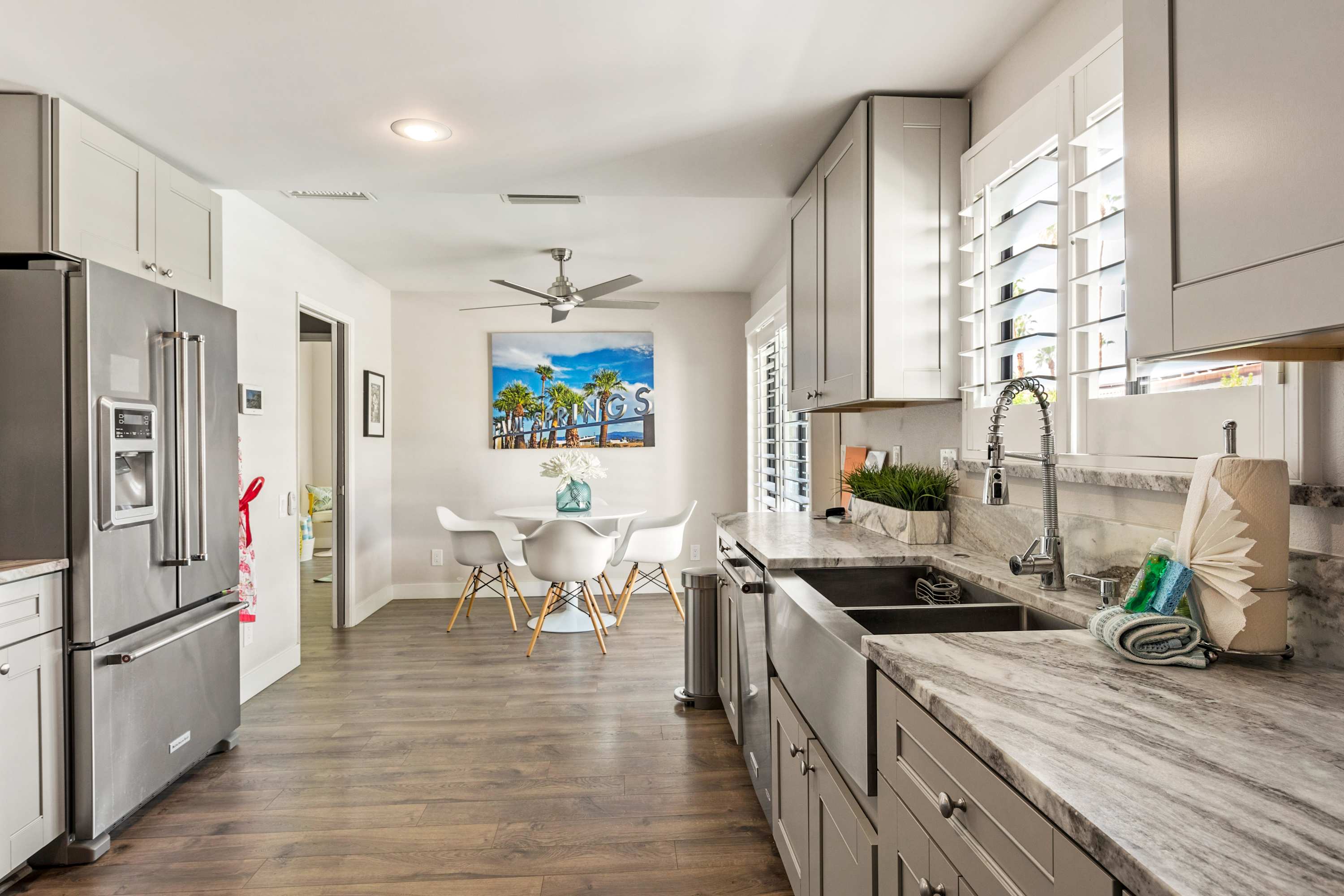 The home’s modern kitchen is fully equipped with standard steel appliances, coffee maker, toaster, and breakfast nook. You’ll have all the space and tools needed for quick snacks and inspired meals made at home.