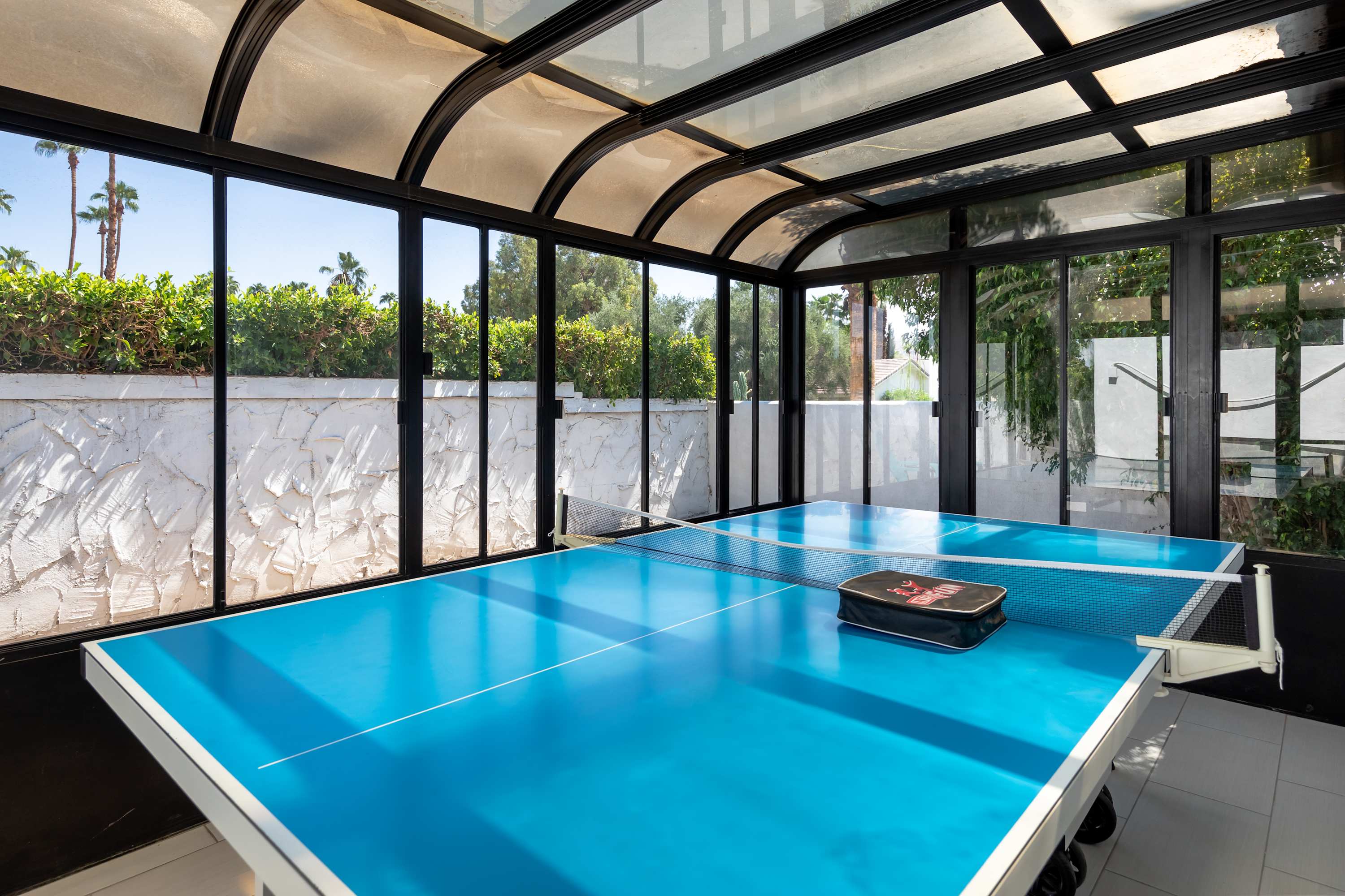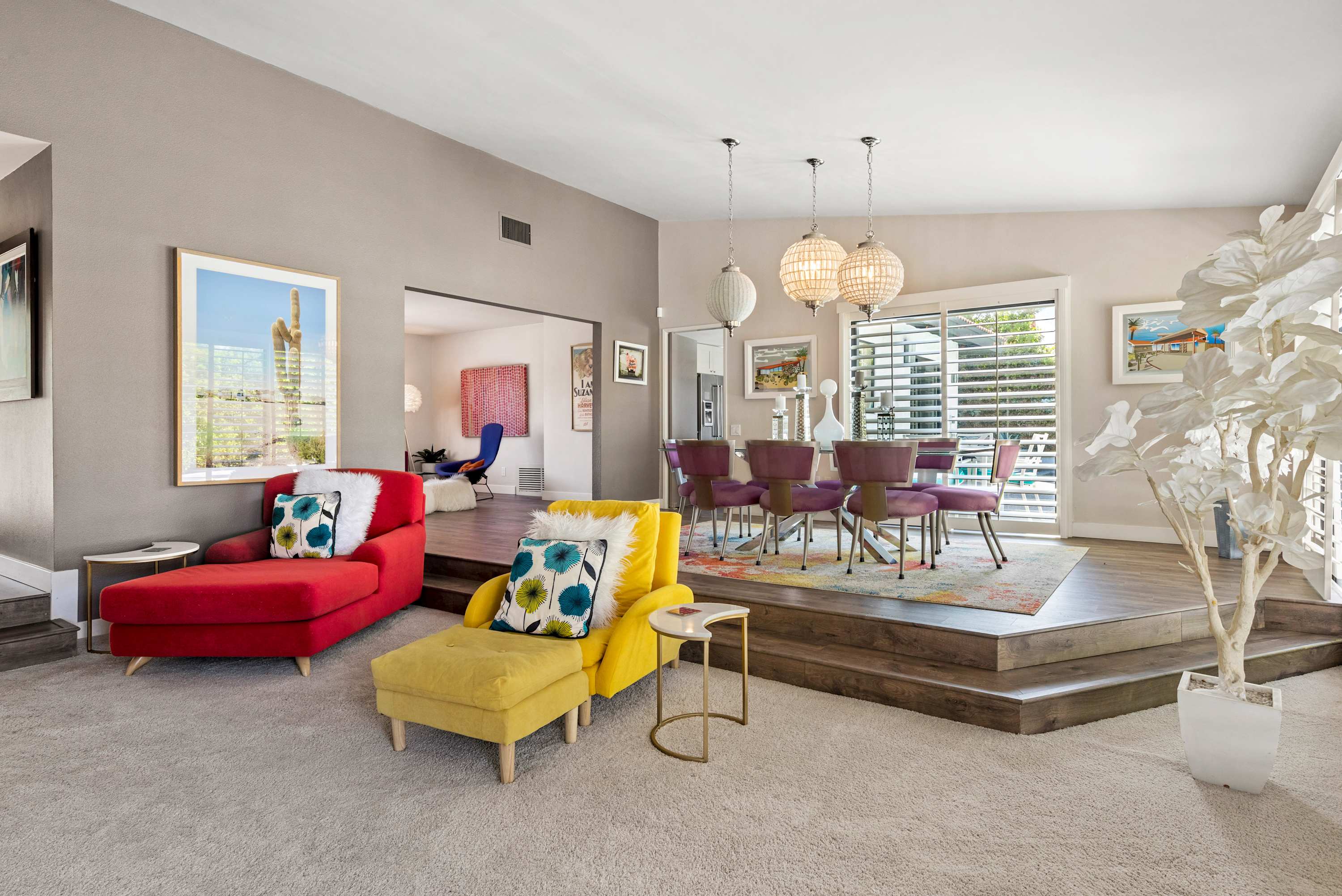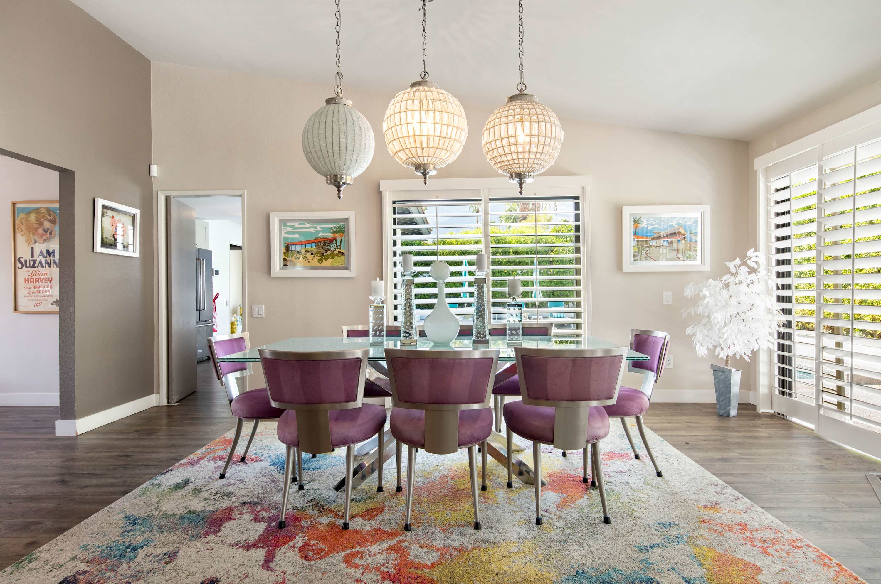 Inside, each room is as fun as the next, making it difficult to choose a favorite place to spend indoor leisure time. The art-filled, formal sitting room offers a more private place to relax and visit while the open living space has plush couches, smart tv, and an open flow into the dining area with purple, velvet seating for 8 under opulent lighting fixtures. When it comes time to play, head to the sunroom furnished with ping pong table, or hit the dedicated bar room with spacious bar, seating, and sliding glass door access to the pool area outside.