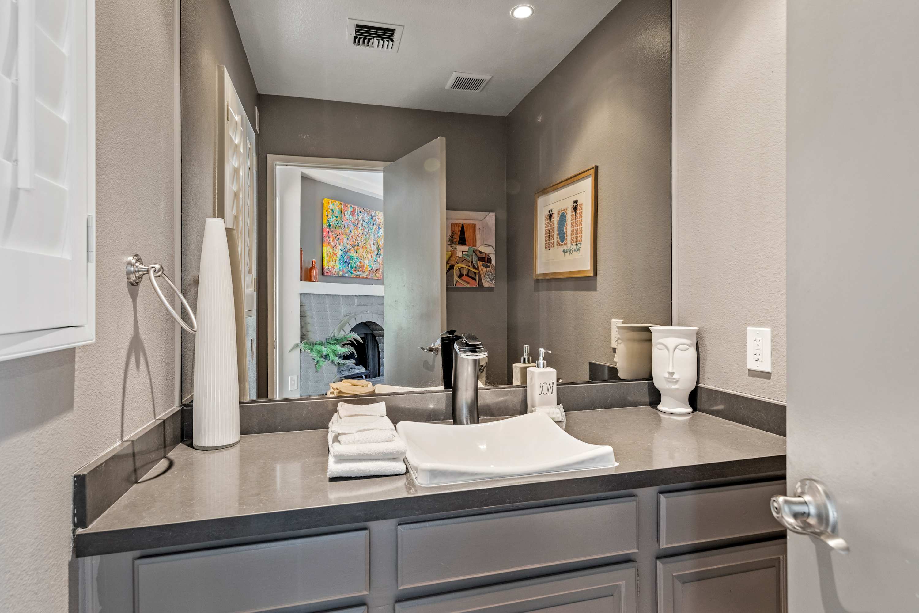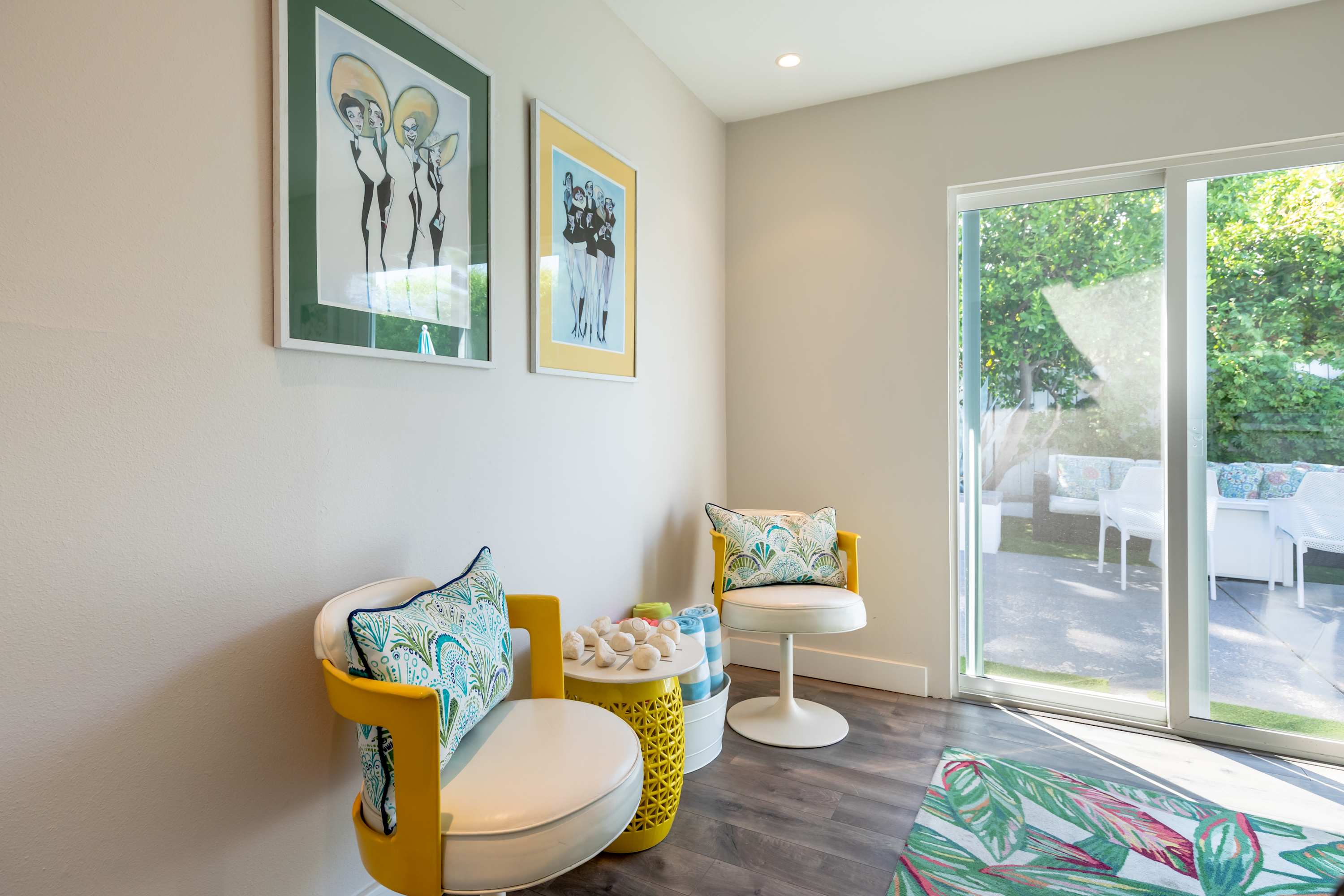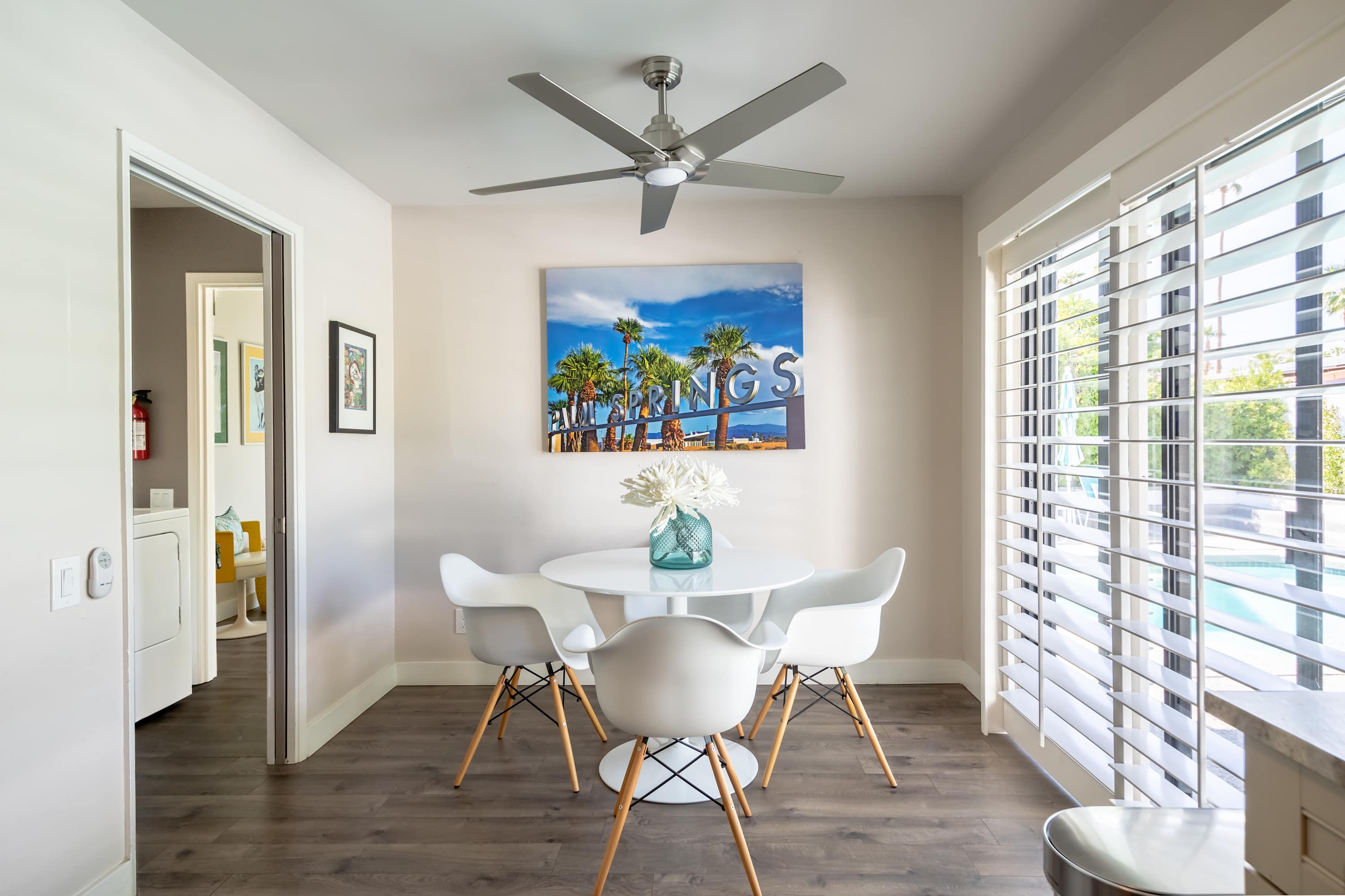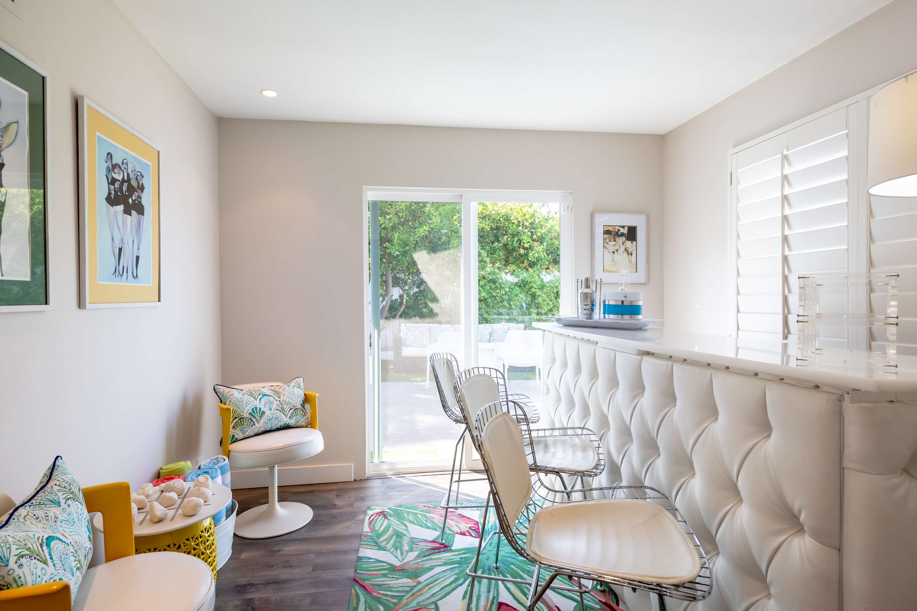 Inside, each room is as fun as the next, making it difficult to choose a favorite place to spend indoor leisure time. The art-filled, formal sitting room offers a more private place to relax and visit while the open living space has plush couches, smart tv, and an open flow into the dining area with purple, velvet seating for 8 under opulent lighting fixtures. When it comes time to play, head to the sunroom furnished with ping pong table, or hit the dedicated bar room with spacious bar, seating, and sliding glass door access to the pool area outside.
