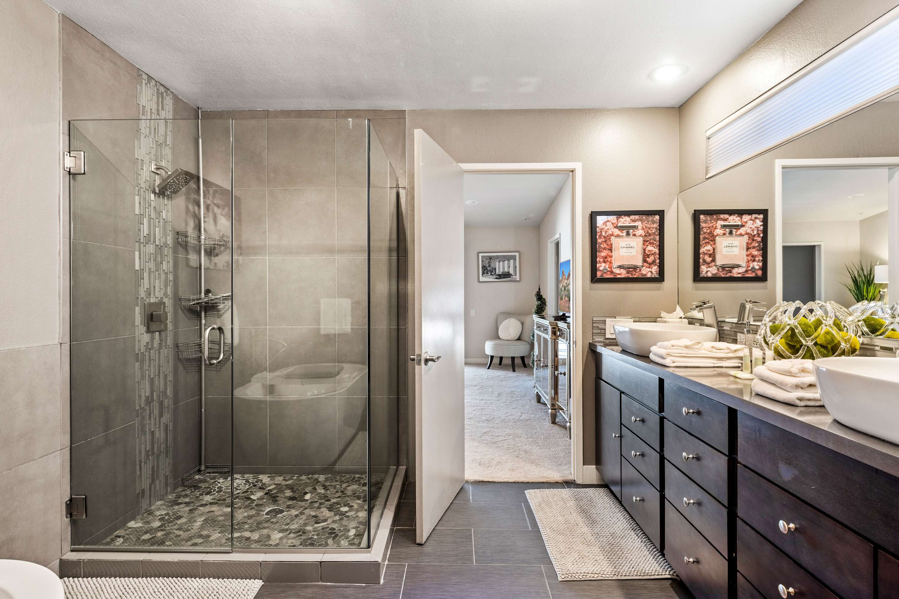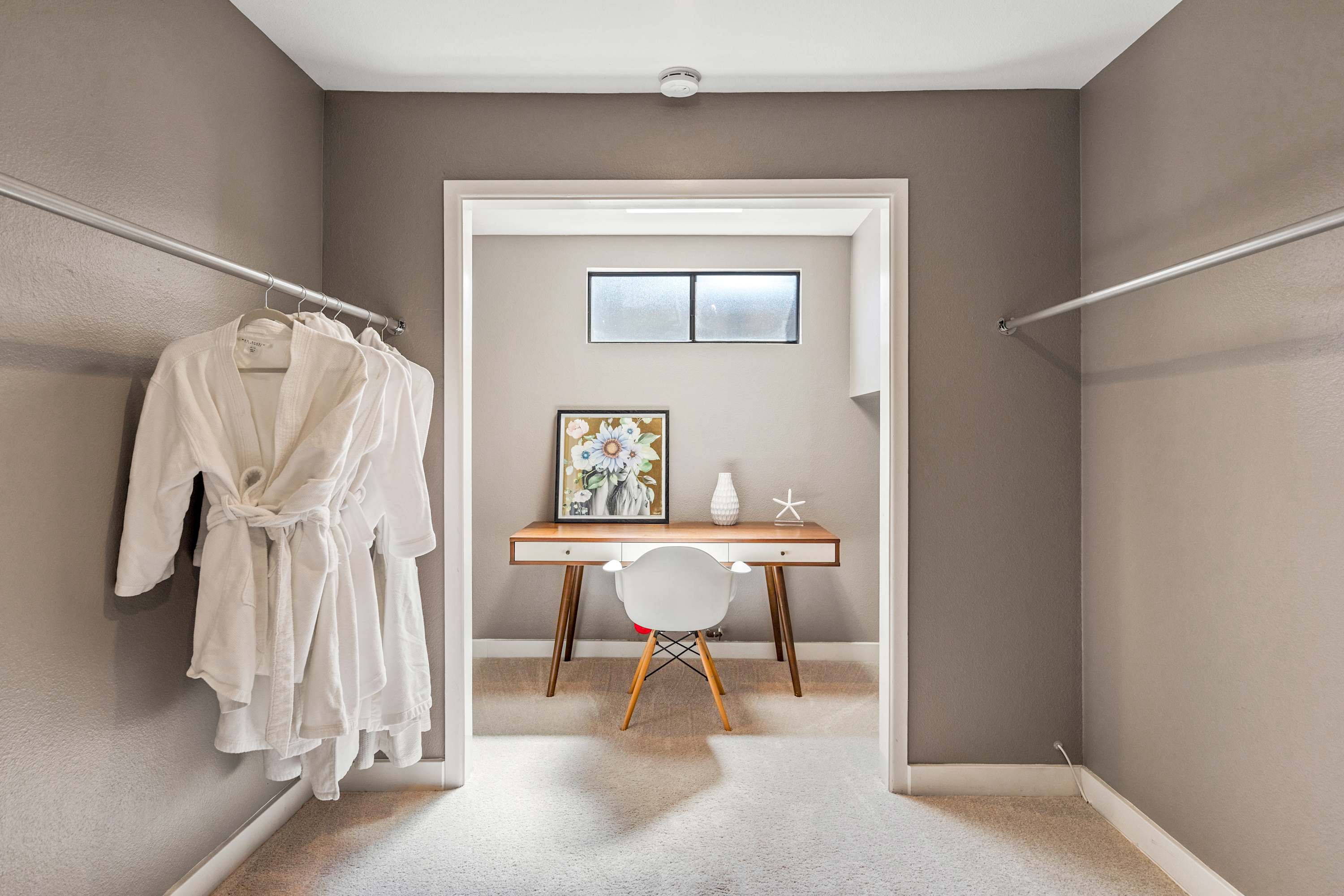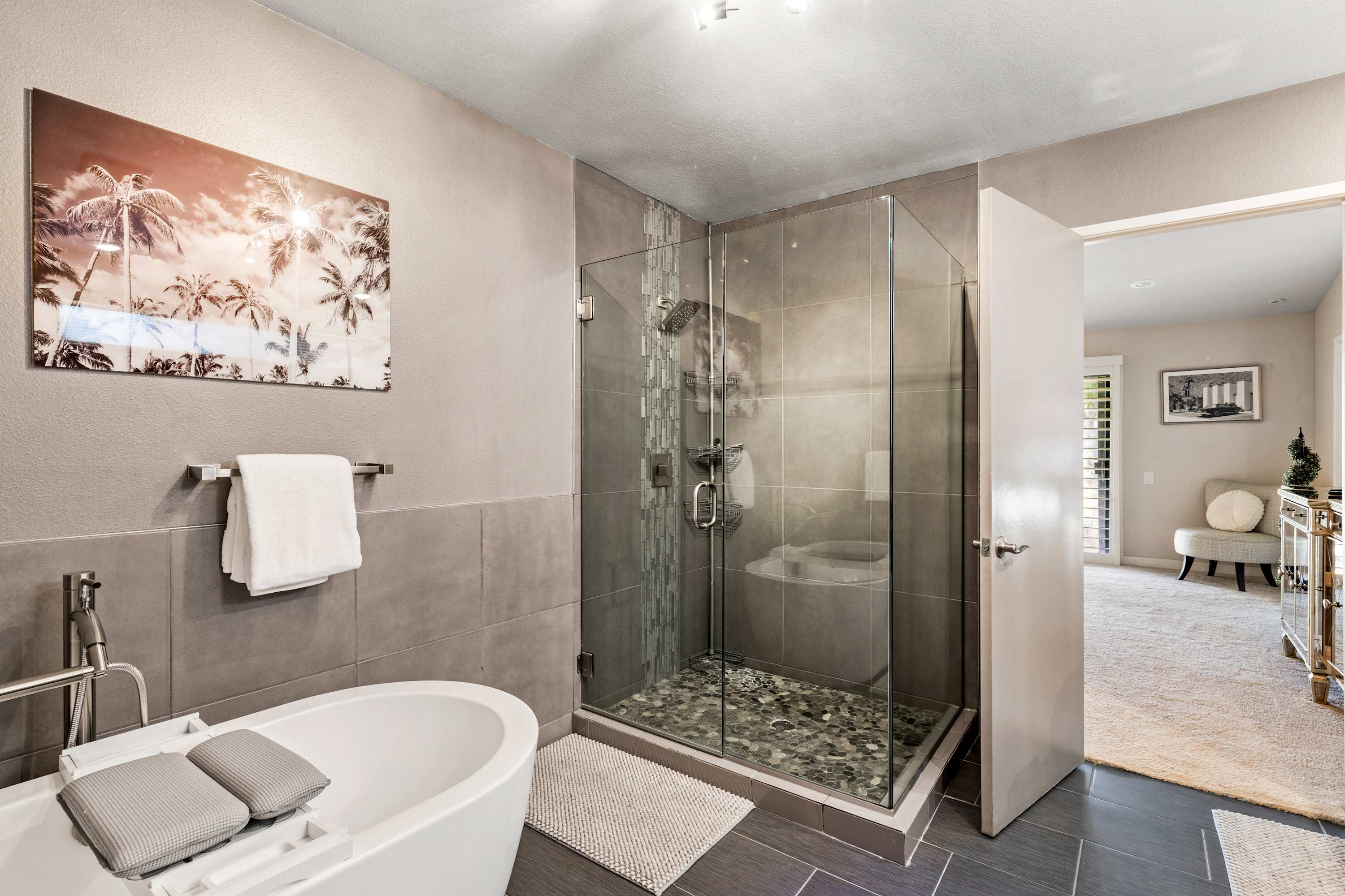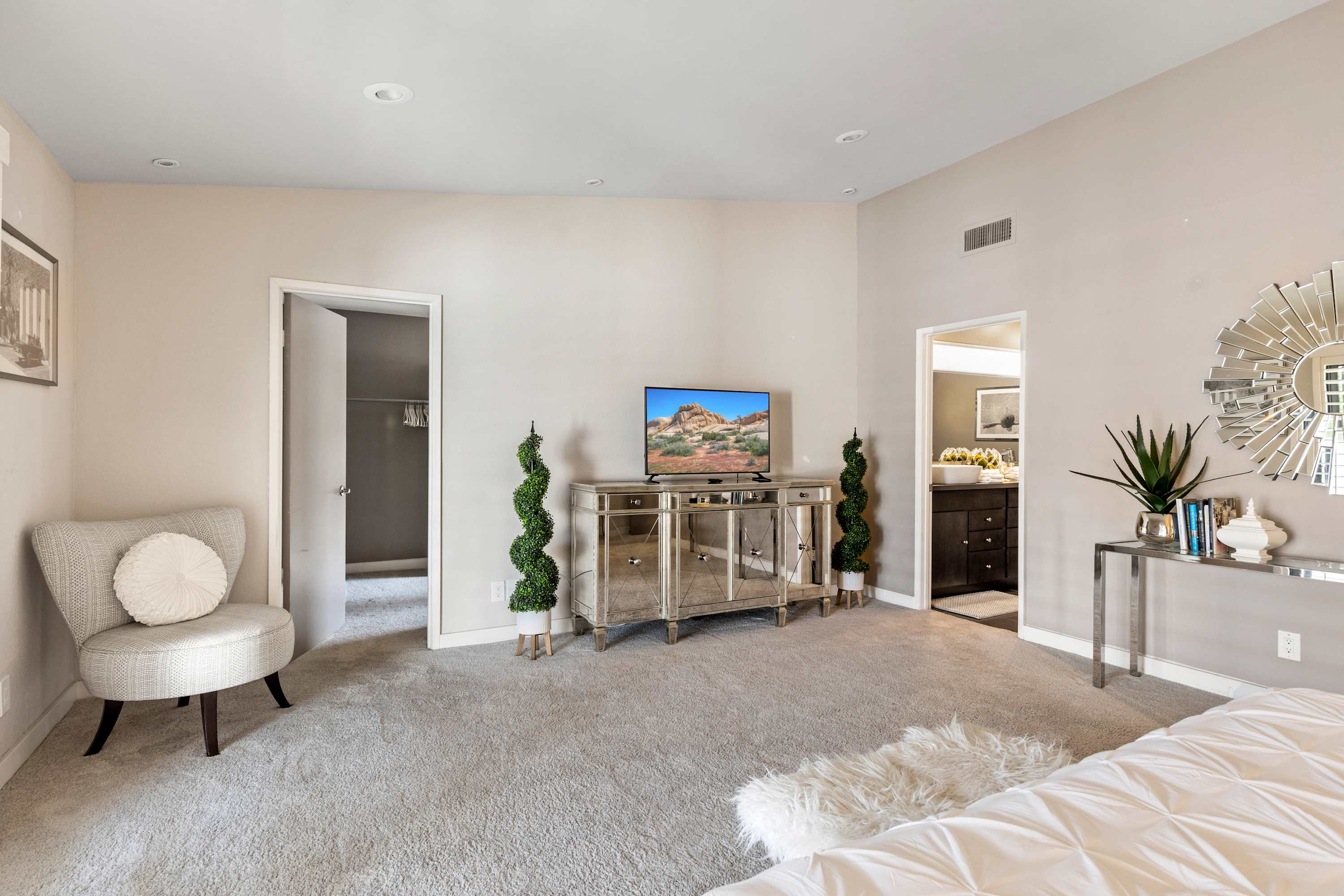 Bedroom #1 is the primary suite with king size bed, smart tv, and en-suite bathroom including dual sinks, freestanding tub, and walk-in shower. This suite also features a large closet with plenty of storage and dressing space. A secondary room off the back of the closet is furnished with a desk and chair for a quiet place to work.