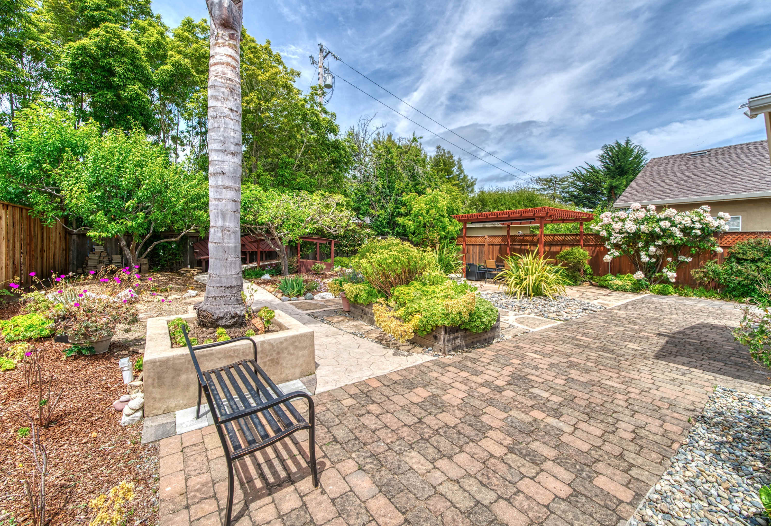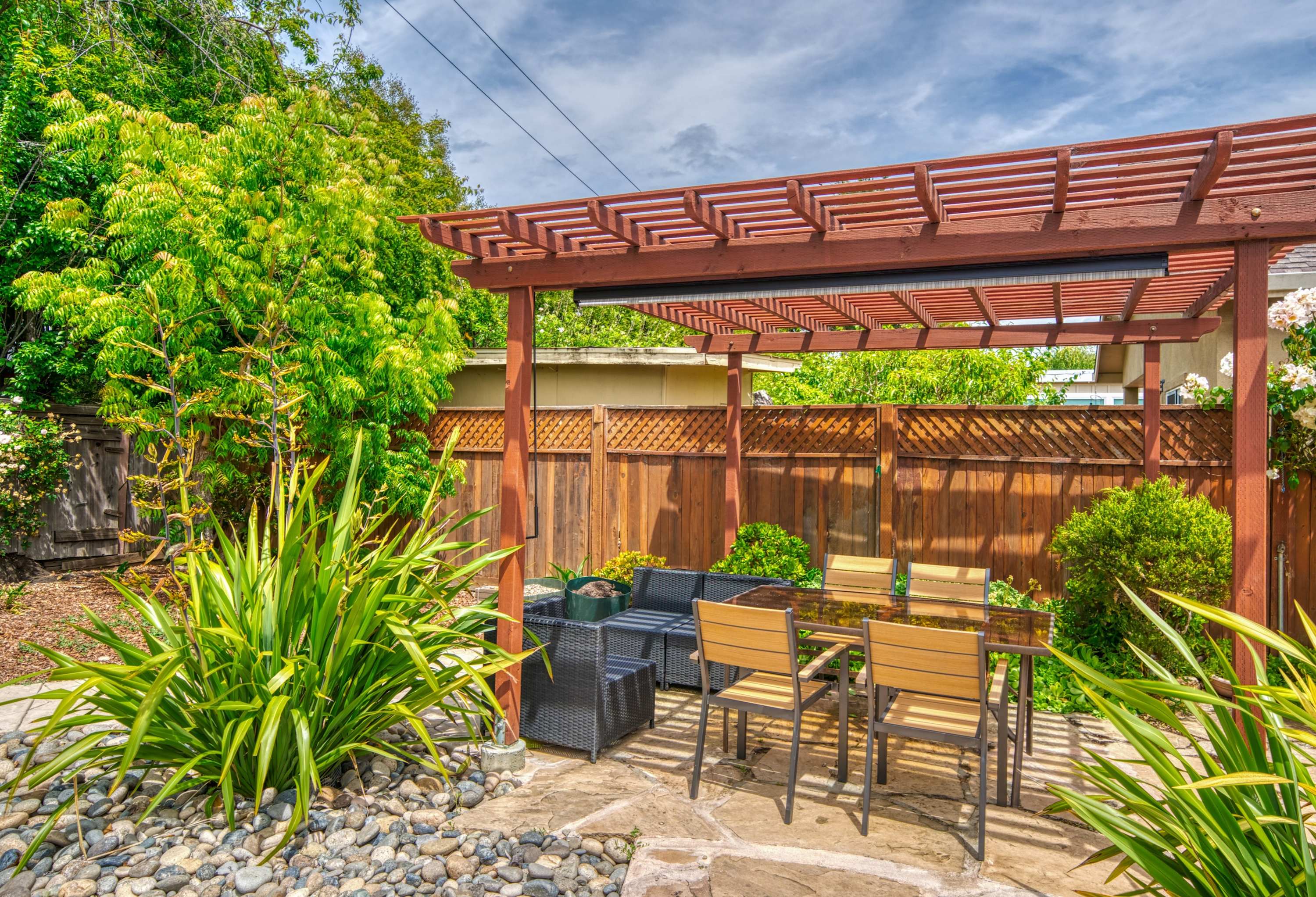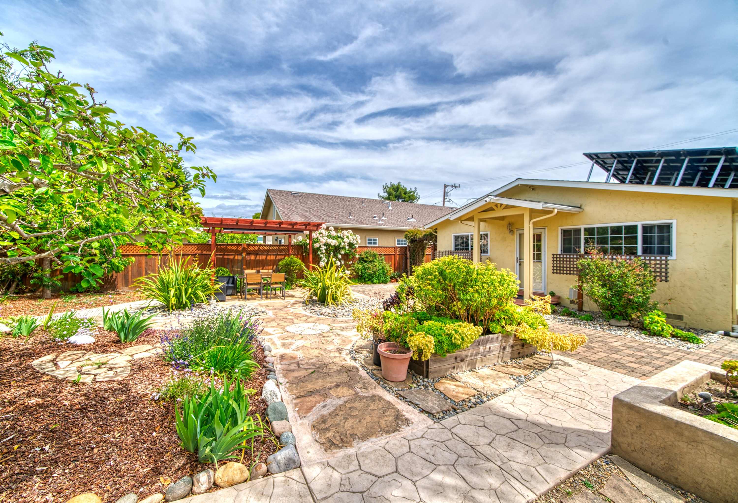 • Private Backyard Oasis: Native landscaping, 2 fruit trees, shaded pergola, outdoor dining, and golden-hour magic in the sunny “banana belt.”