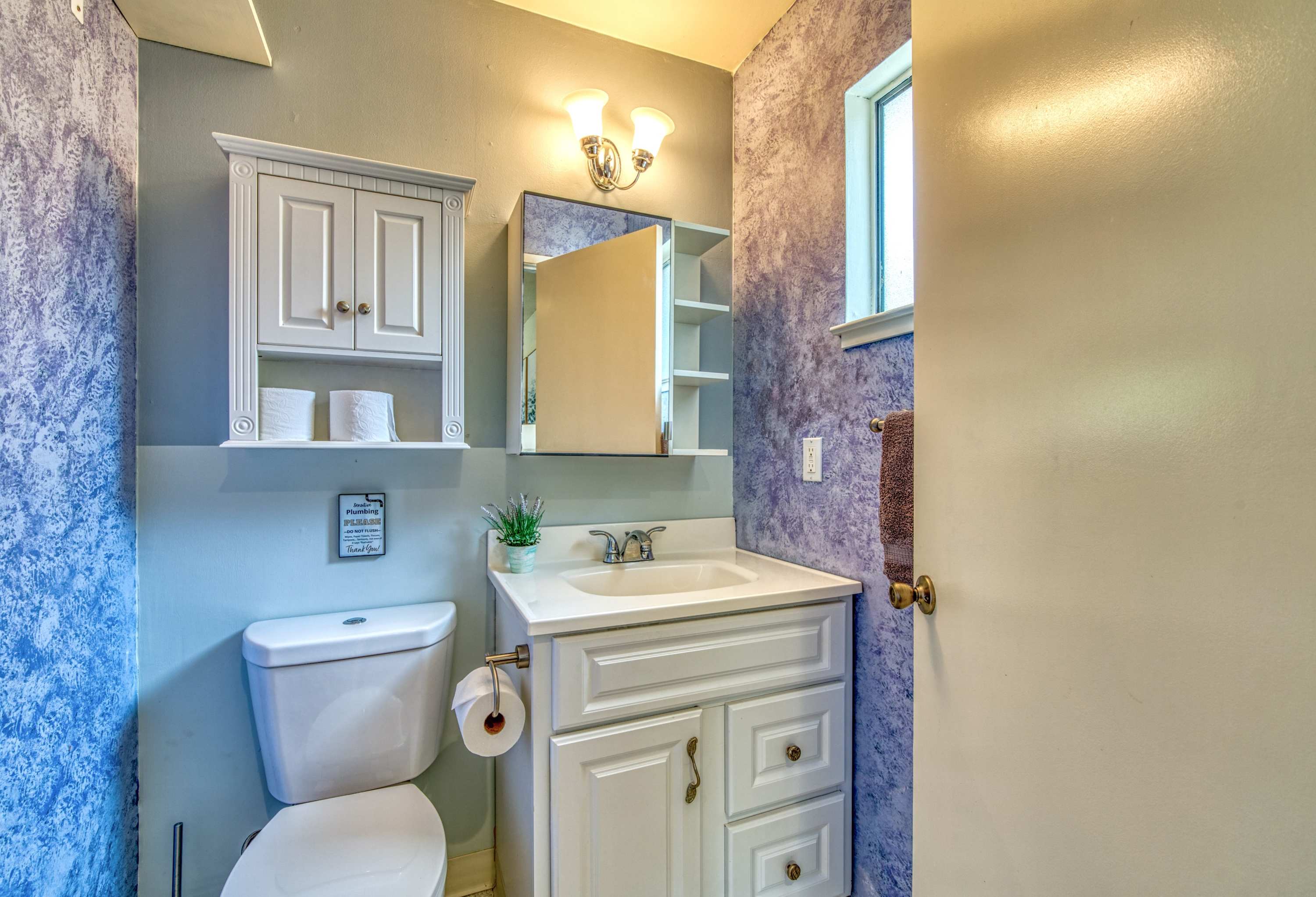 • Bedroom 1: King-sized Purple Luxury bed, feather comforter, smart TV, private half bath.