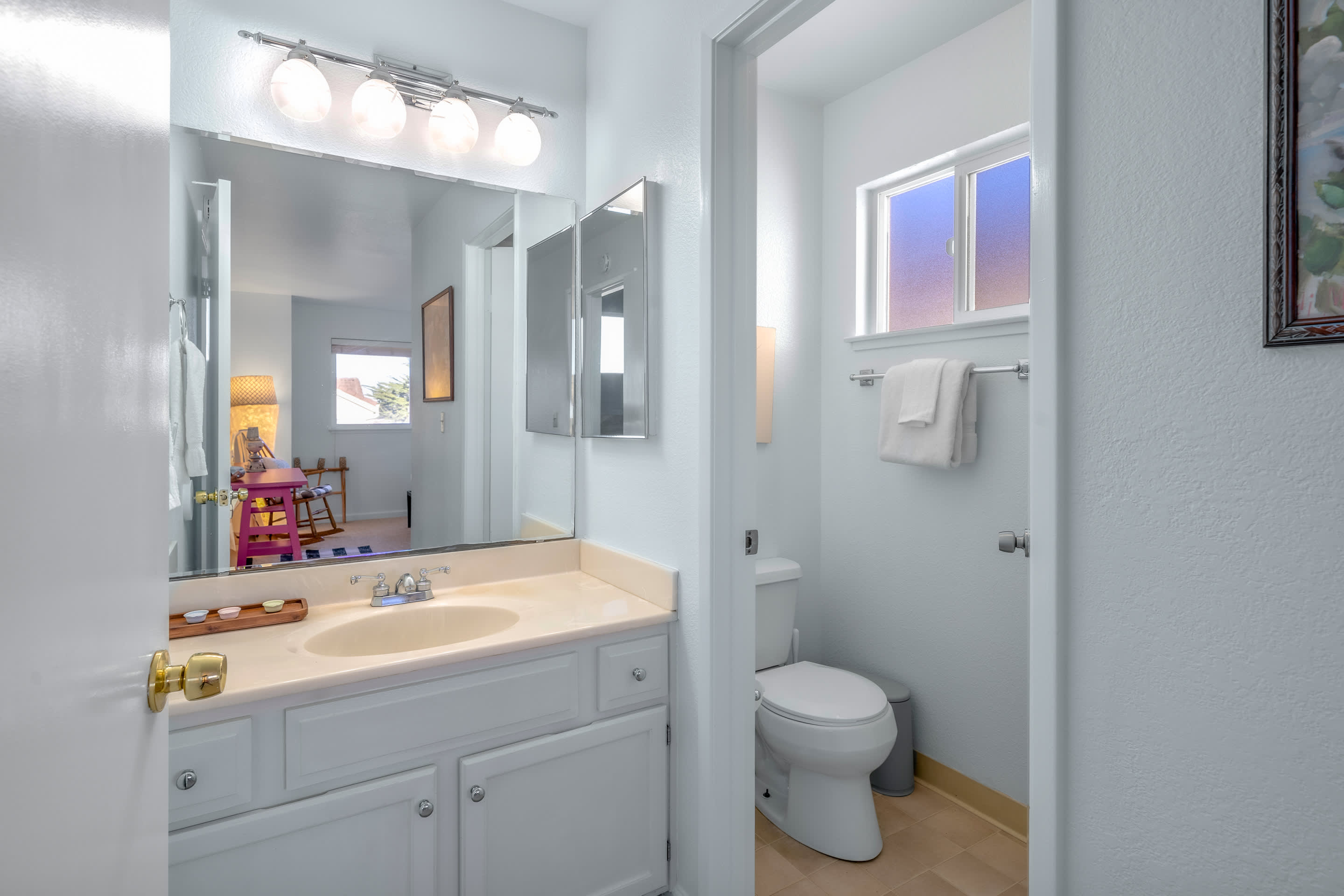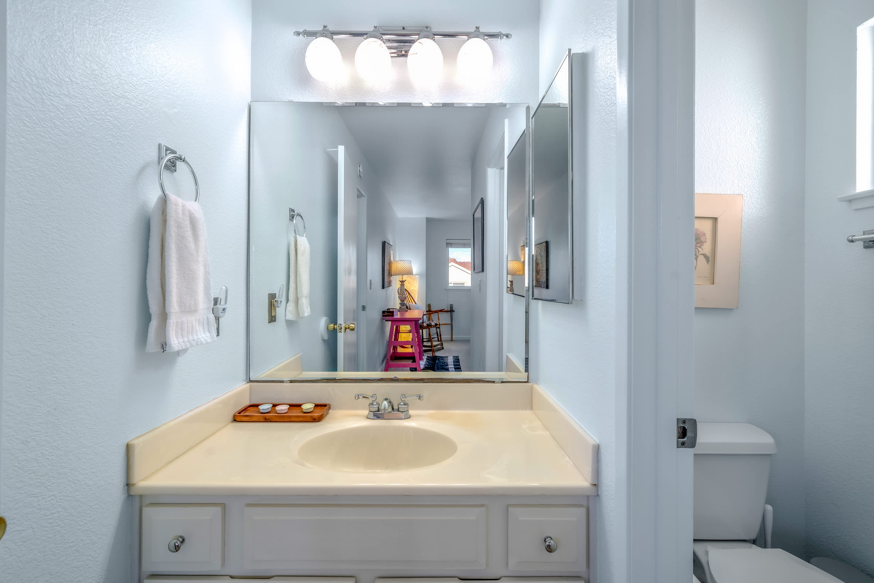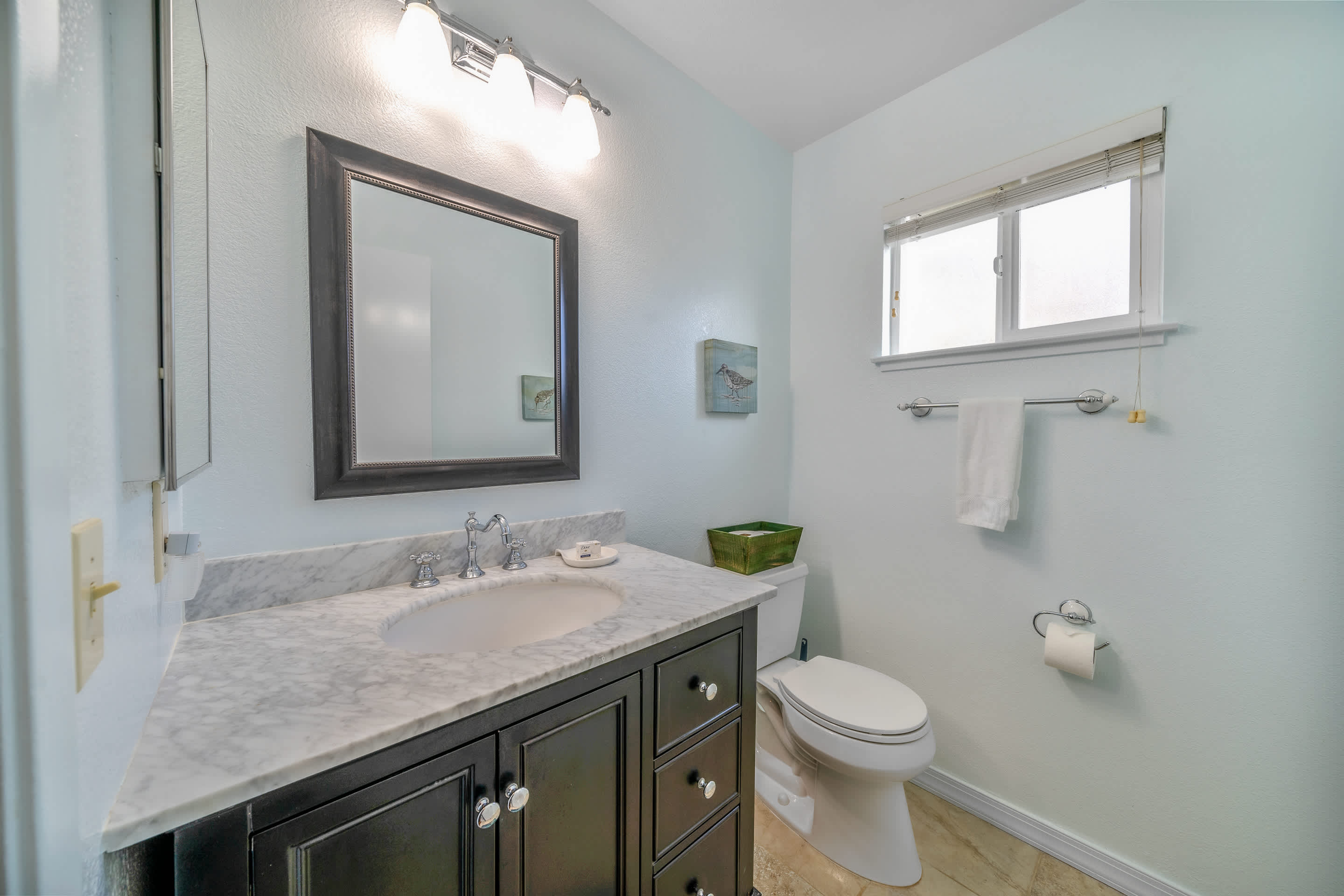 The home also includes a half bathroom as well as an additional full guest bathroom with a single vanity and shower/tub combo.