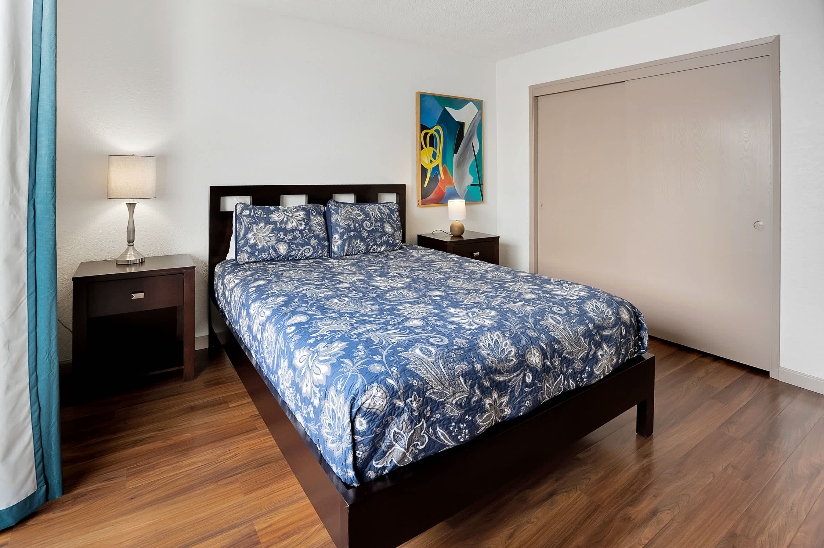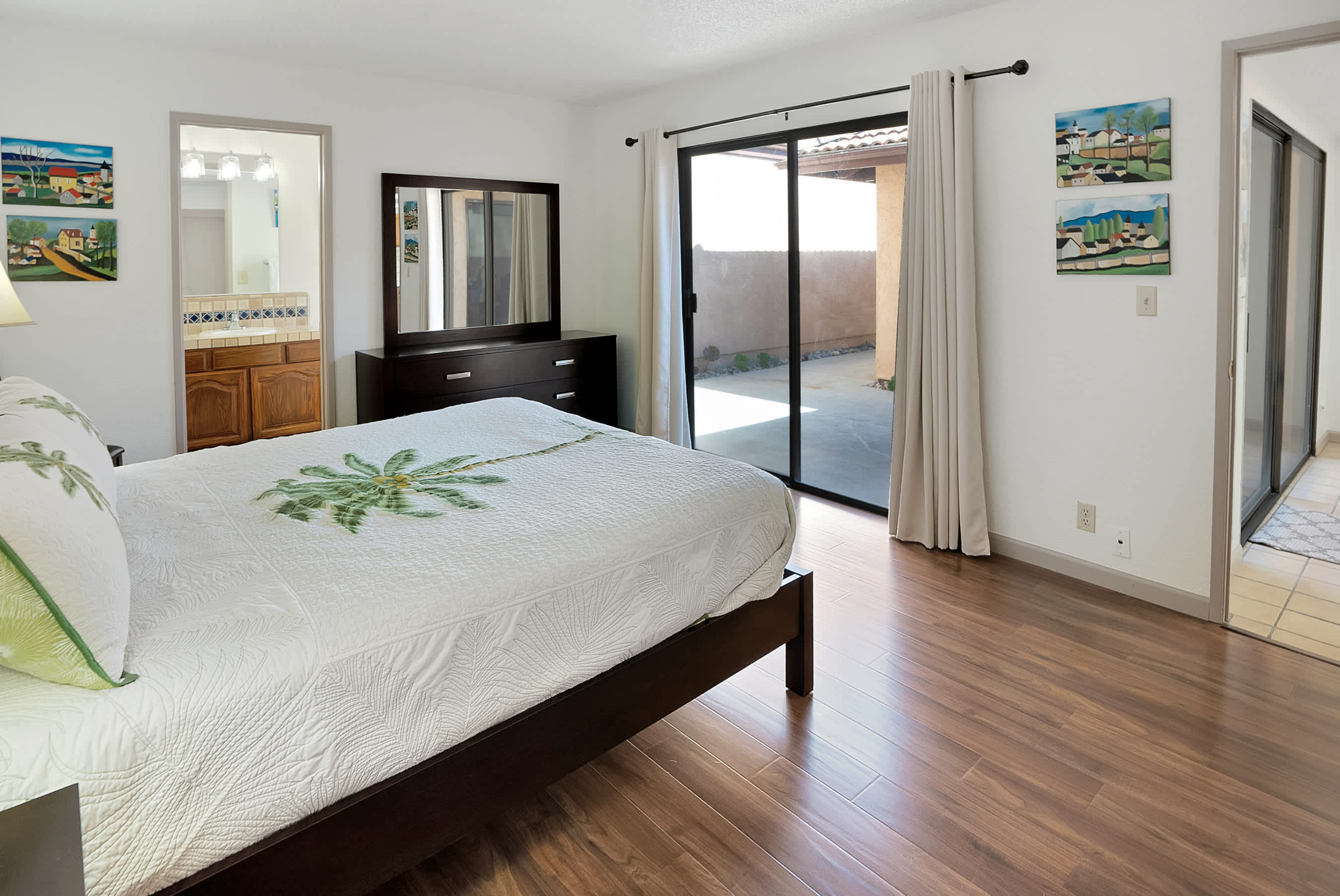 Bedroom #1 includes a queen size bed, patio access, and ensuite bathroom with a single vanity and shower/tub combo.