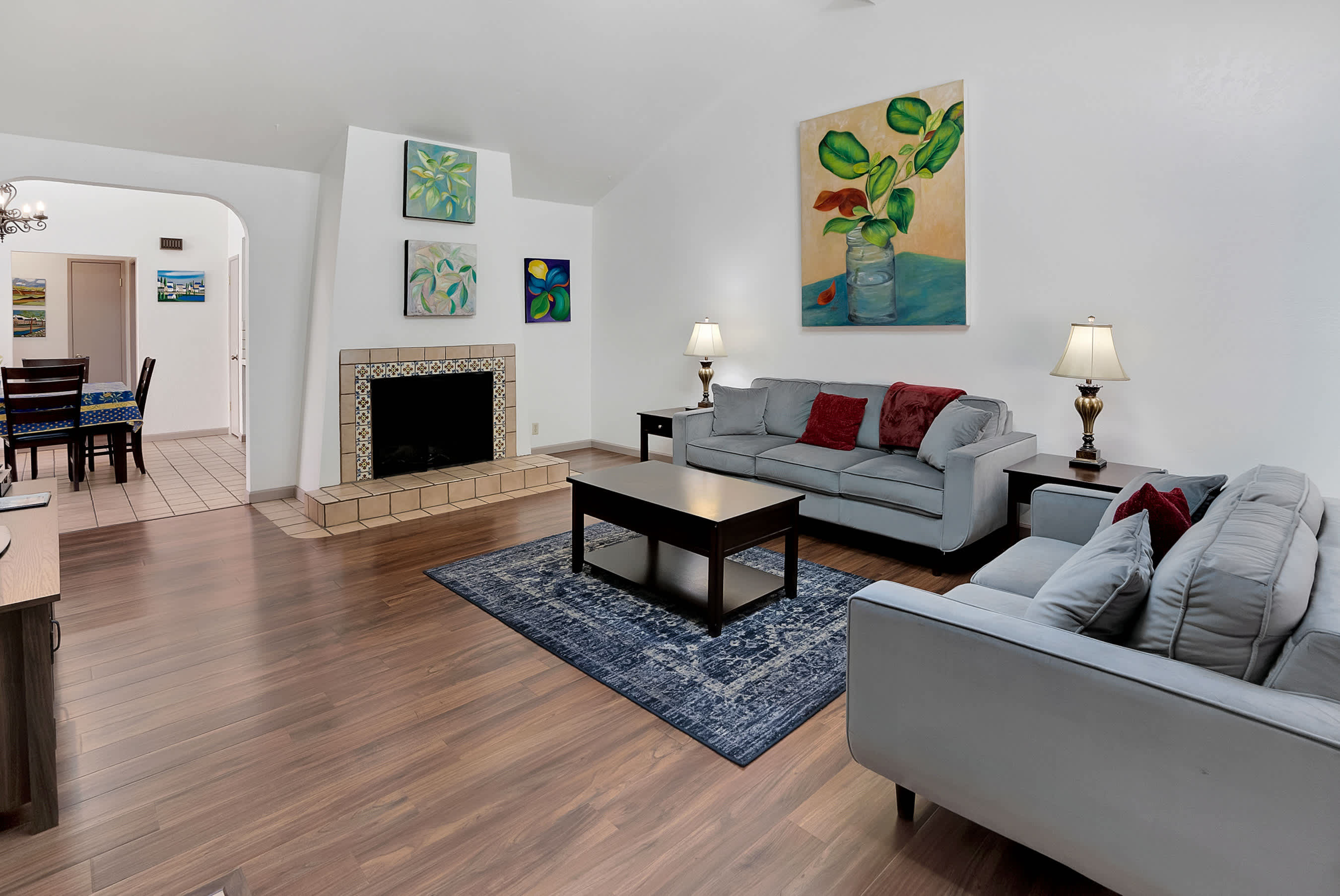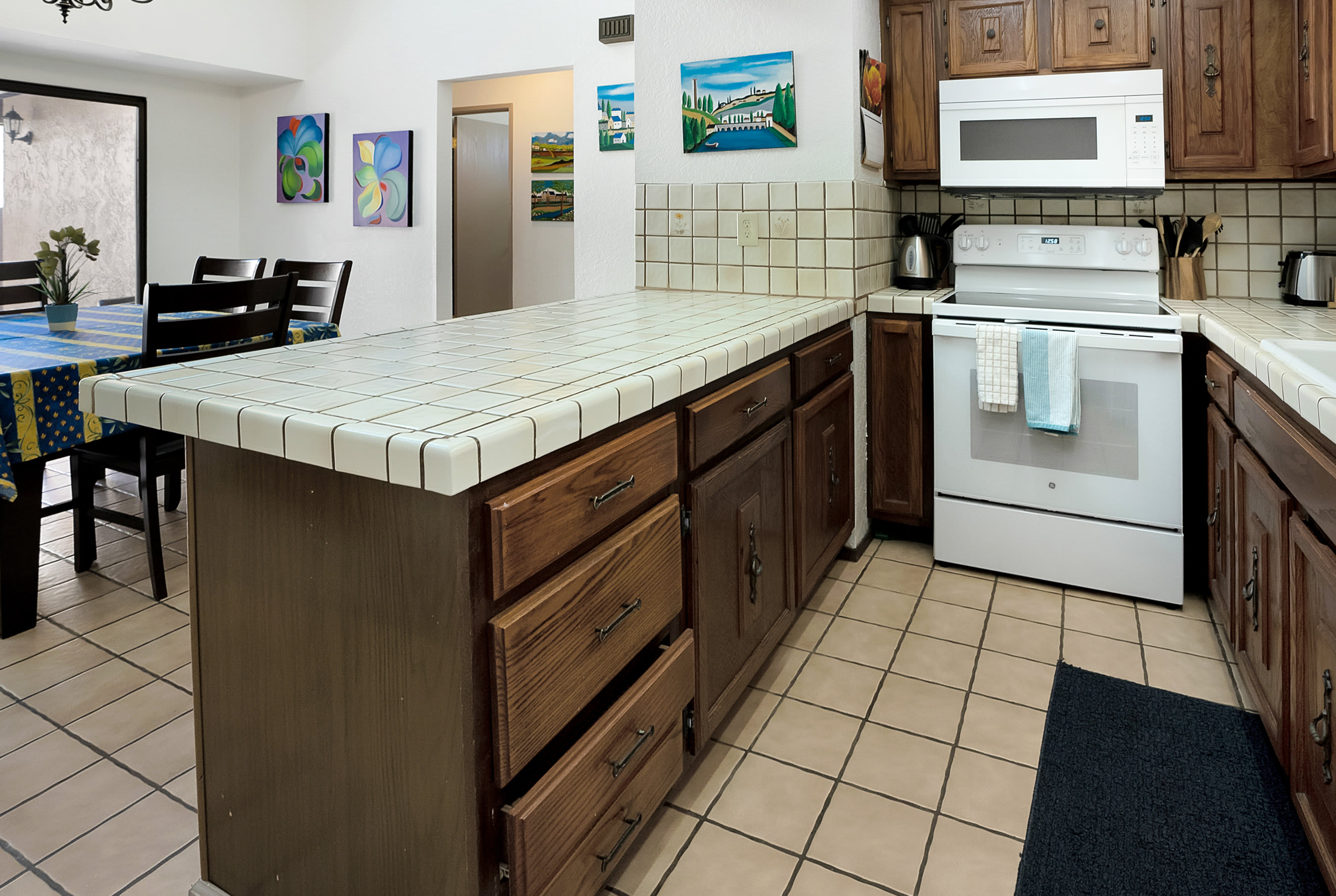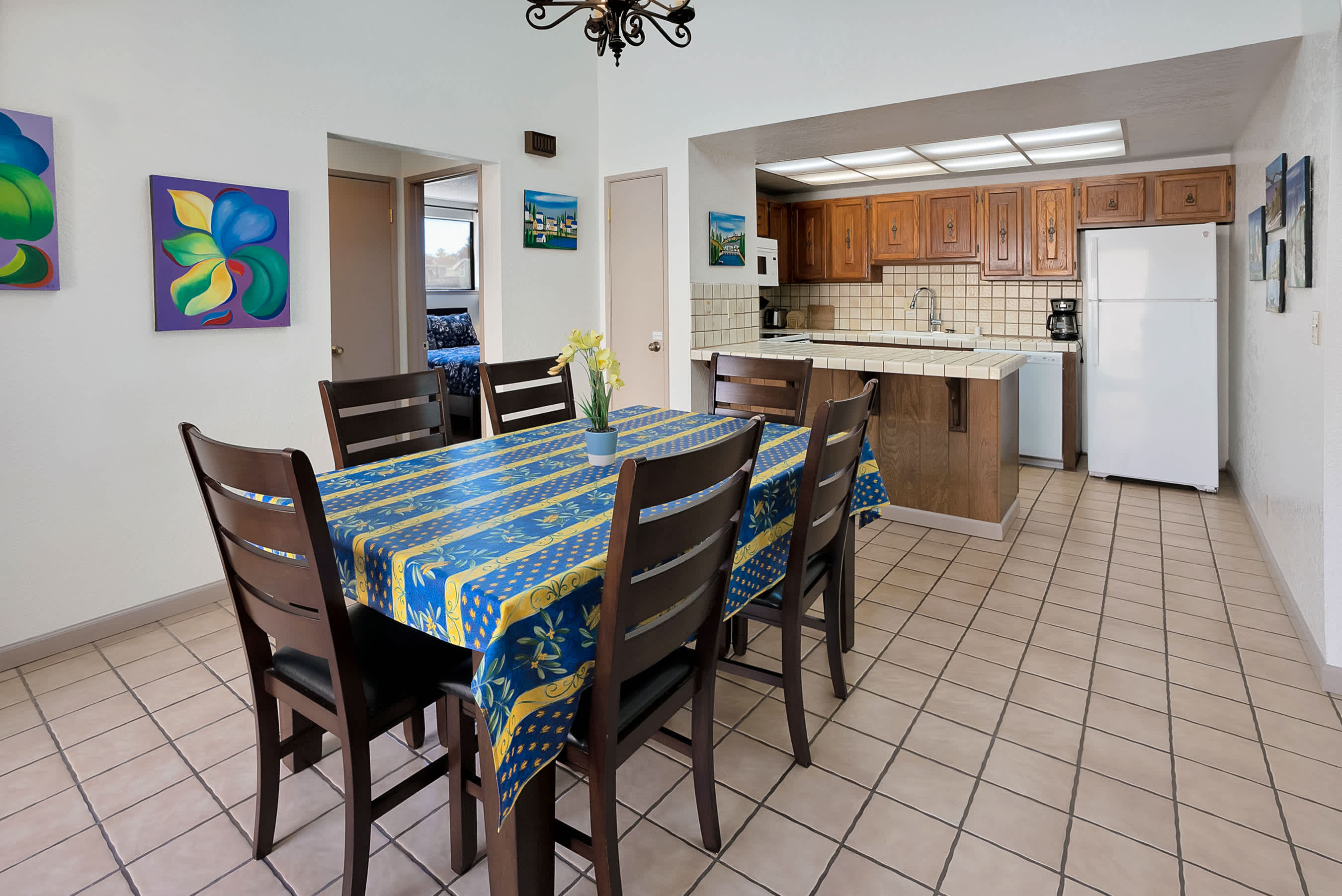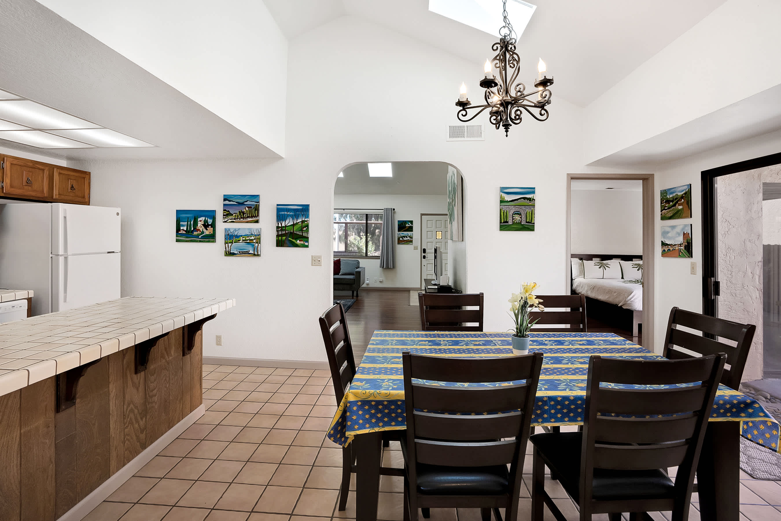 You’ll love starting your day at the home with a fresh cup of coffee in one of two Spanish-style courtyards, enjoying the sights and sounds of a peaceful morning. Indoors, the floor plan seamless connects one room to the next, creating spaces ideal for gathering and entertainment. The comfortable living room is furnished with a plush sofa and loveseat, perfect for relaxing while catching a movie on the included TV. Skylights illuminate the area with abundant natural light, while colorful artwork bring the vibrancy of nature indoors. From here, walk through arched doorways to the dining room where you’ll find a colorful table with seating for 6, as well as sliding door access onto the patio. The chef among you will appreciate the well-equipped kitchen, inclusive of all the appliances, cookware, and dining ware needed for whipping up delicious homecooked meals.