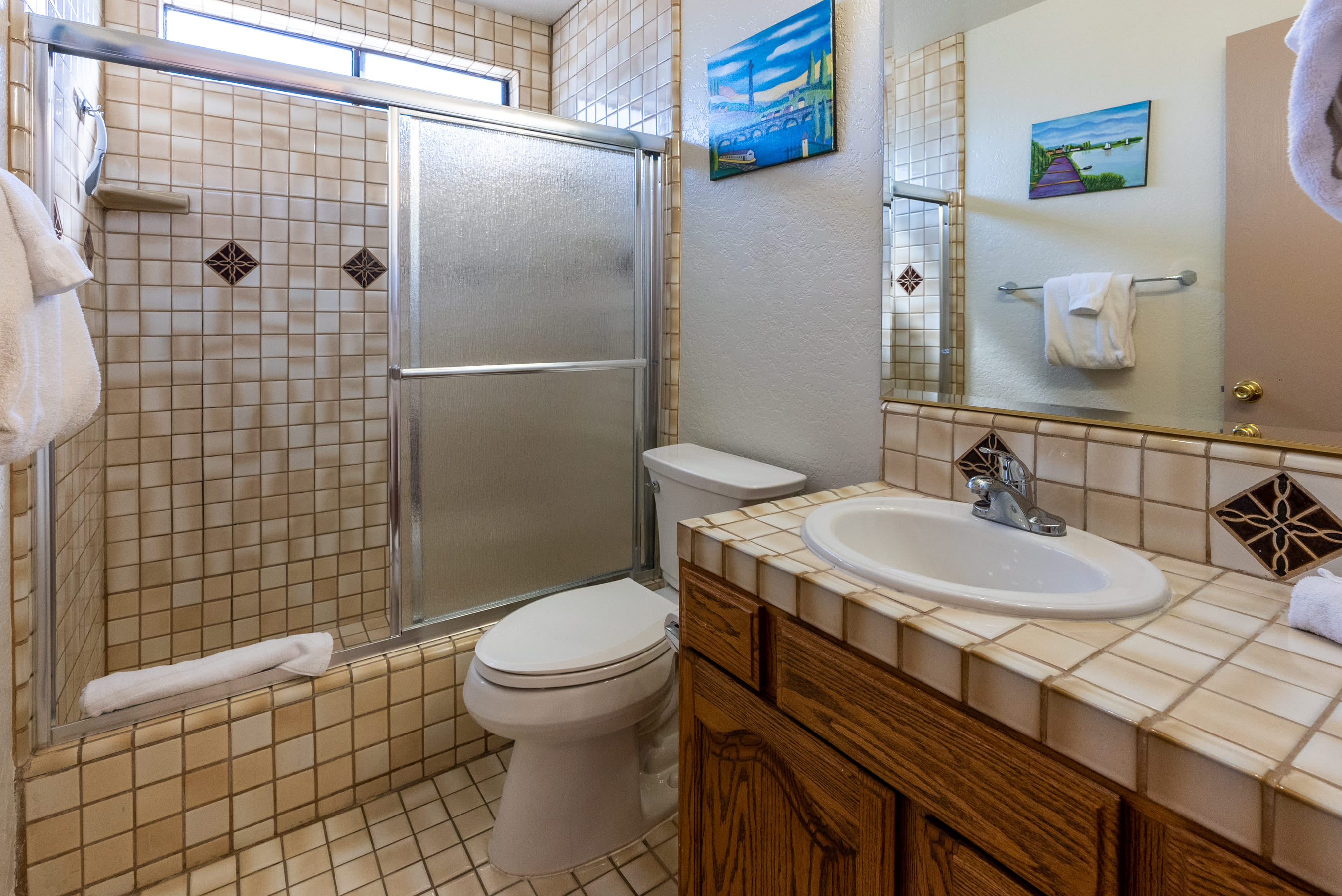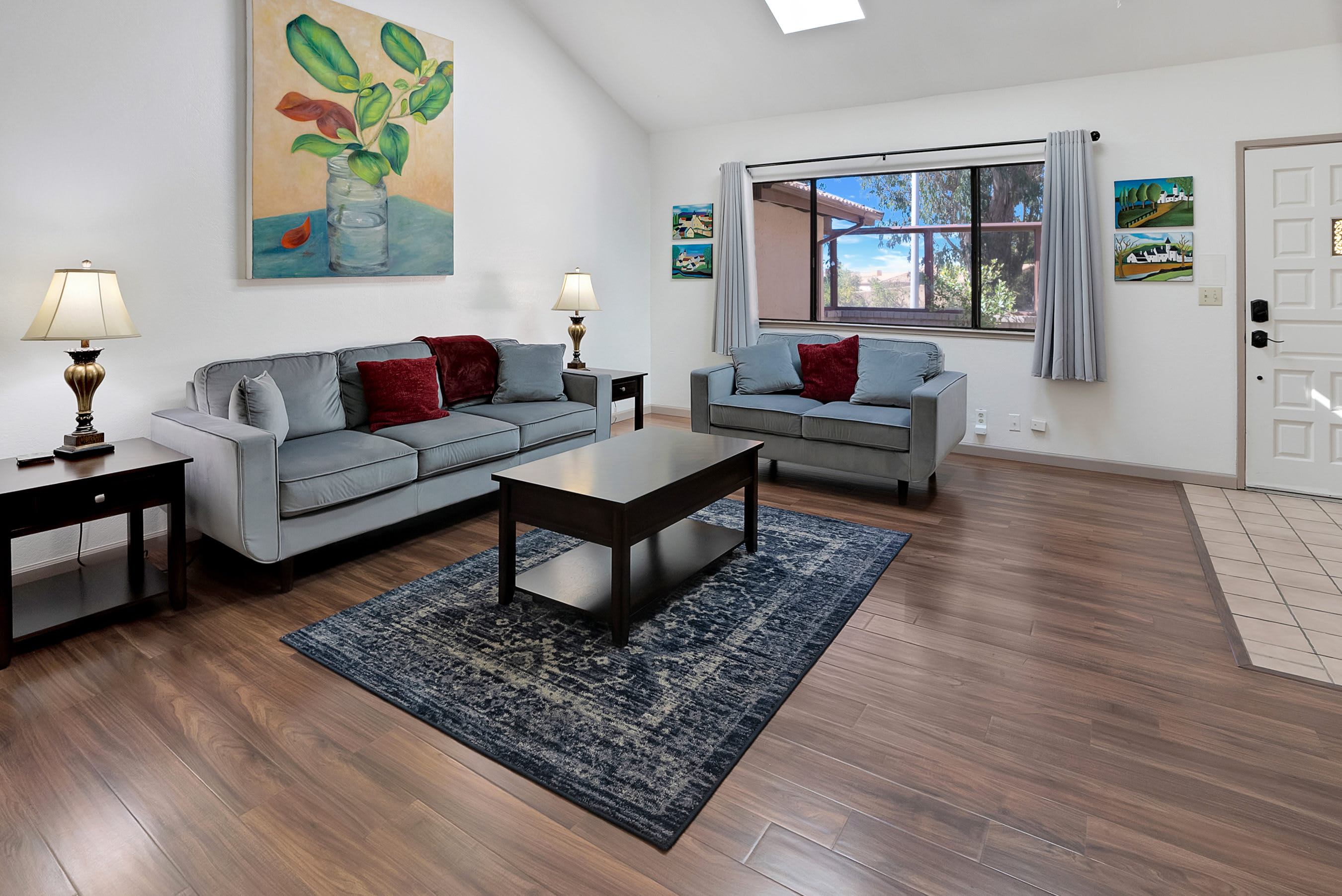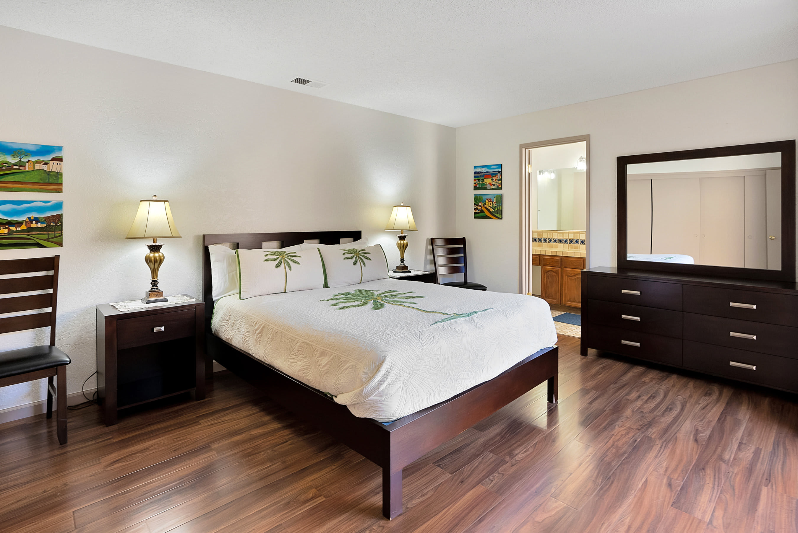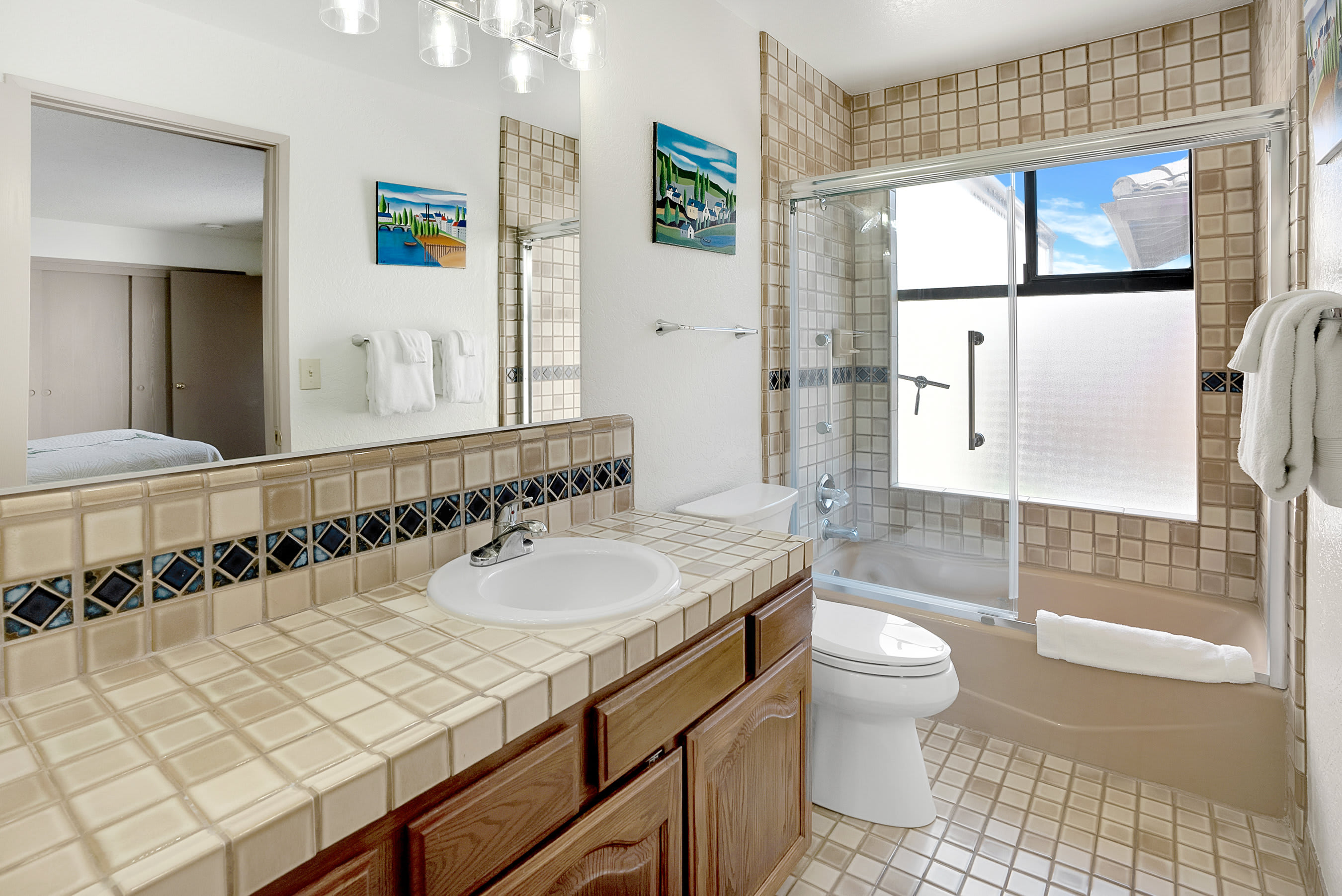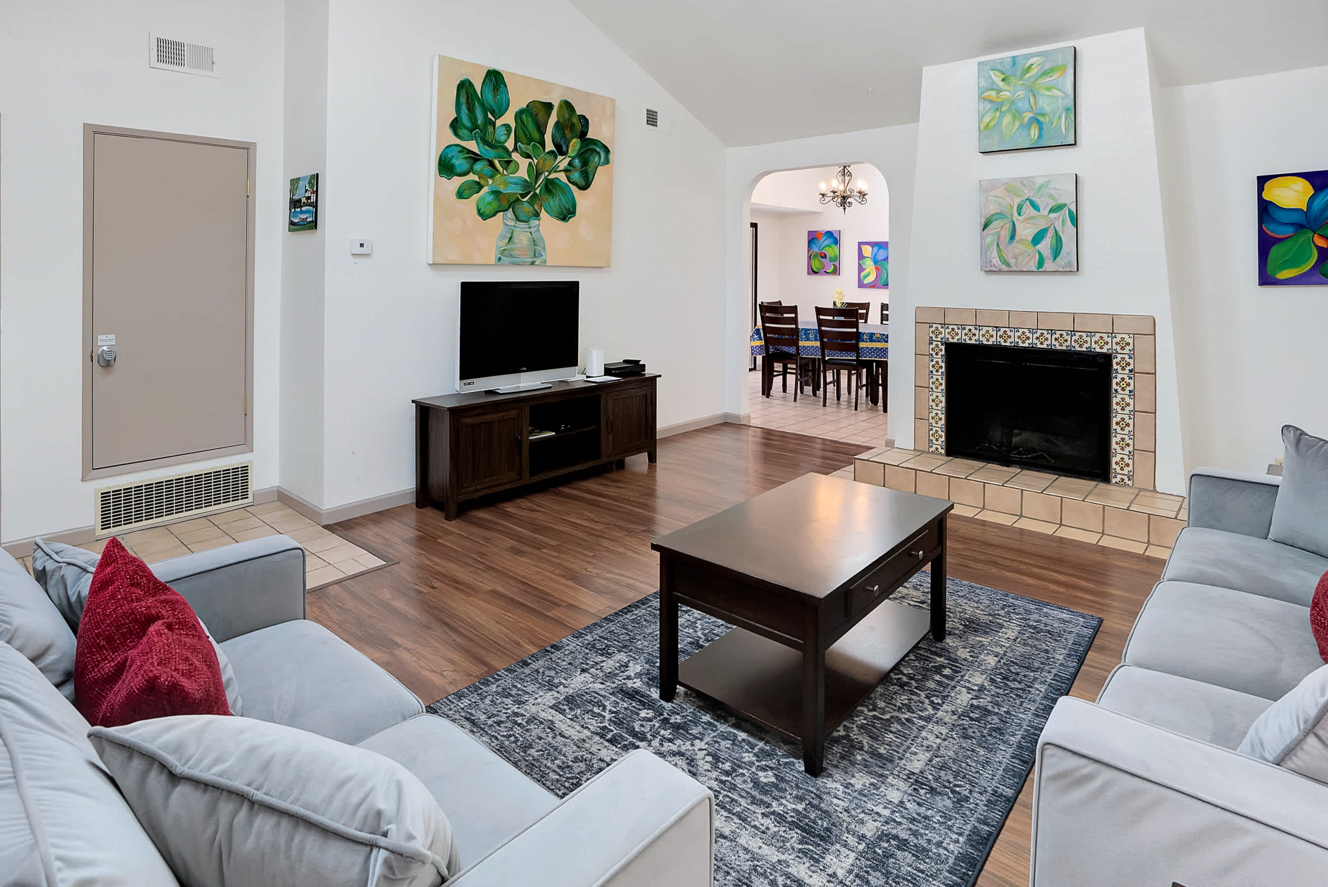 You’ll love starting your day at the home with a fresh cup of coffee in one of two Spanish-style courtyards, enjoying the sights and sounds of a peaceful morning. Indoors, the floor plan seamless connects one room to the next, creating spaces ideal for gathering and entertainment. The comfortable living room is furnished with a plush sofa and loveseat, perfect for relaxing while catching a movie on the included TV. Skylights illuminate the area with abundant natural light, while colorful artwork bring the vibrancy of nature indoors. From here, walk through arched doorways to the dining room where you’ll find a colorful table with seating for 6, as well as sliding door access onto the patio. The chef among you will appreciate the well-equipped kitchen, inclusive of all the appliances, cookware, and dining ware needed for whipping up delicious homecooked meals.