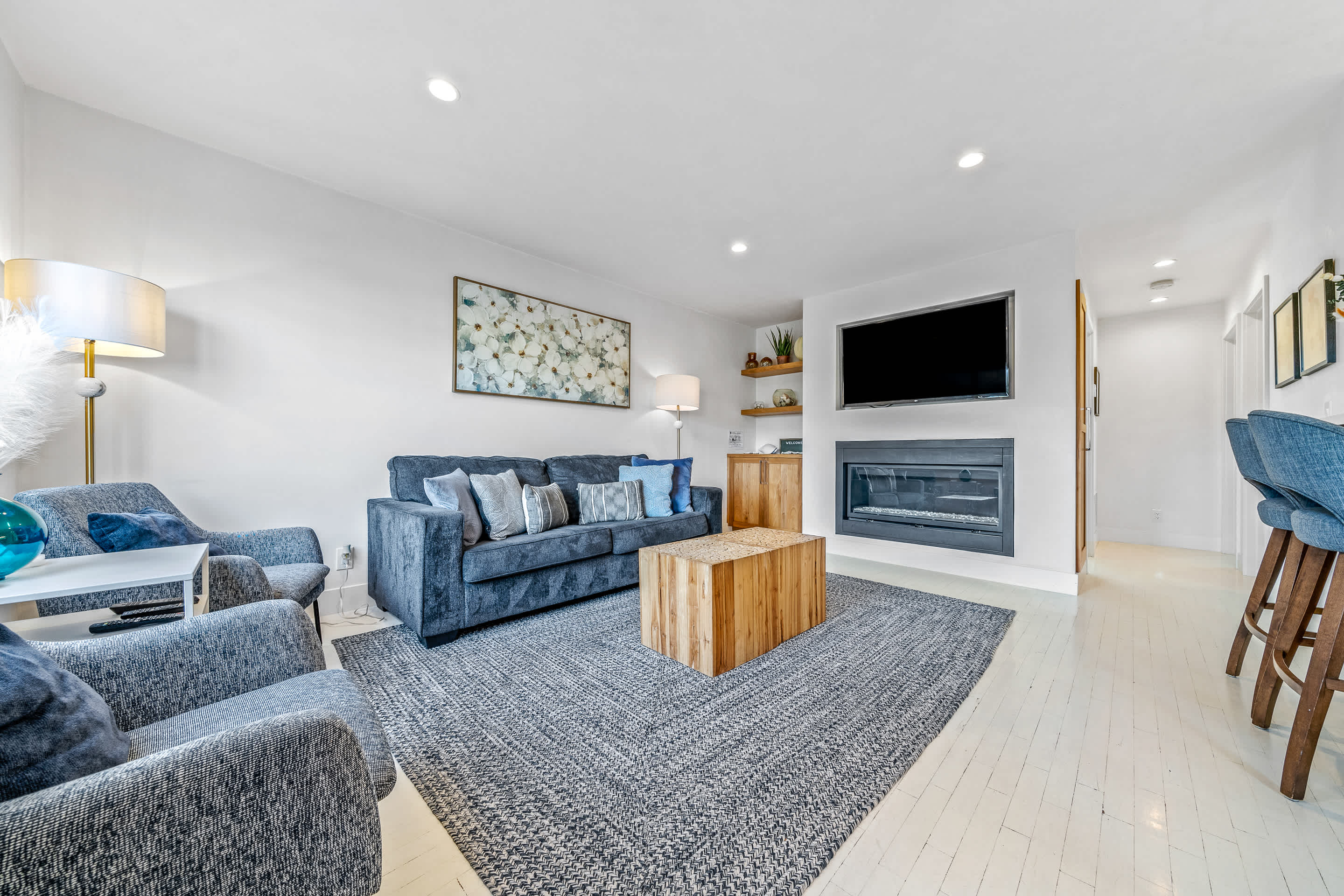 Spacious living room with plush seating, gas fireplace & smart TV