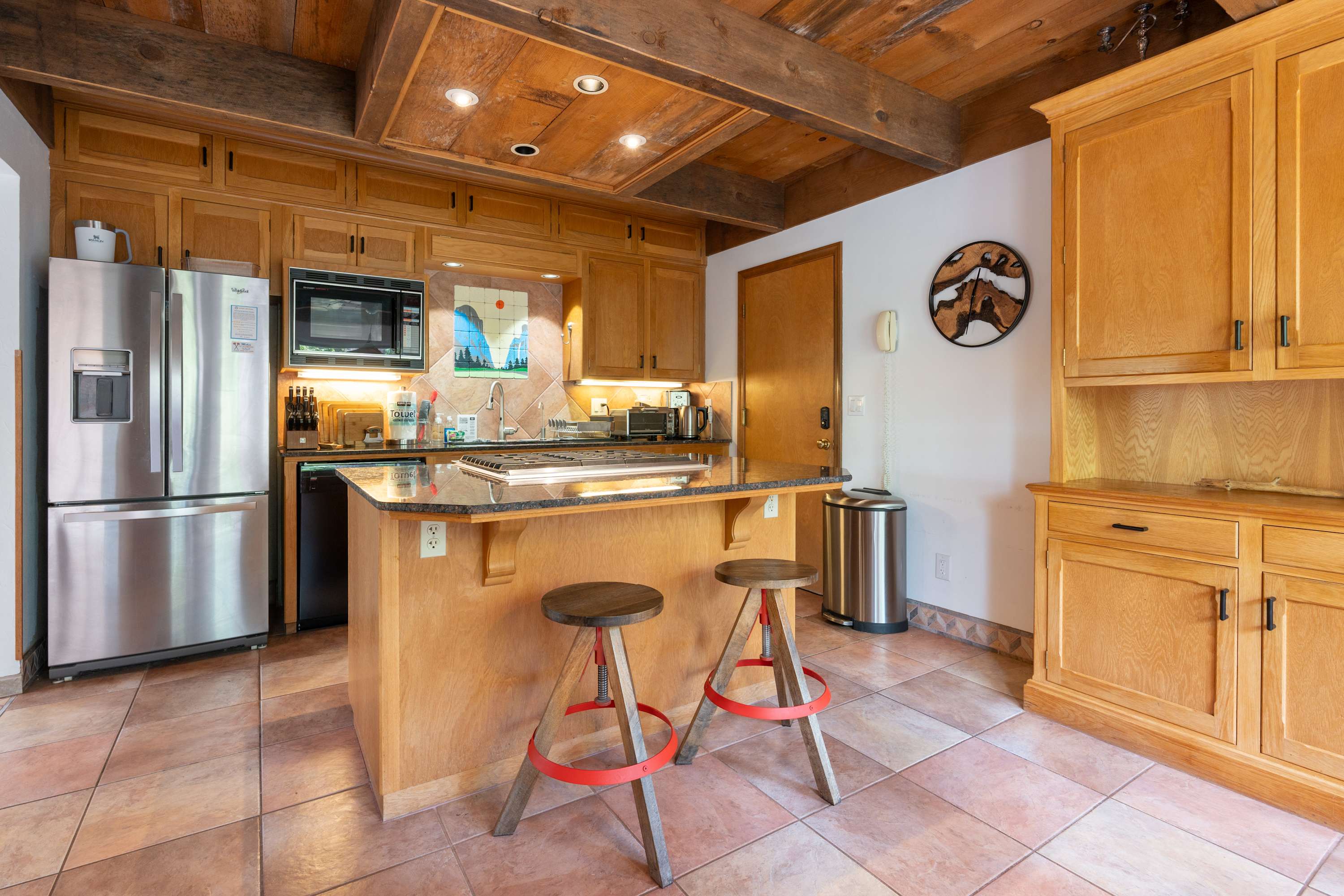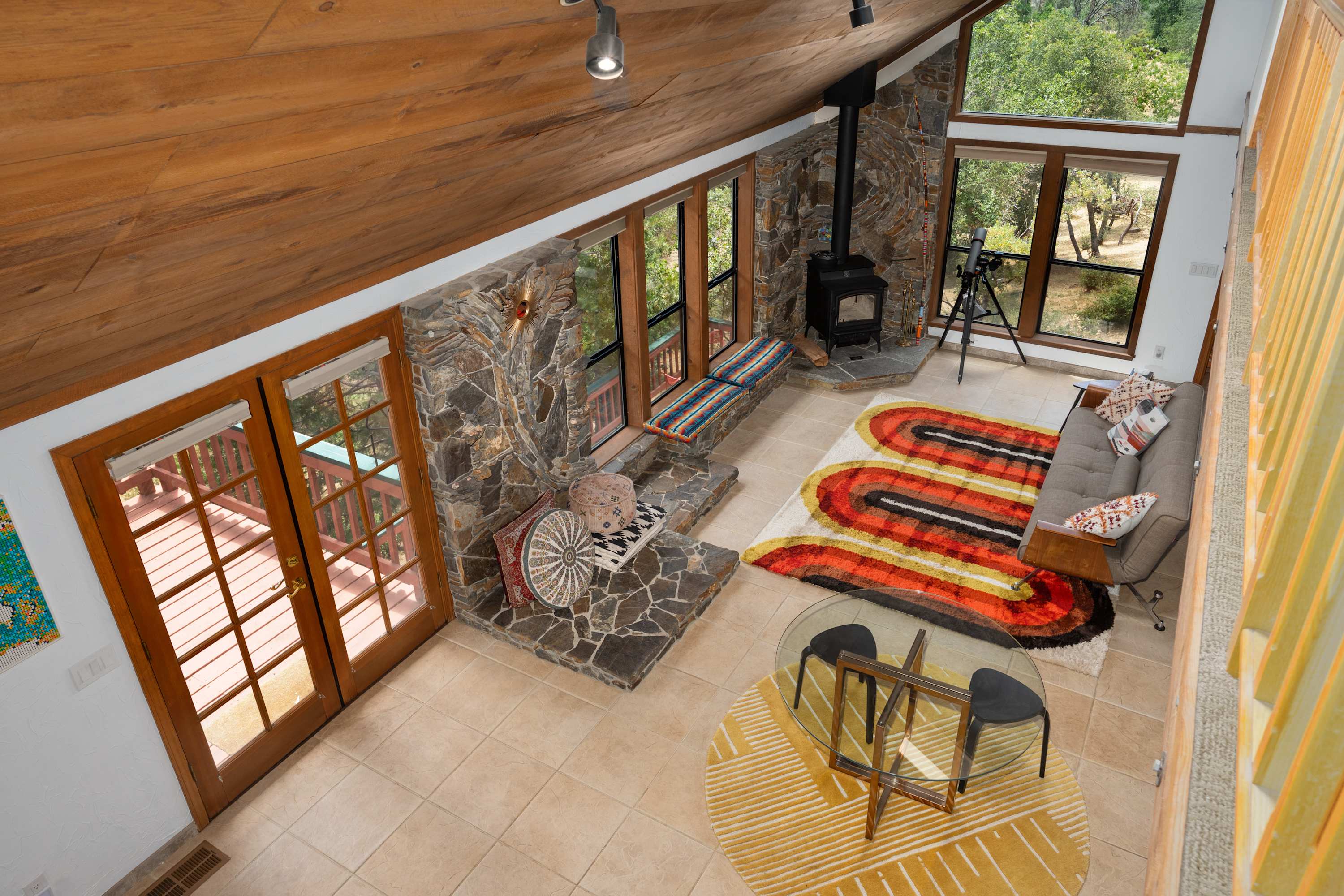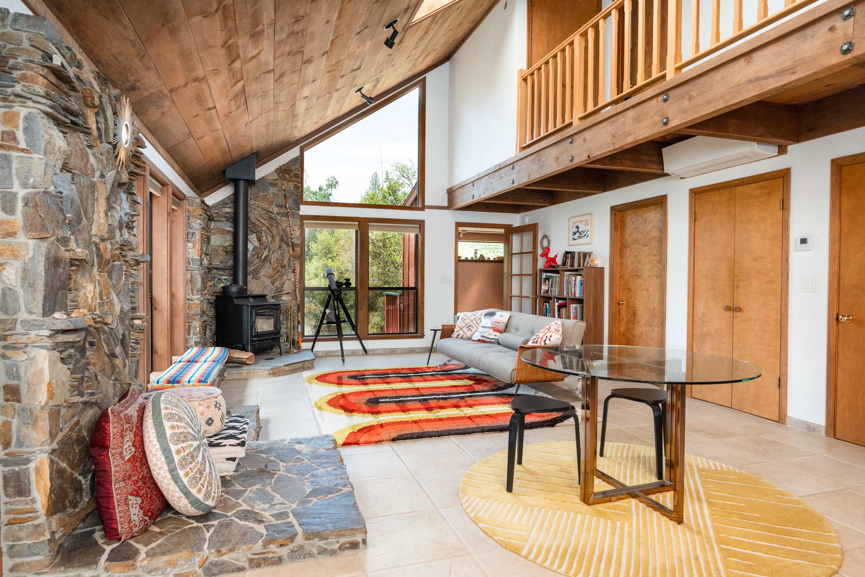 Inside, the home boasts a stunning design filled with natural wood textures, gorgeous stonework, and vibrant patterns. You’ll never feel far from nature, with gorgeous windows looking out over the beautiful property, and there is tons of indoor space for guests to kick back and relax. The main living room is especially attractive with couches for reading, a telescope for stargazing, and a beautiful piano to fill the space with ambient music. You’ll find more private nooks with furniture ranging from cozy armchairs to a drafting table. The fully equipped kitchen provides all the appliances and cookware you’ll need to prepare food and drinks throughout your trip, with the formal dining table just steps away.