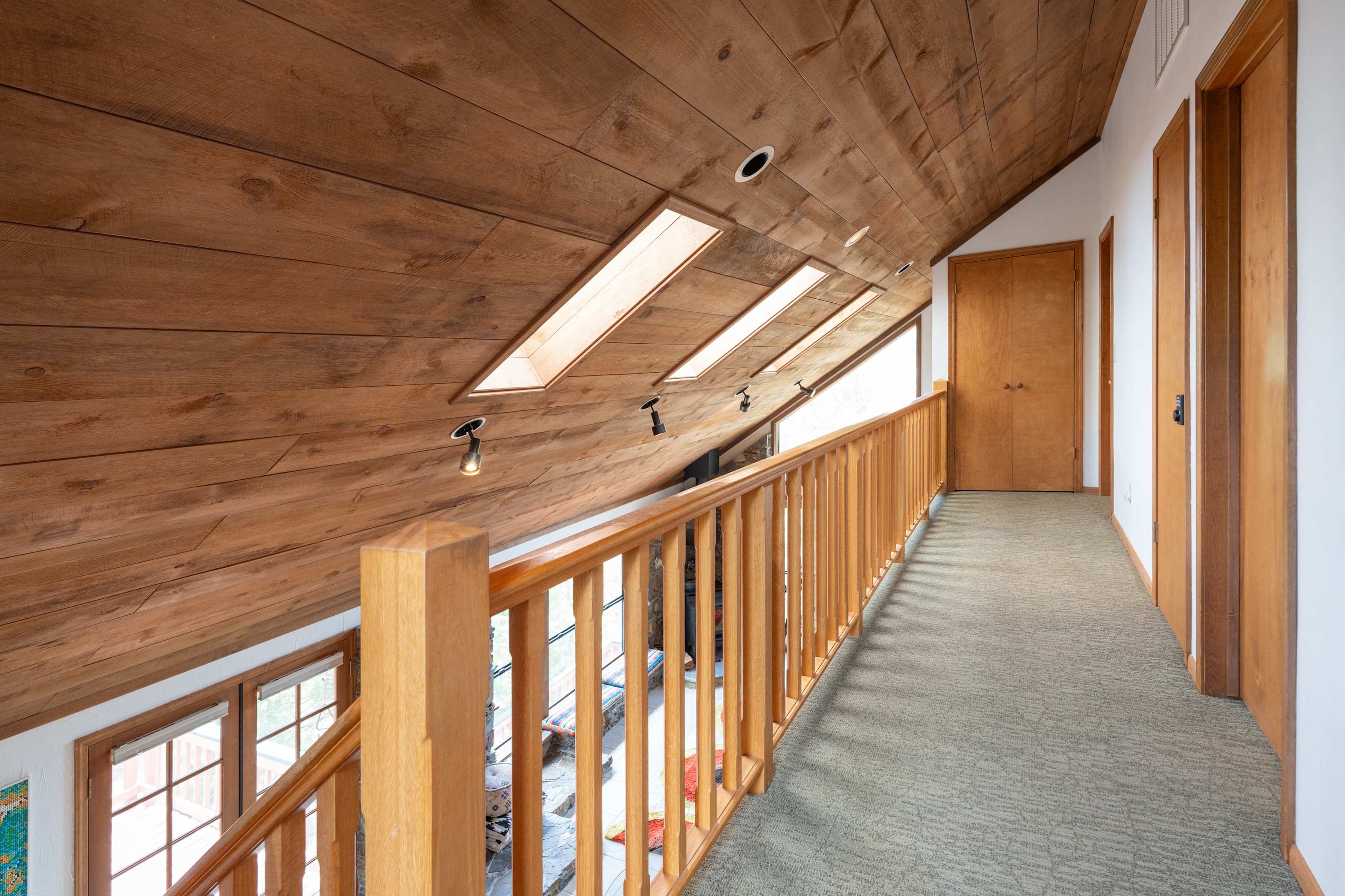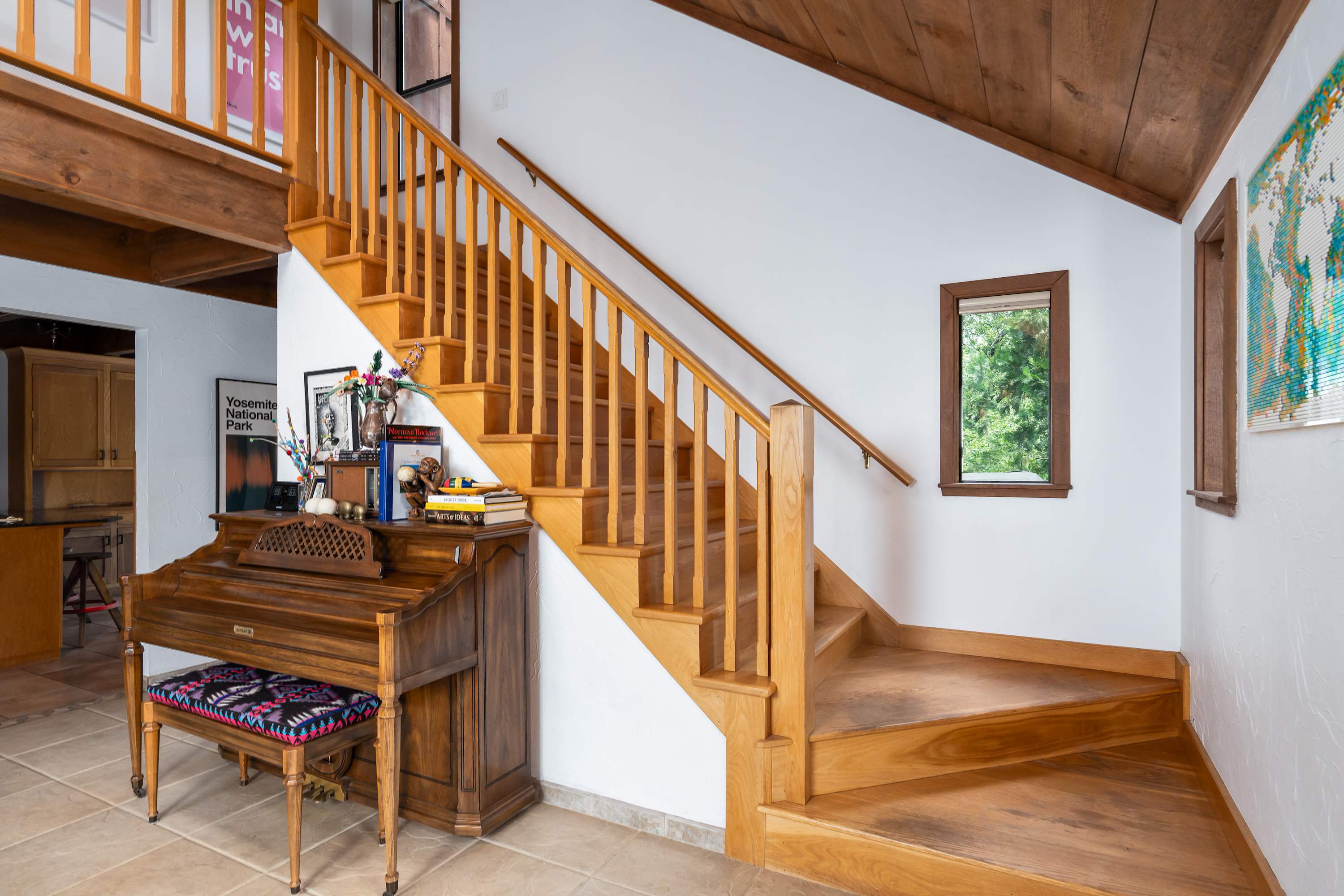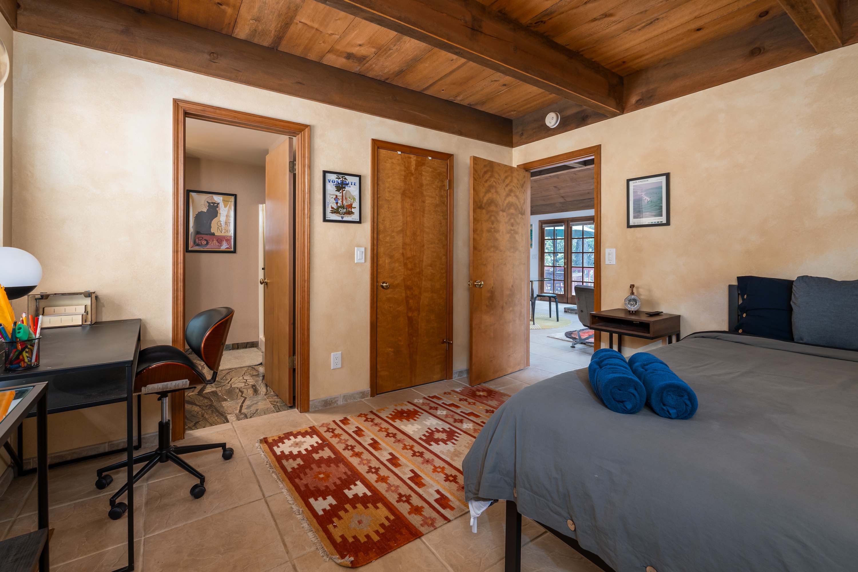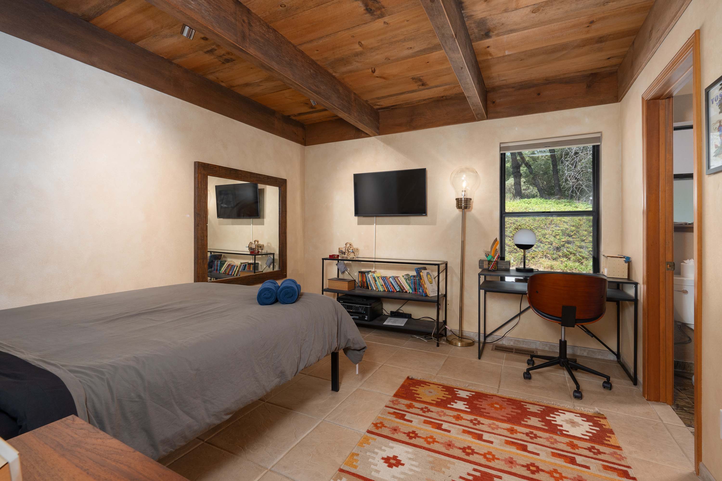 Inside, the home boasts a stunning design filled with natural wood textures, gorgeous stonework, and vibrant patterns. You’ll never feel far from nature, with gorgeous windows looking out over the beautiful property, and there is tons of indoor space for guests to kick back and relax. The main living room is especially attractive with couches for reading, a telescope for stargazing, and a beautiful piano to fill the space with ambient music. You’ll find more private nooks with furniture ranging from cozy armchairs to a drafting table. The fully equipped kitchen provides all the appliances and cookware you’ll need to prepare food and drinks throughout your trip, with the formal dining table just steps away.