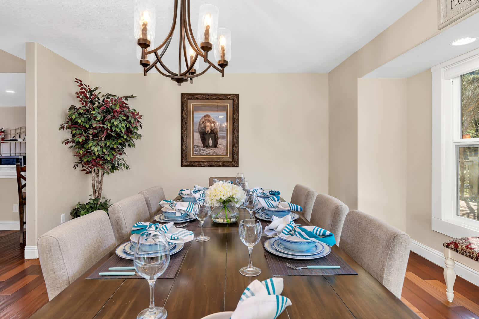 Inside, the home is designed to feel like your very own with cozy furnishings and spaces that invite you to kick back and relax. The living room has ample space for your group to unwind, plus continued access to the gorgeous views and a large screen smart tv. The cook of your group will be delighted by the fully equipped kitchen with ample counter space, stainless steel appliances, and a full suite of cookware. Guests are welcome to casually dine at the kitchen counter or gather for a memorable meal at the formal table set for 8.