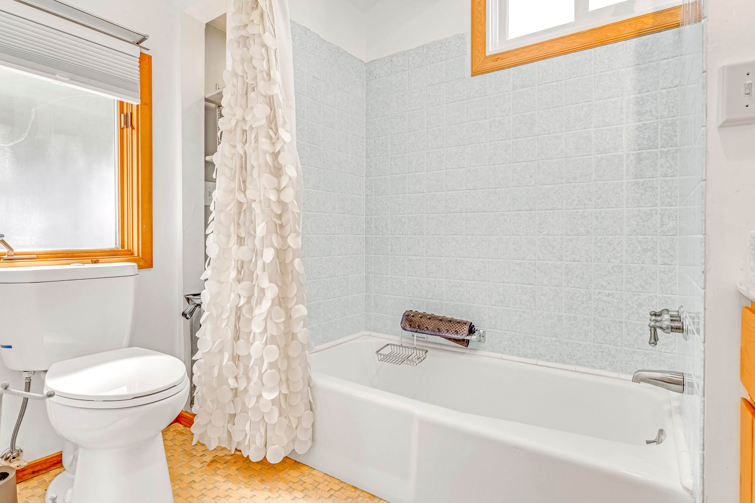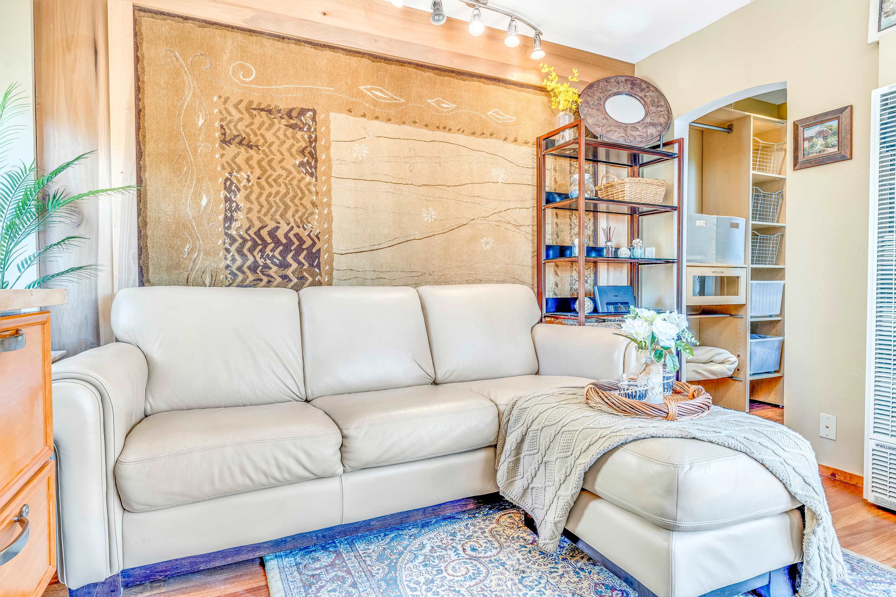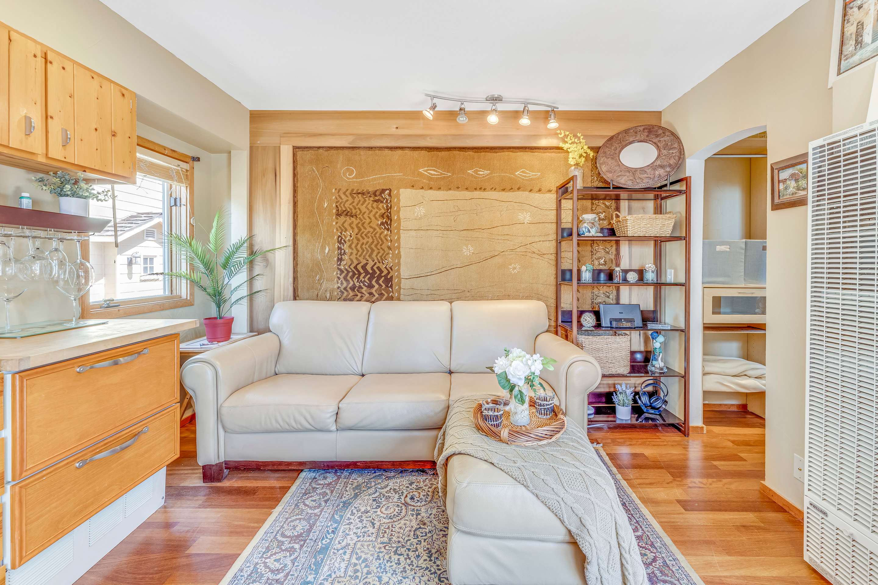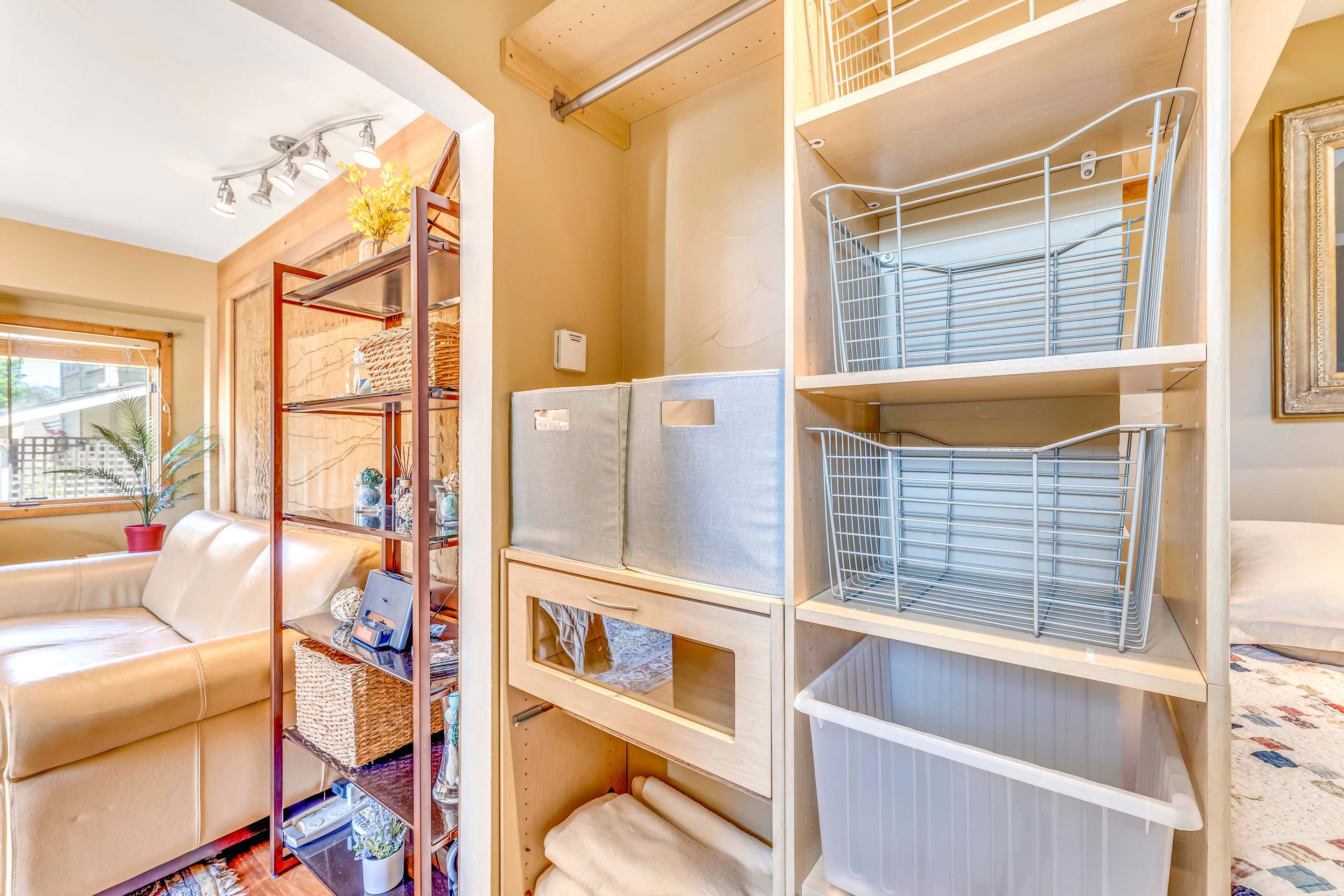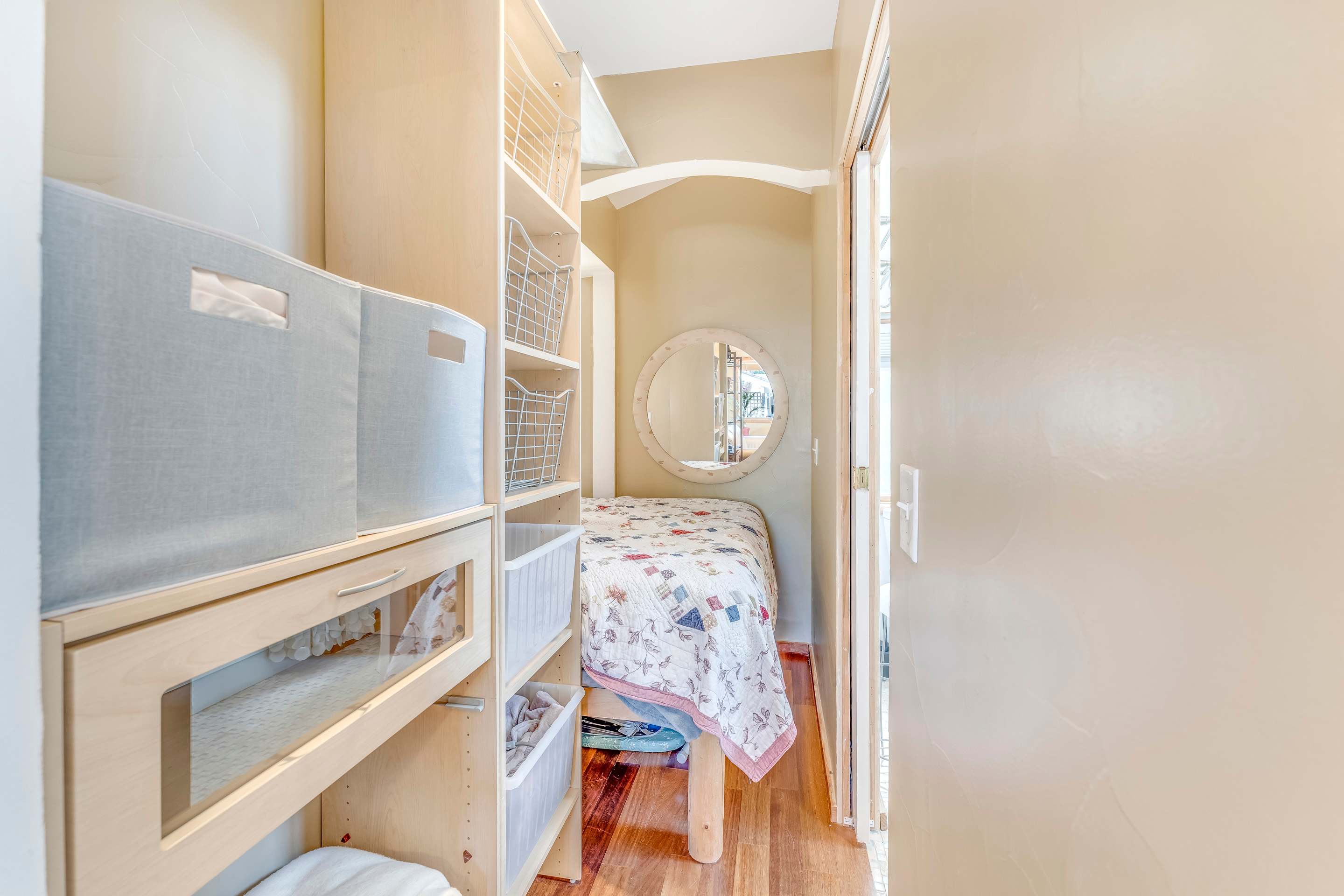 The home sleeps up to 2 guests in a Queen size bed, tucked into a quiet sleeping nook. Between the sleeping and living areas, you’ll find a small storage area for your belongings as well as towels and linens. A full bathroom with a shower/tub combo is located just off the sleeping nook.