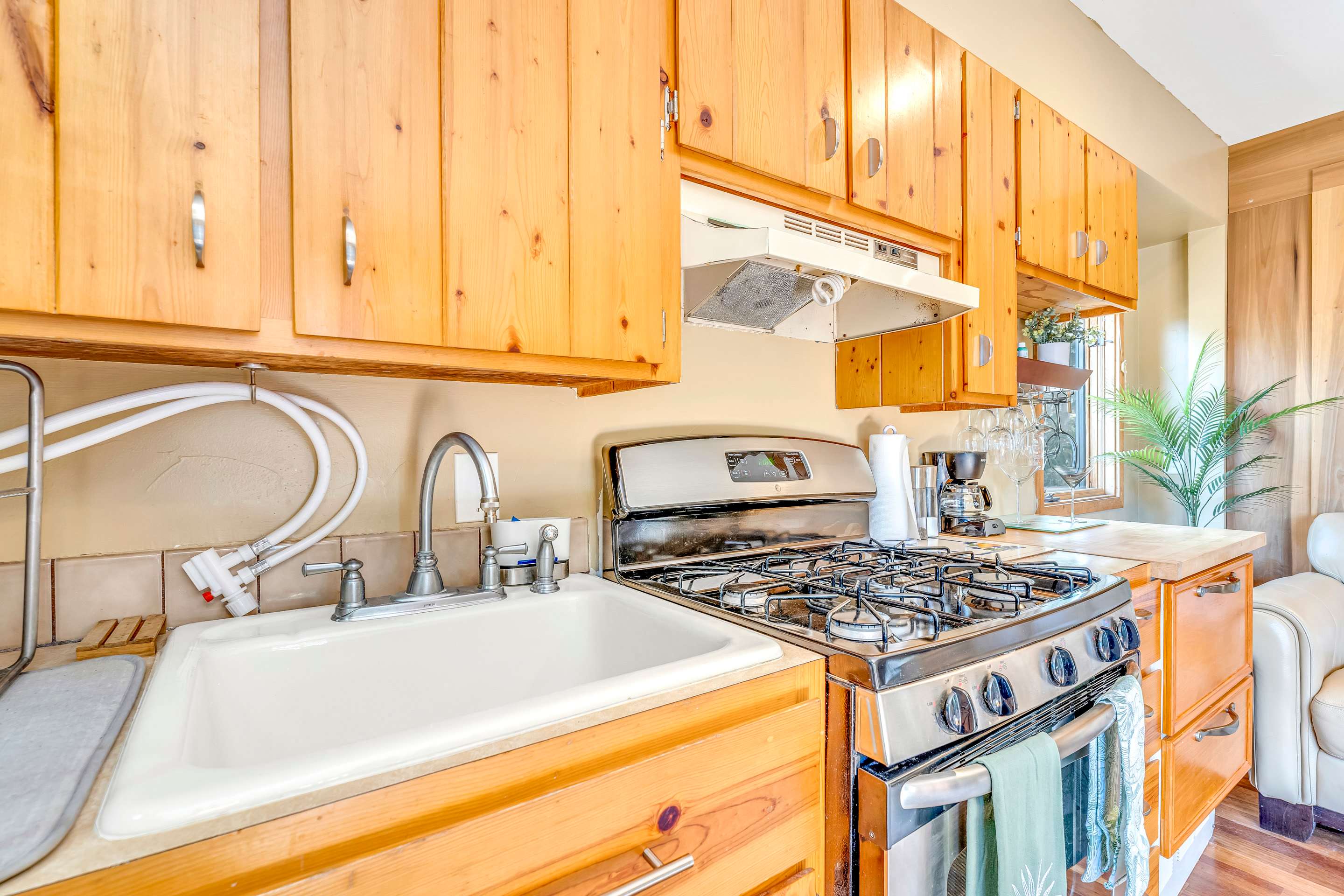 The kitchen is equipped with appliances and additional kitchenware such as a toaster and coffee maker for your convenience.