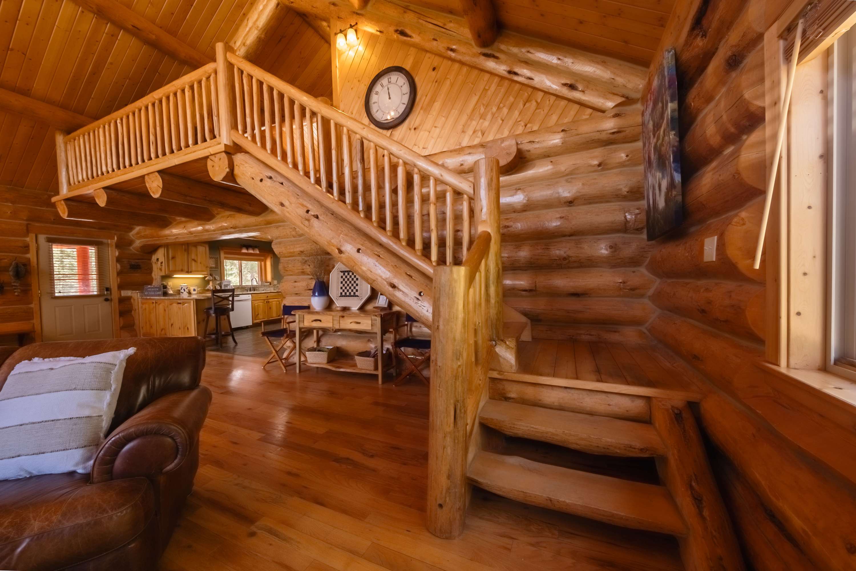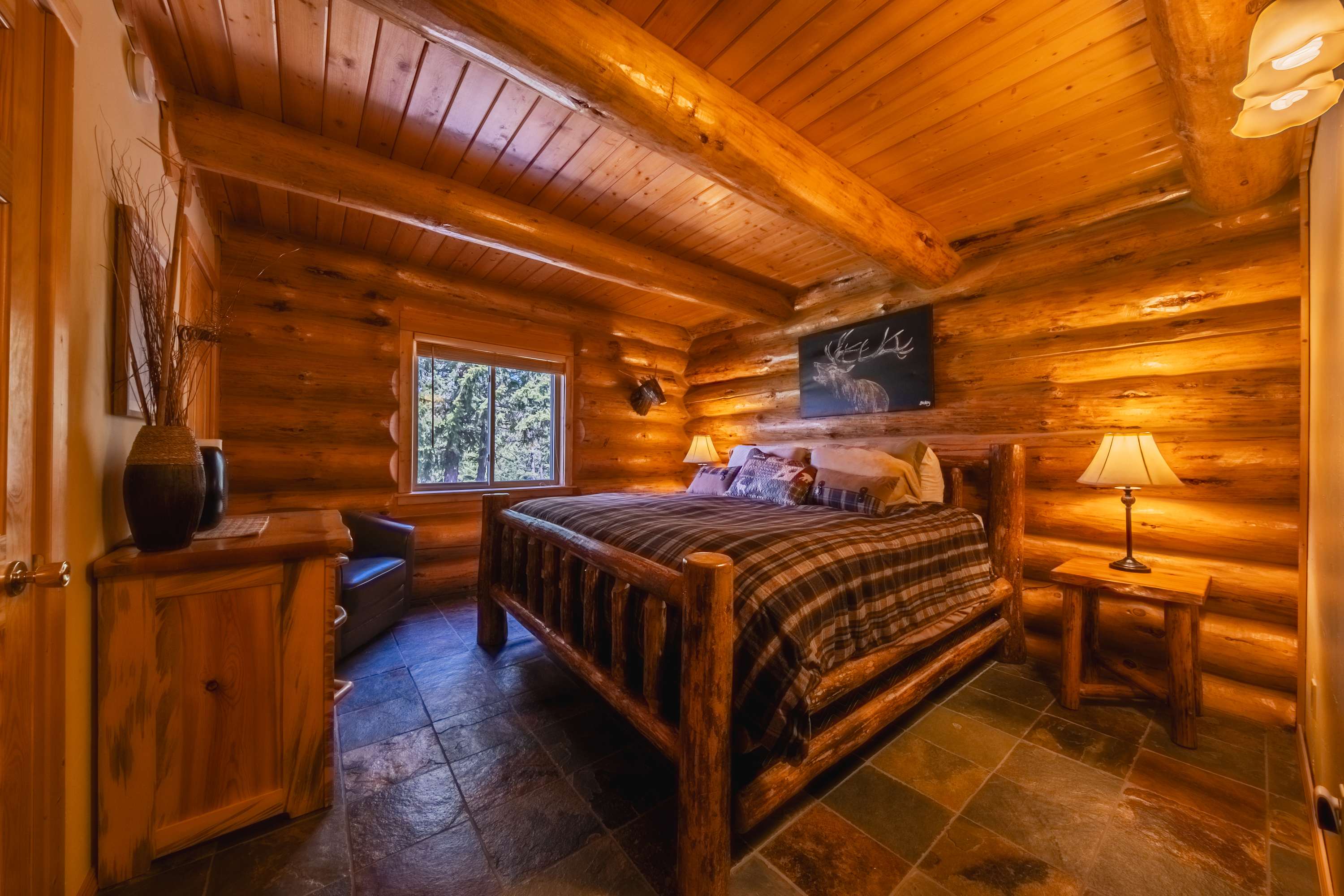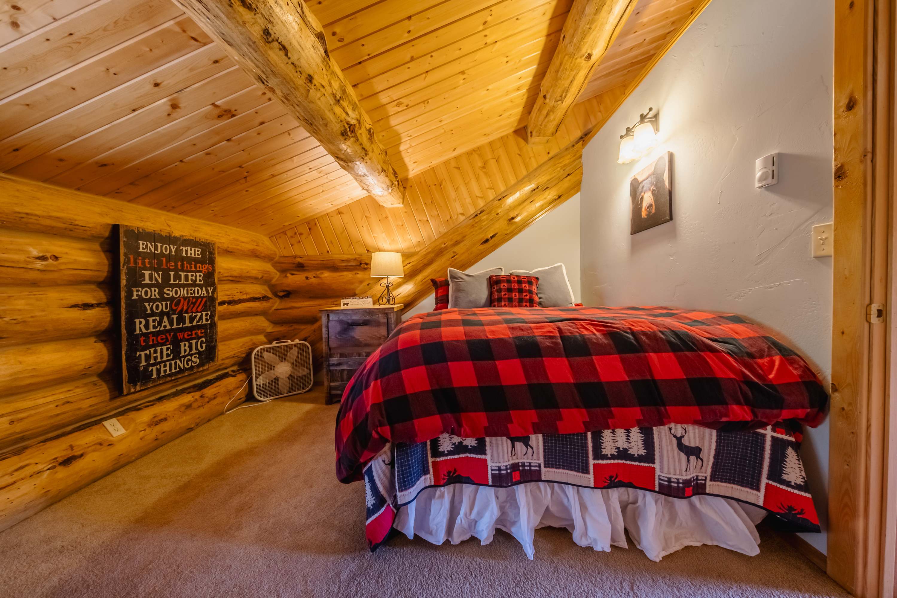Stepping indoors, the log cabin theme is in full effect, where soaring vaulted ceilings sit atop open spaces adorned top to bottom with warm wood trim and accents creating a cozy environment for connectivity and entertainment. Gather together in the living room to swap stories of the day’s adventures, the fireplace keeping you warm and toasty during the cooler months. Steps away, the dining table seats 6 for formal meals and spontaneous game nights alike, with views of the picturesque outdoor landscape kept front and center. The fully equipped kitchen offers everything needed for creating culinary delights in the convenience of home, with ample counterspace and cabinetry assisting with preparation and storage. Up in the loft, a second living area awaits where you can enjoy surfing the channels on the TV or sneaking off for a quiet afternoon nap.