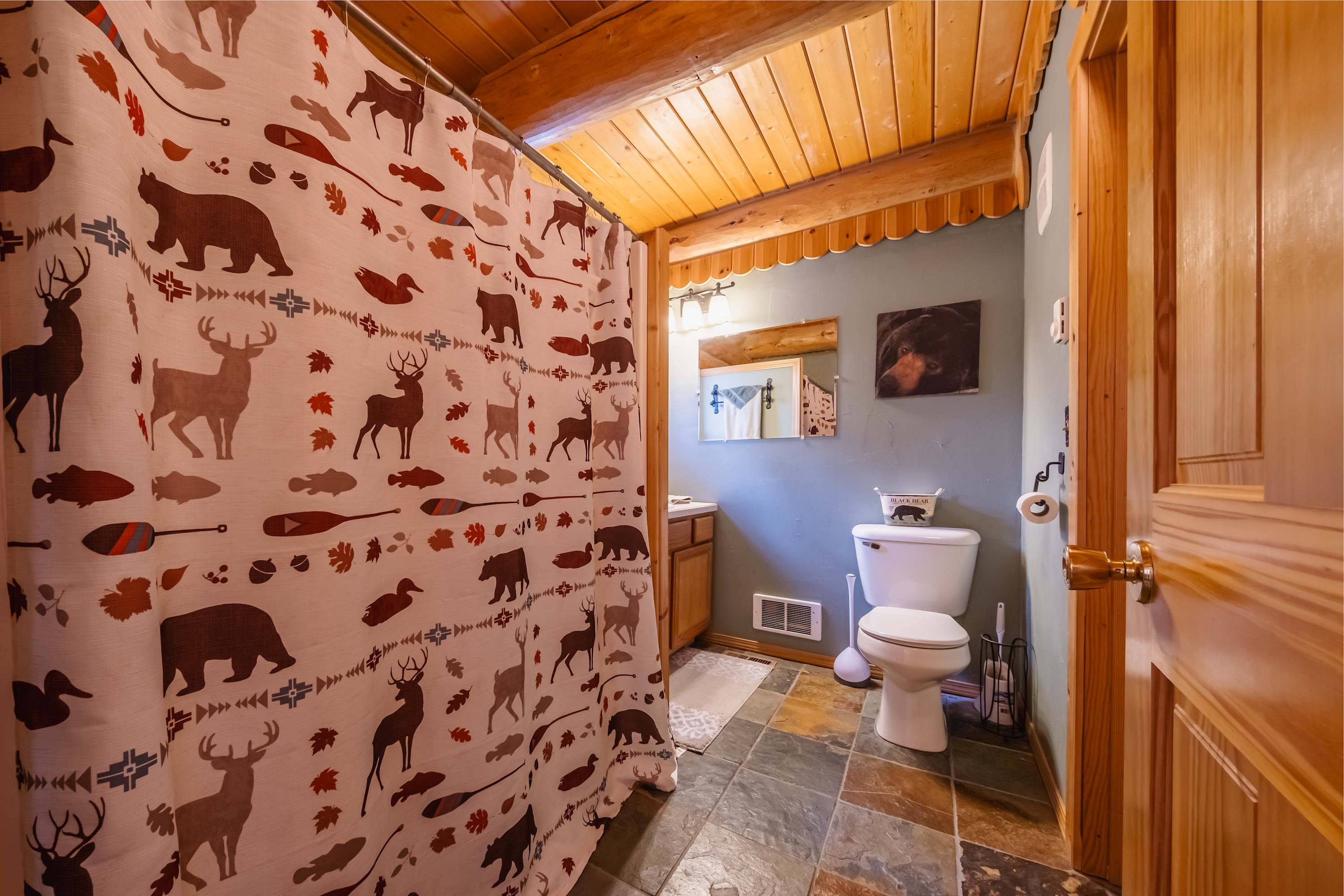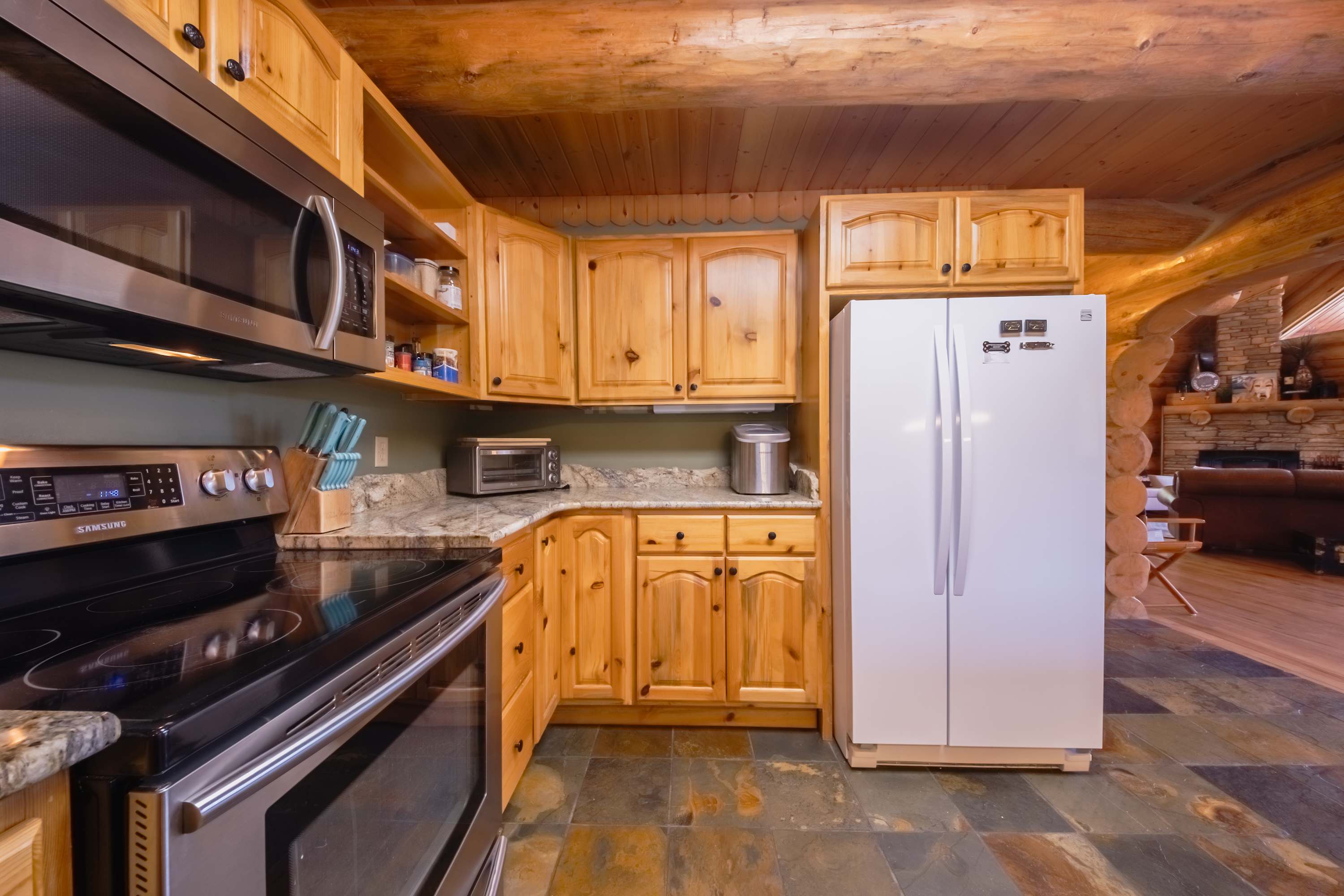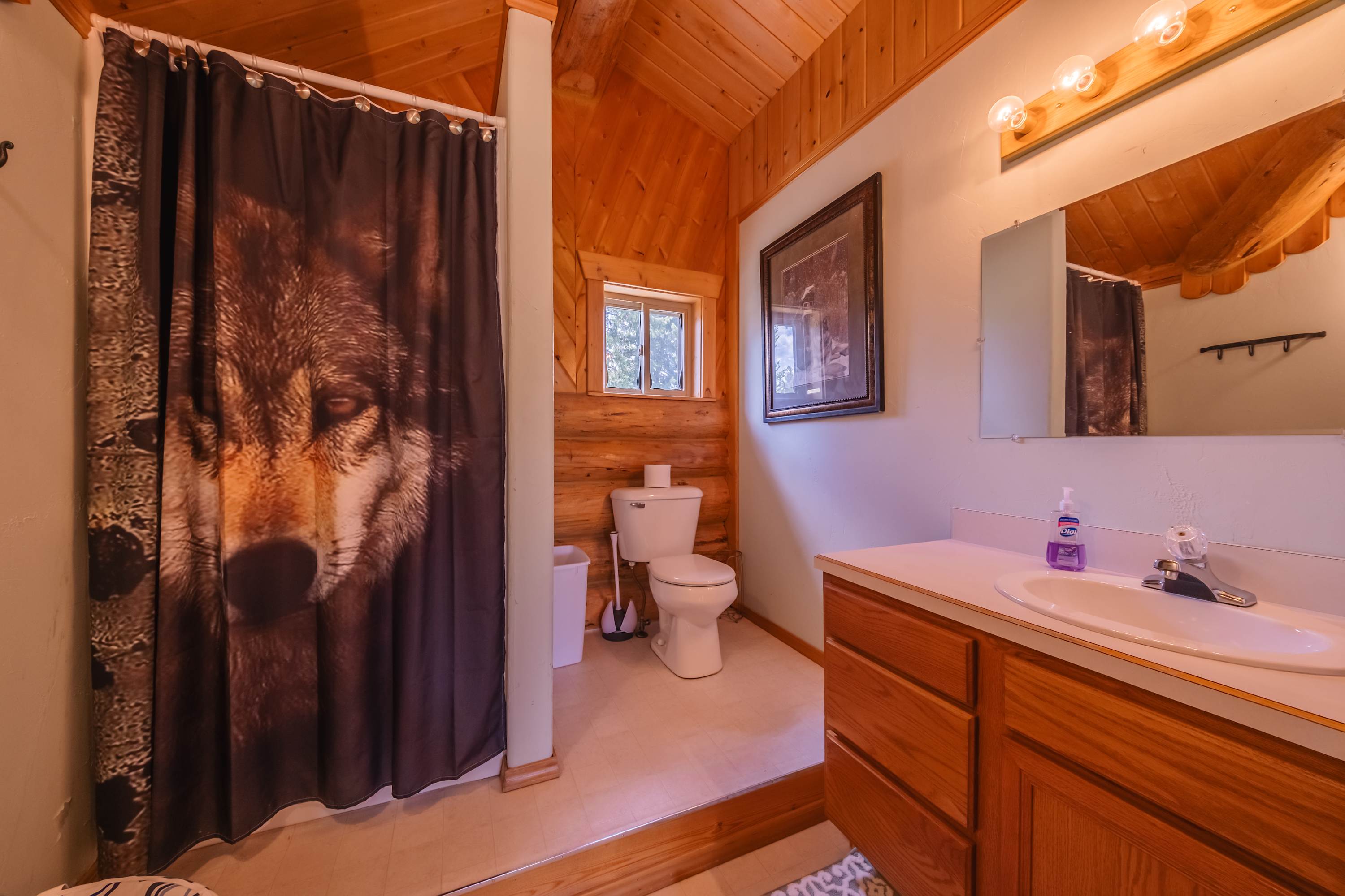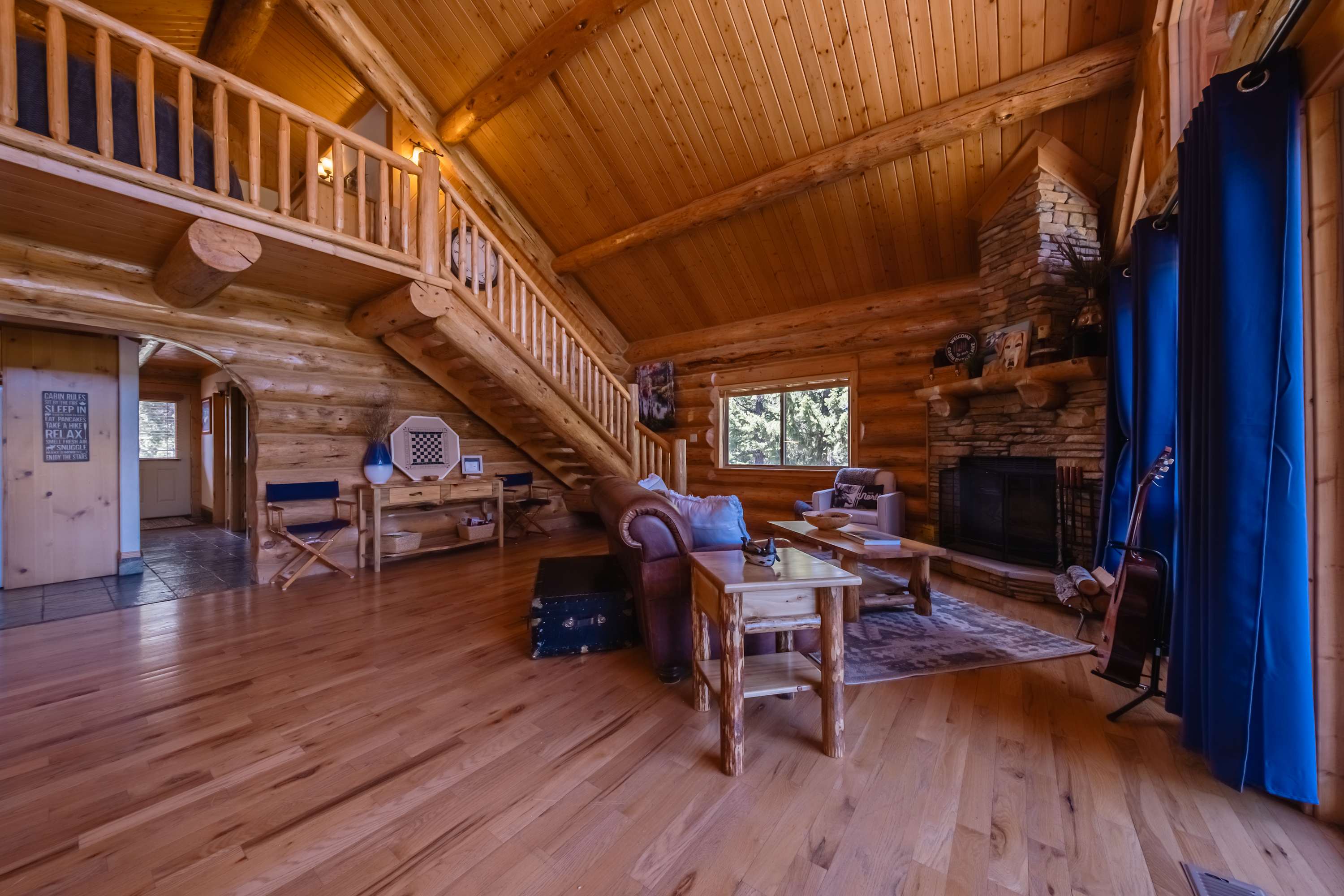 Stepping indoors, the log cabin theme is in full effect, where soaring vaulted ceilings sit atop open spaces adorned top to bottom with warm wood trim and accents creating a cozy environment for connectivity and entertainment. Gather together in the living room to swap stories of the day’s adventures, the fireplace keeping you warm and toasty during the cooler months. Steps away, the dining table seats 6 for formal meals and spontaneous game nights alike, with views of the picturesque outdoor landscape kept front and center. The fully equipped kitchen offers everything needed for creating culinary delights in the convenience of home, with ample counterspace and cabinetry assisting with preparation and storage. Up in the loft, a second living area awaits where you can enjoy surfing the channels on the TV or sneaking off for a quiet afternoon nap.