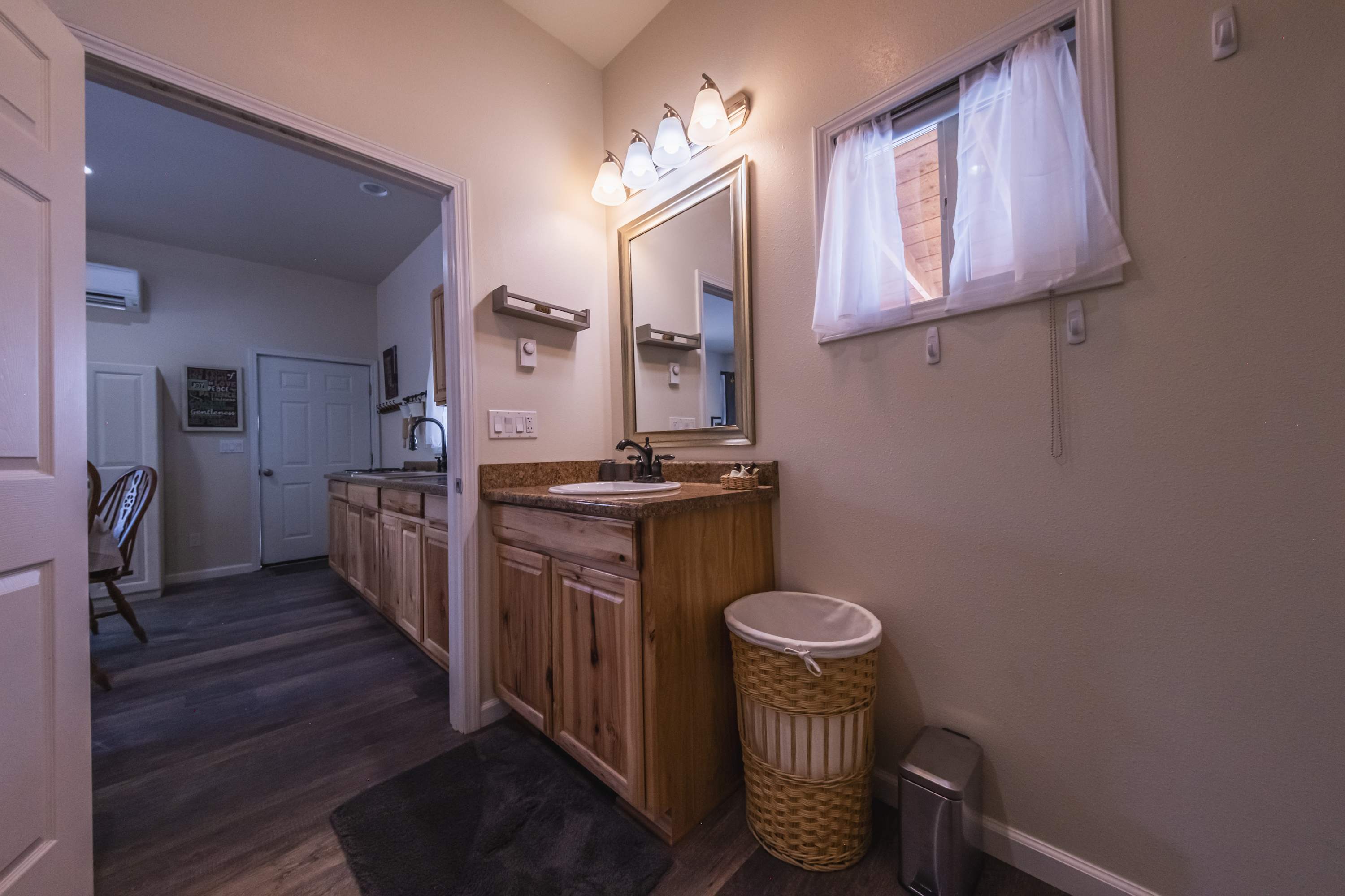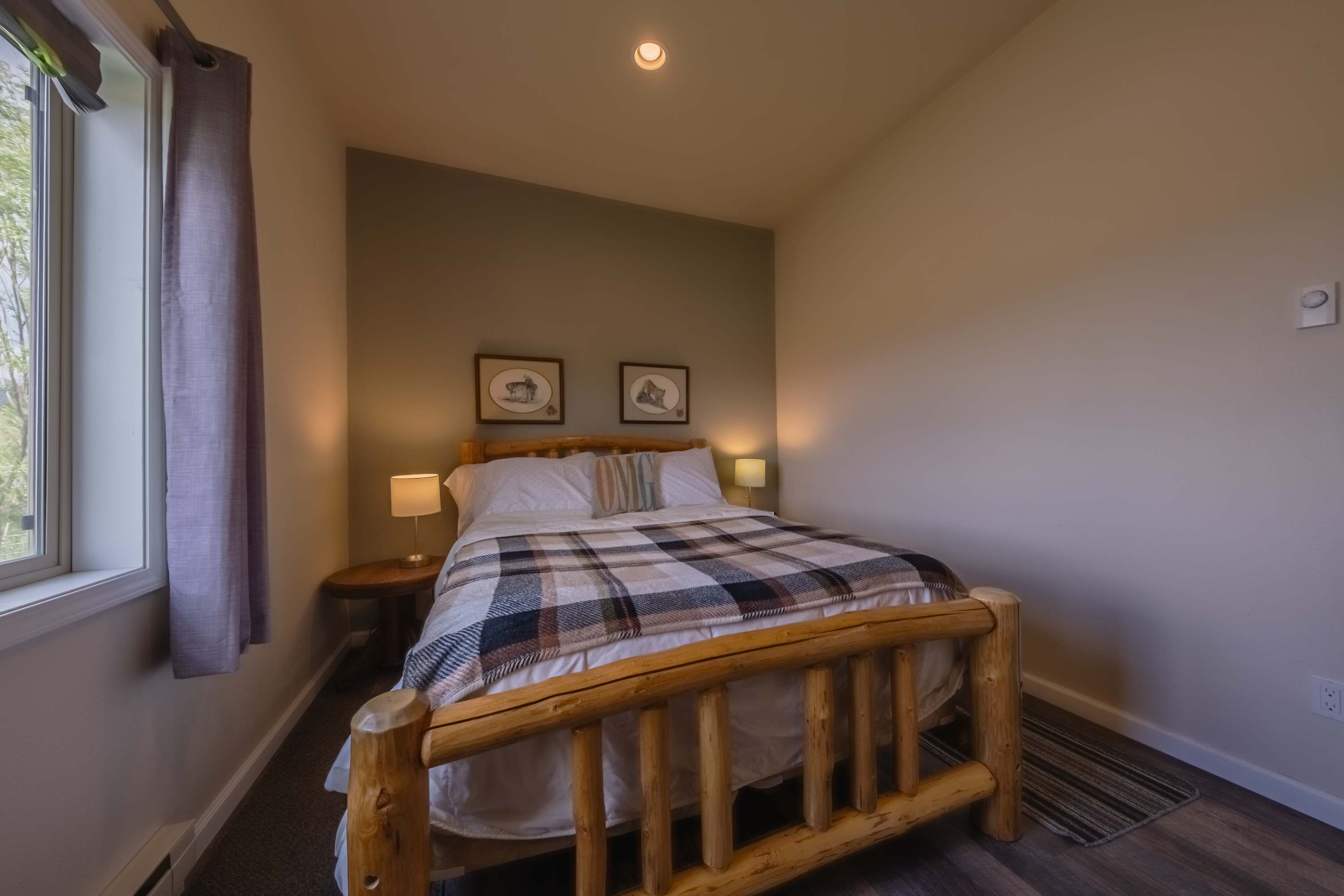 This home comfortably sleeps 2 guests in a private bedroom including a luxurious queen size bed fitted with soft blankets and crisp linens for a great night’s sleep. The full bathroom includes a single vanity and walk-in shower.
