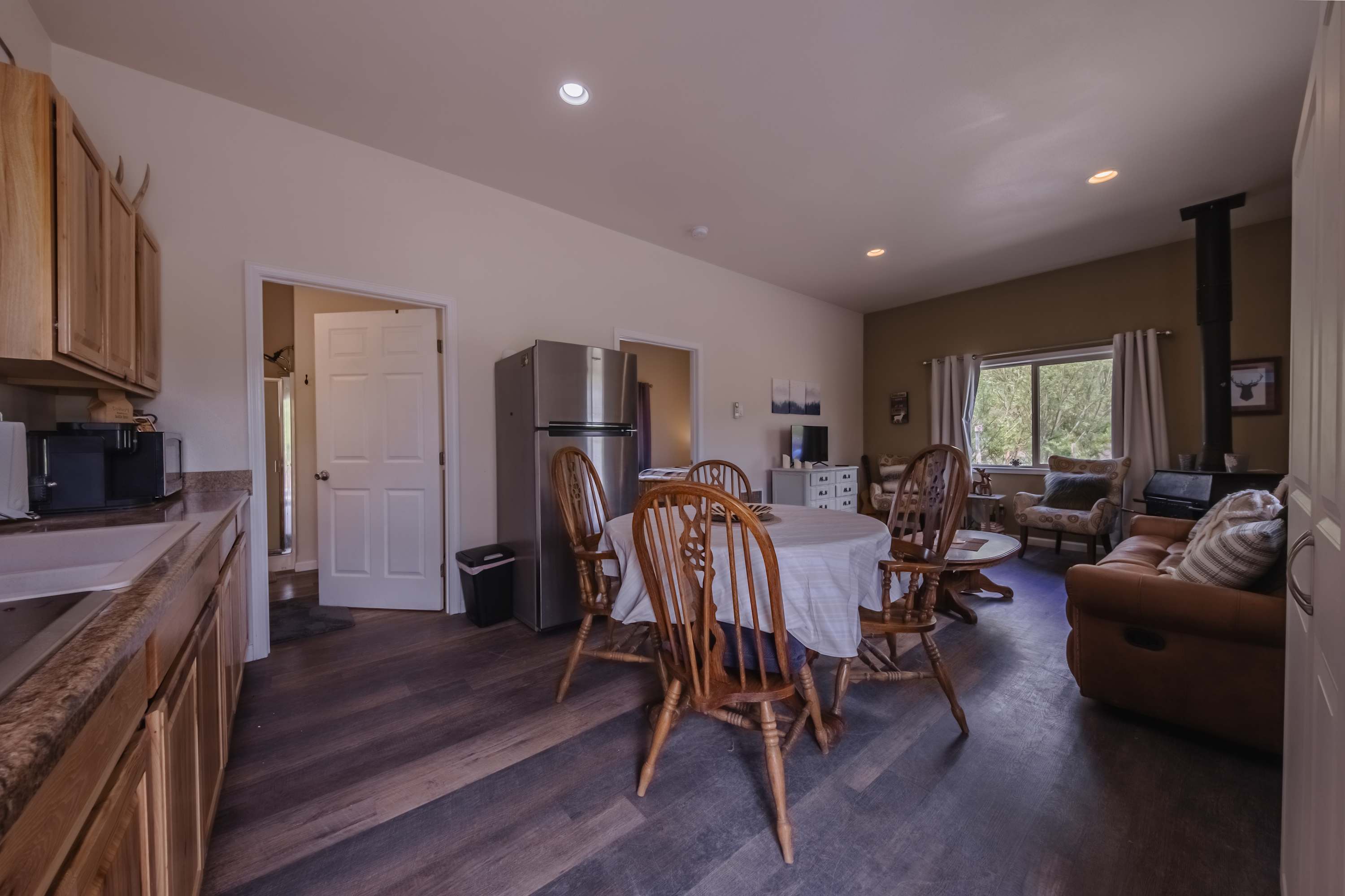 The home’s charming, country-chic interior offers plenty of space to relax and refresh, beginning with the cozy living room. Sink into plush sofa or armchair seating while you turn the pages of that new book you’ve been saving. Steps away, the well-equipped kitchen can handle all your culinary aspirations whether preparing delicious home cooked meals or staging takeout from a newly discovered local restaurant. The dining room table seats up to 4 for all your dining needs as well as offers up a space for a fun evening filled with games.