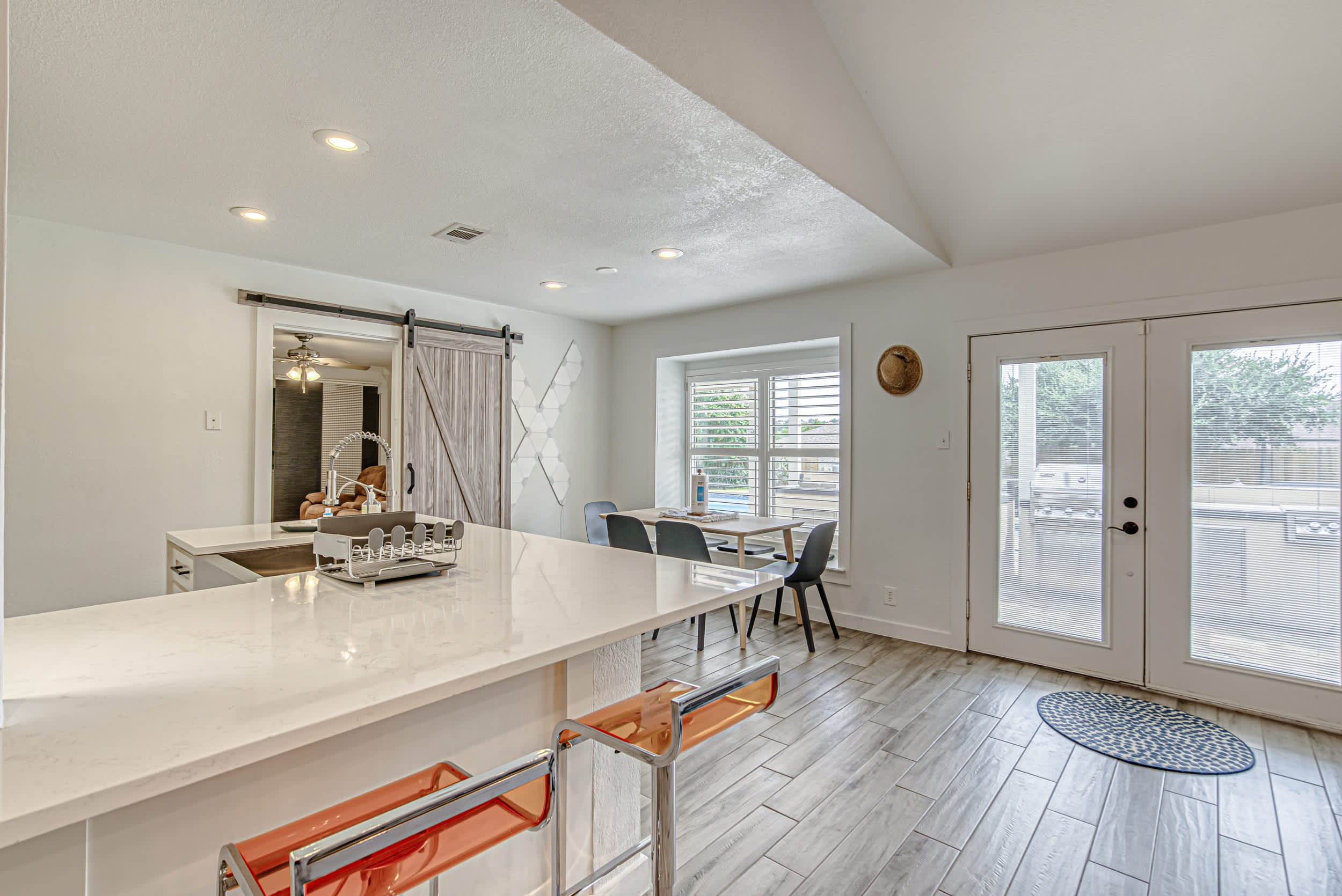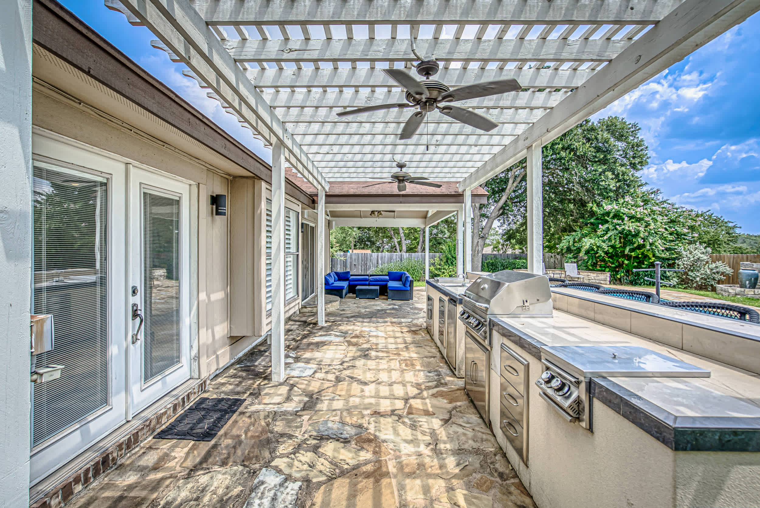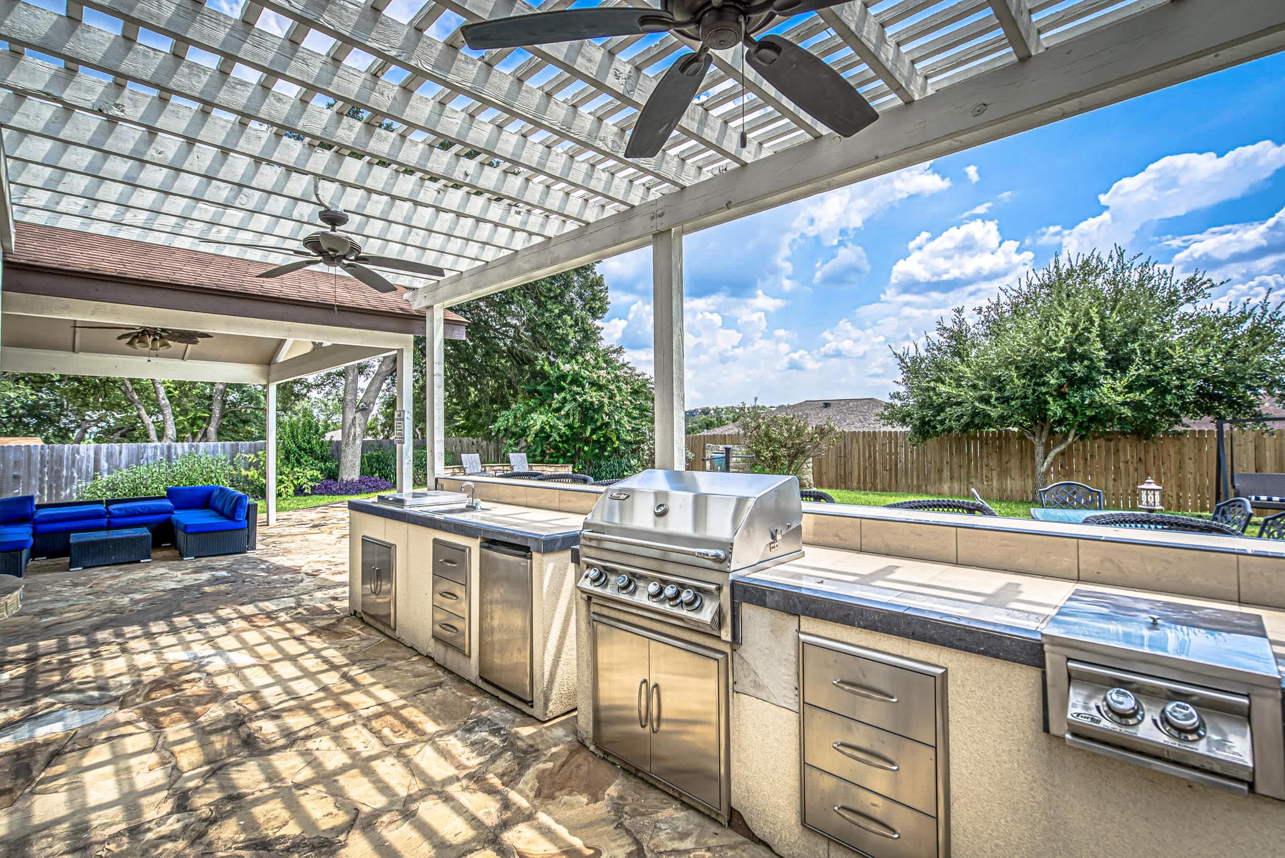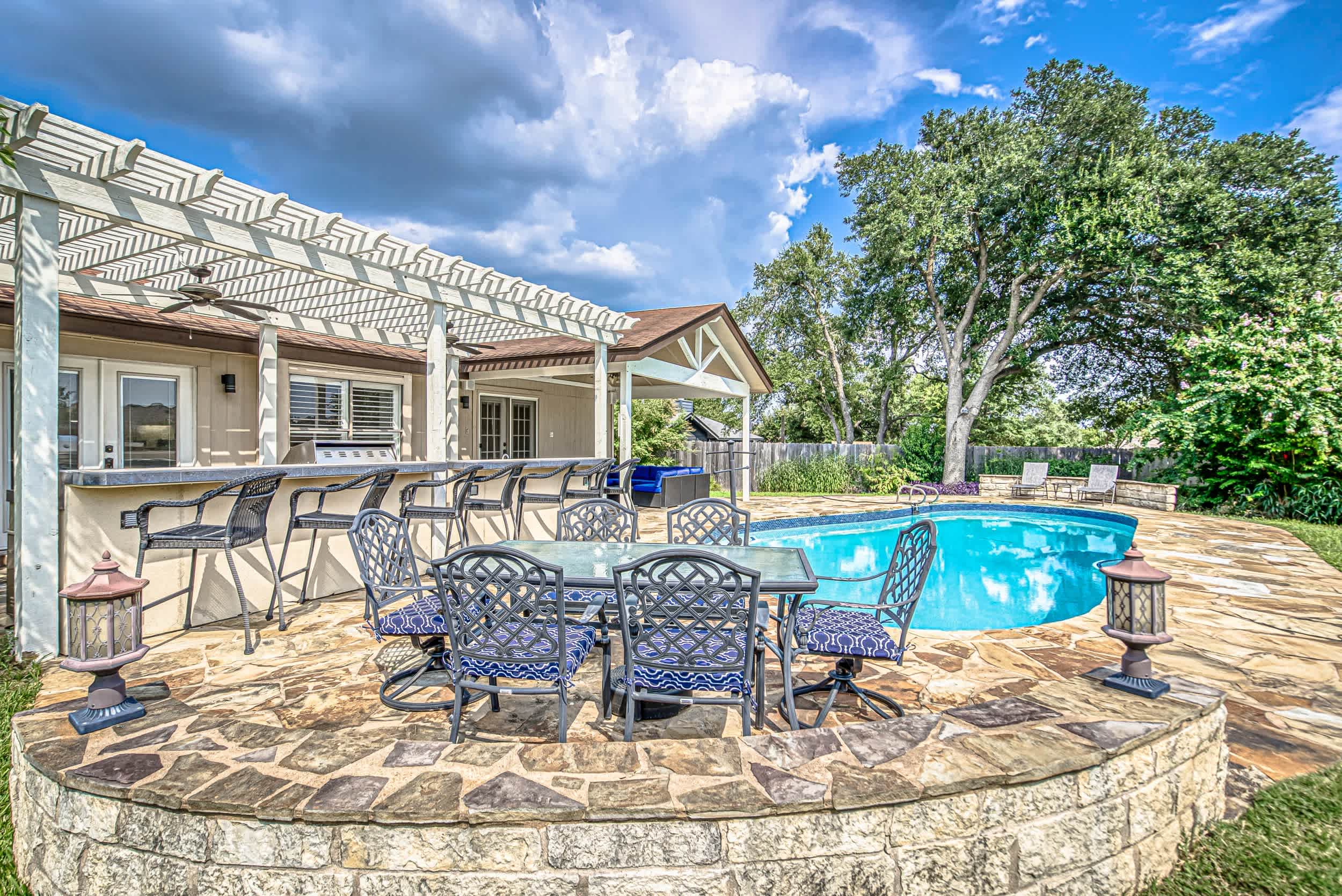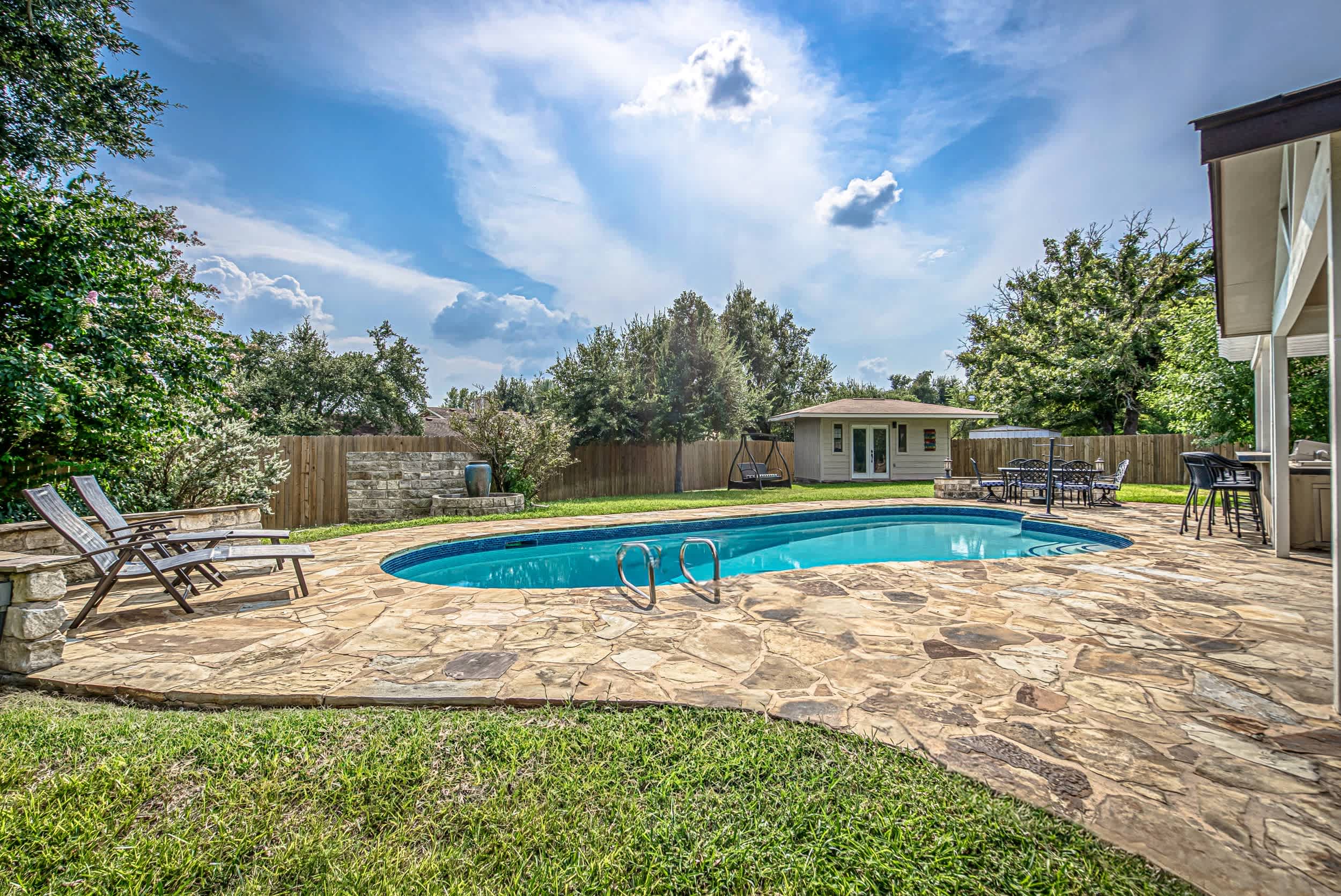 Escape to this peaceful retreat, where relaxation and convenience come together for the perfect short-term stay. Whether you're here for a weekend getaway or an extended vacation, this home provides everything you need to unwind and enjoy Austin. Spend your days soaking up the Texas sun in your private, fenced-in backyard, sipping cocktails by the sparkling salt water inground pool, or enjoying a meal prepared in the outdoor kitchen and bar. The spacious patio features shaded lounging areas and ample seating for al fresco dining, making it the ideal setting for quality time with loved ones.