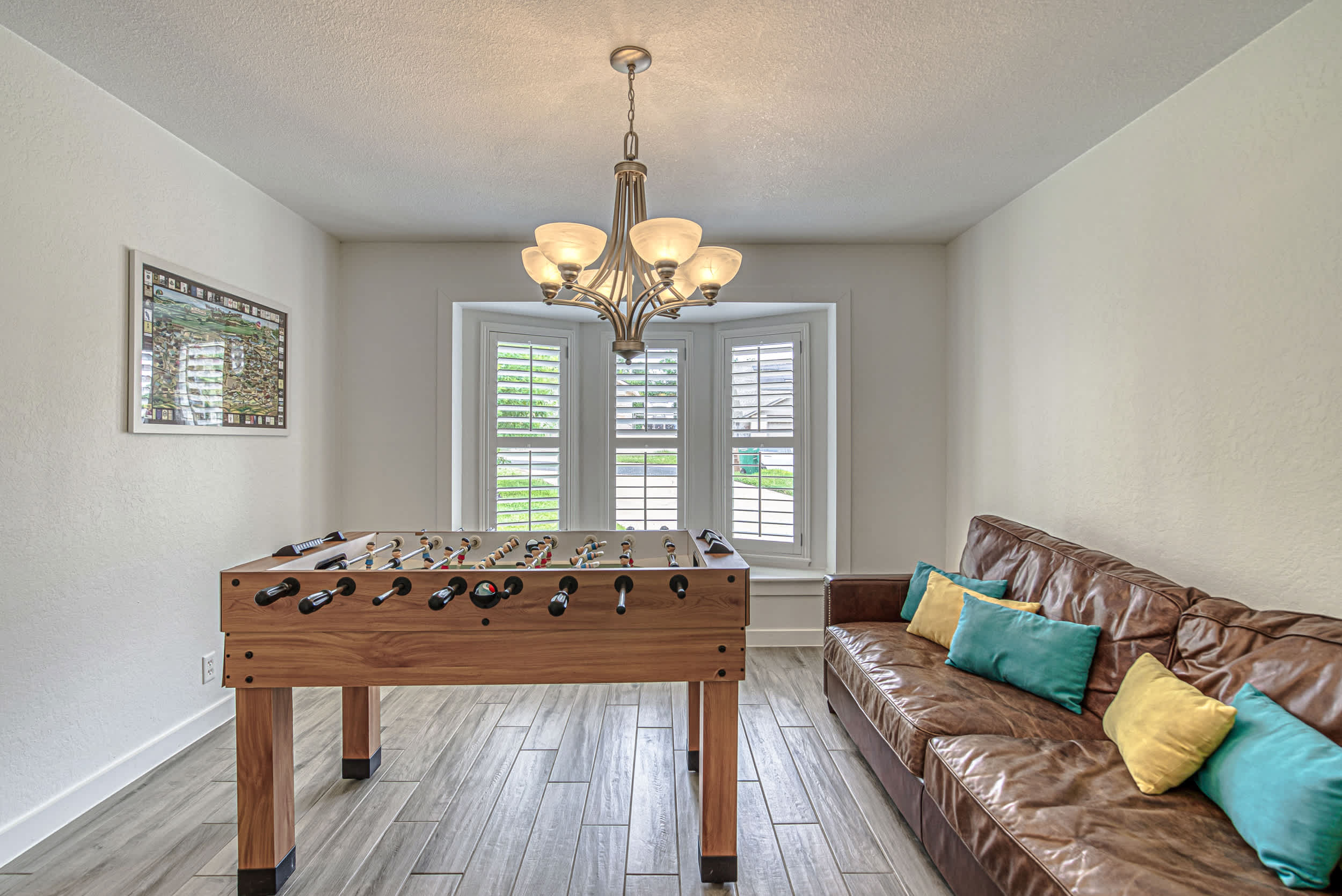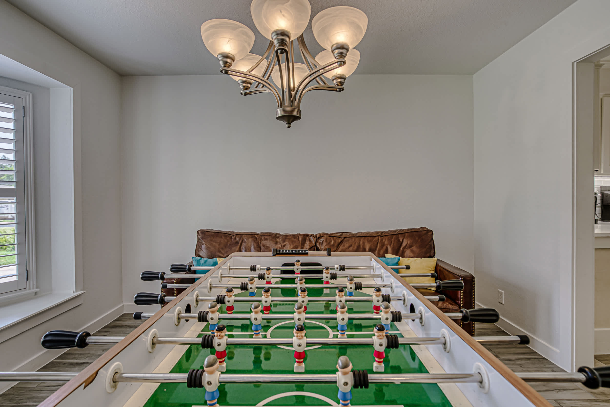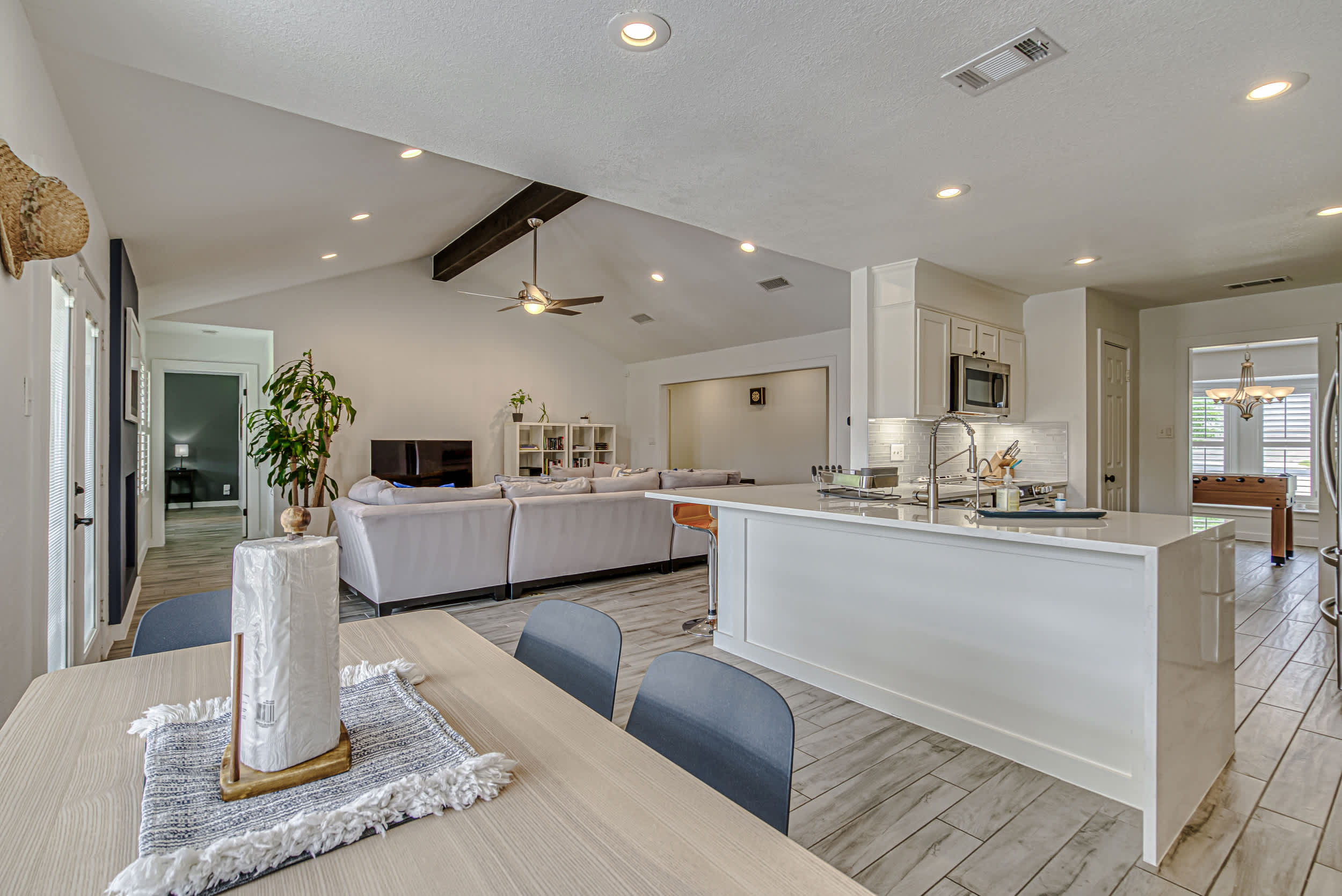 Inside, modern amenities and stylish furnishings create a welcoming atmosphere for relaxation. Gather in the living room on the plush L-shaped sofa for a family movie night or binge-watch your favorite shows on the smart TV. The den offers a more private space for reading, catching up on work at the dedicated desk, or enjoying a family game night. Challenge your friends to a round of foosball while the chef of the group prepares a delicious meal in the sleek, fully equipped kitchen with stainless steel appliances, glossy stone countertops, and stocked cabinetry. Whether you’re dining at the formal table or keeping things casual at the breakfast bar, you’ll always be in good company.