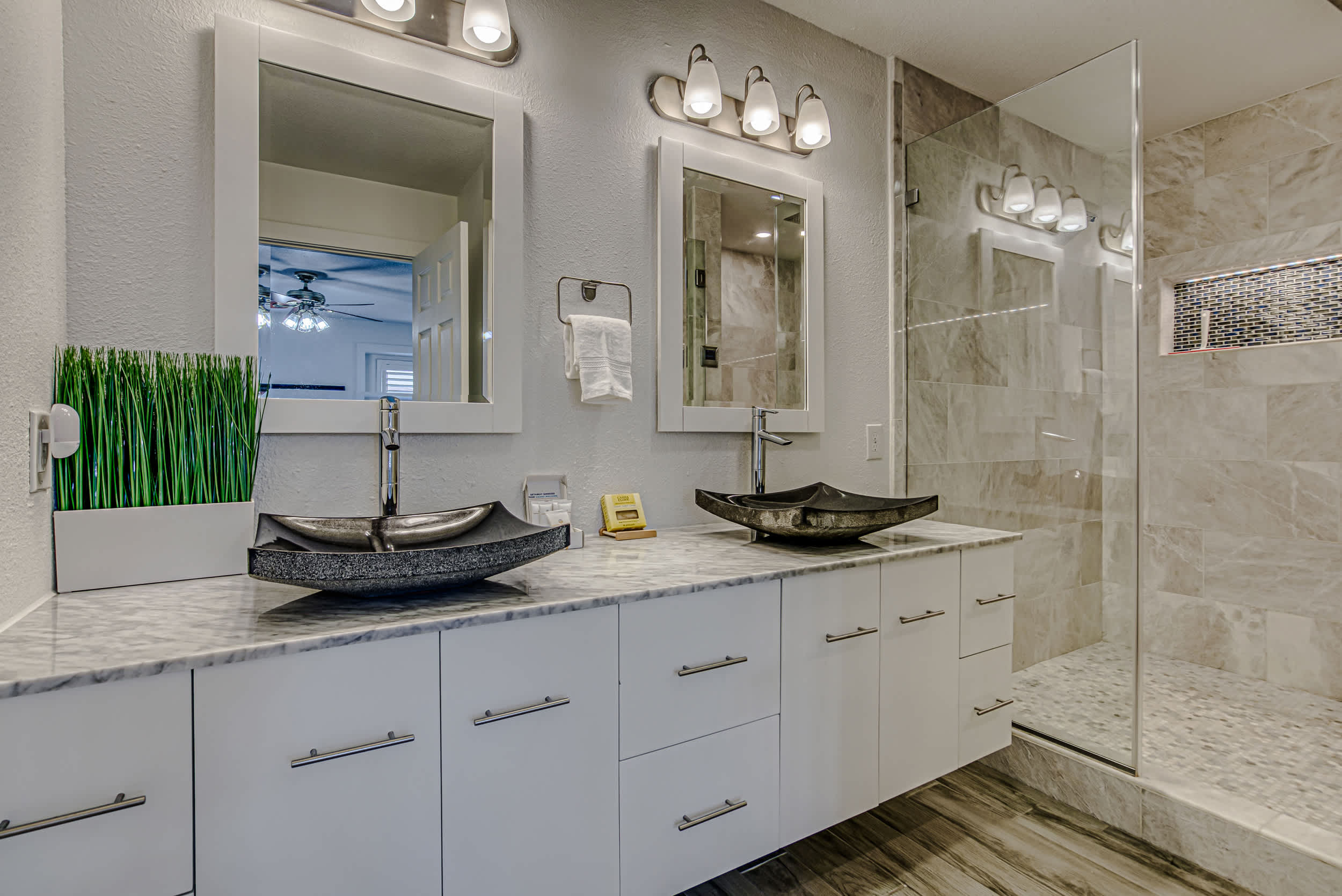 - Bedroom #3: King-size bed with an ensuite bathroom featuring a dual vanity and spa-like glass walk-in shower