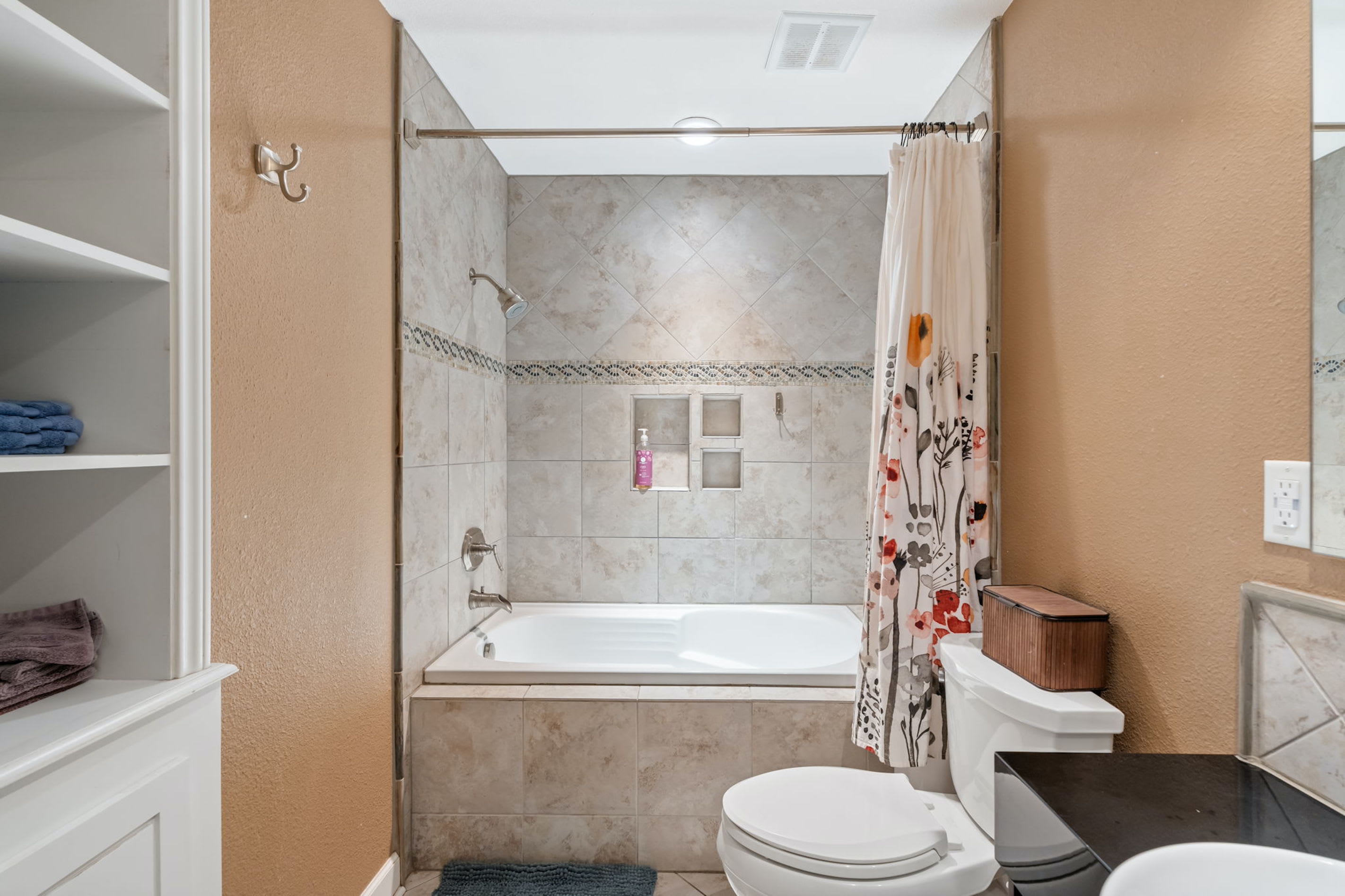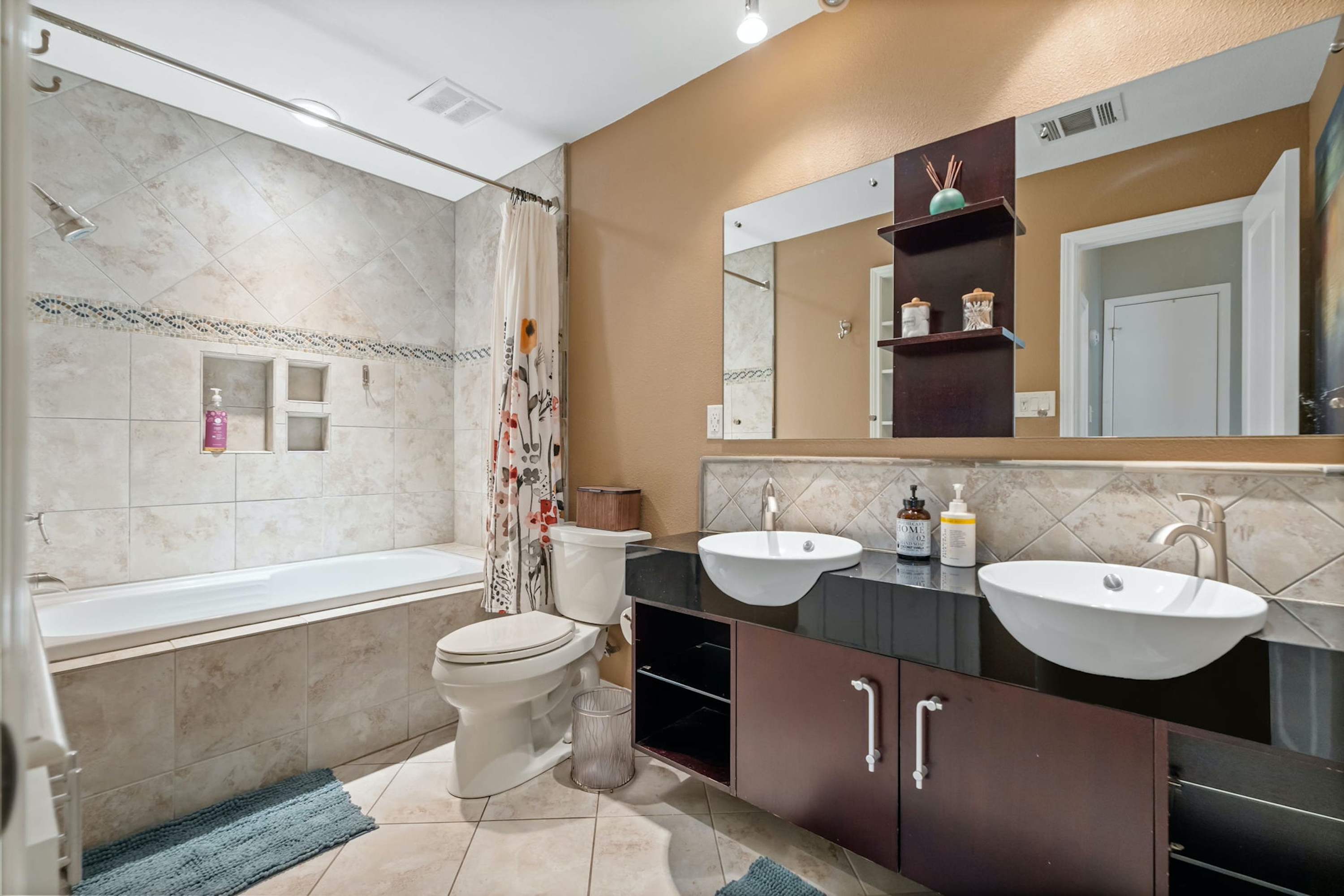 The home’s full guest bathroom includes a stylish dual vanity and shower/tub combo.