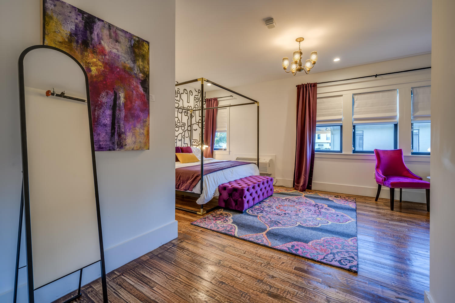 Suite 204 - Experience the ultimate in luxury and artistry with a stay in Suite 204, a top-floor executive suite that will take your breath away. The suite features a stunning array of original murals and cold wax paintings by local artists, creating a truly unique and inspiring atmosphere. Inside the suite, you'll find two comfortable sleeping areas, each with a king-size bed, smart TV, and writing desk, making it perfect for families or groups of friends. The walls between the sleeping areas provide partial privacy, while still allowing for a sense of openness and flow throughout the space. The ensuite bathroom boasts a spacious walk-in shower and premium amenities, ensuring you feel pampered and refreshed throughout your stay. The room's eclectic design and unique color palette make for an unforgettable and inspiring experience.