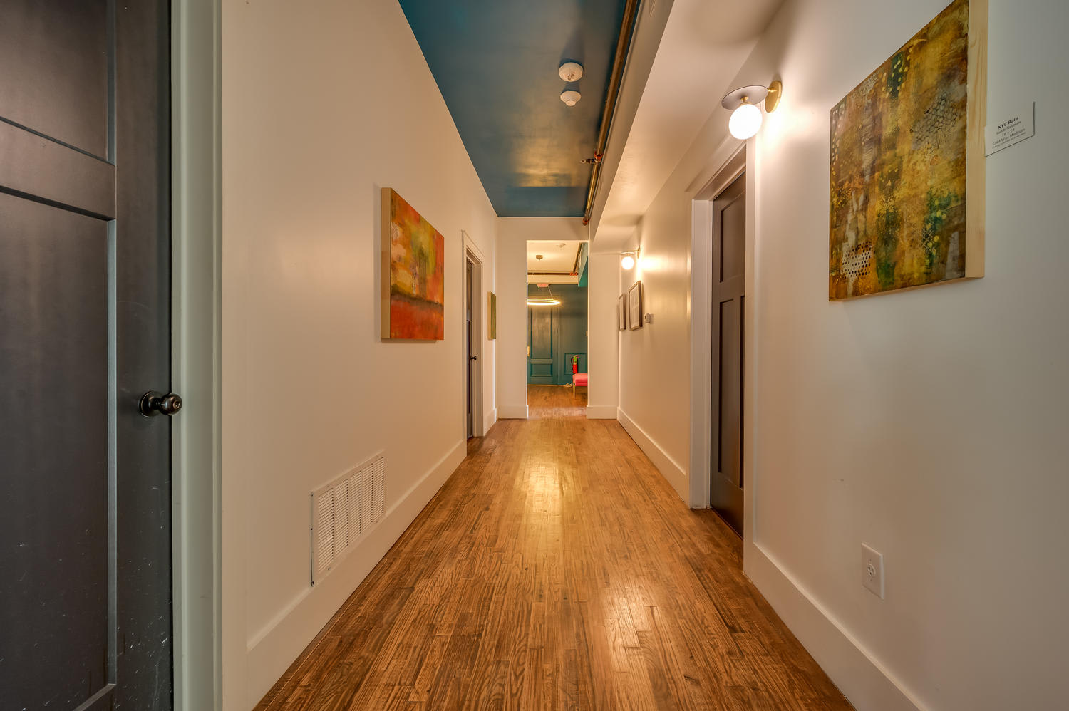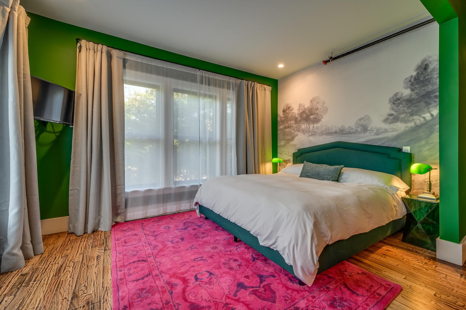 Suite 204 - Experience the ultimate in luxury and artistry with a stay in Suite 204, a top-floor executive suite that will take your breath away. The suite features a stunning array of original murals and cold wax paintings by local artists, creating a truly unique and inspiring atmosphere. Inside the suite, you'll find two comfortable sleeping areas, each with a king-size bed, smart TV, and writing desk, making it perfect for families or groups of friends. The walls between the sleeping areas provide partial privacy, while still allowing for a sense of openness and flow throughout the space. The ensuite bathroom boasts a spacious walk-in shower and premium amenities, ensuring you feel pampered and refreshed throughout your stay. The room's eclectic design and unique color palette make for an unforgettable and inspiring experience.