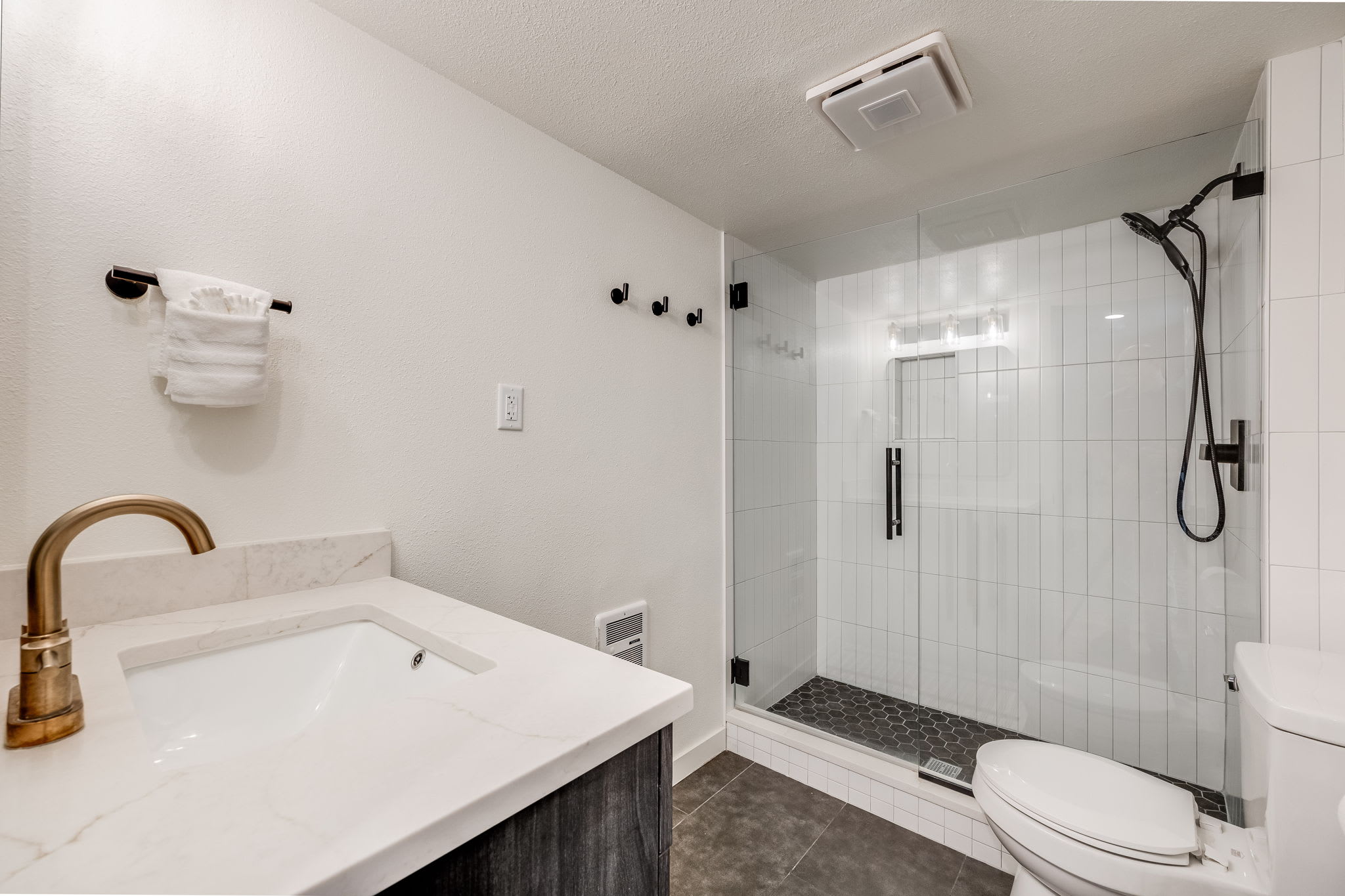 • Bathroom 1 (hall): Single vanity, glass walk-in shower