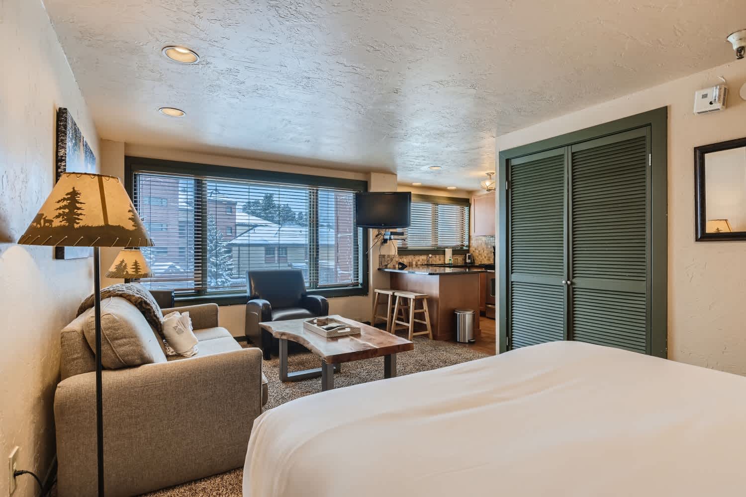 Settle into a straightforward, comfortable studio setup ideal for a couple, small family, or a few friends. The open-plan living/sleeping area includes a queen bed and a sleeper sofa, plus a full bathroom. When you’re not out on the mountain or exploring downtown, take advantage of on-site community perks at the Village at Breckenridge, including an indoor/outdoor pool, multiple hot tubs, a sauna, fitness room, and game room. WiFi is provided, and on-site garage parking is available for one vehicle.