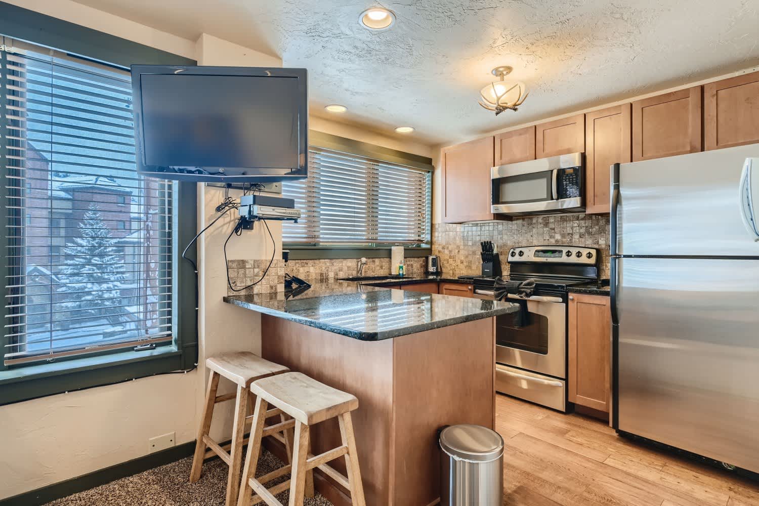 • Prime location: about a 5-minute walk to the Peak 9 base/Quicksilver SuperChair and Ski & Ride School.
