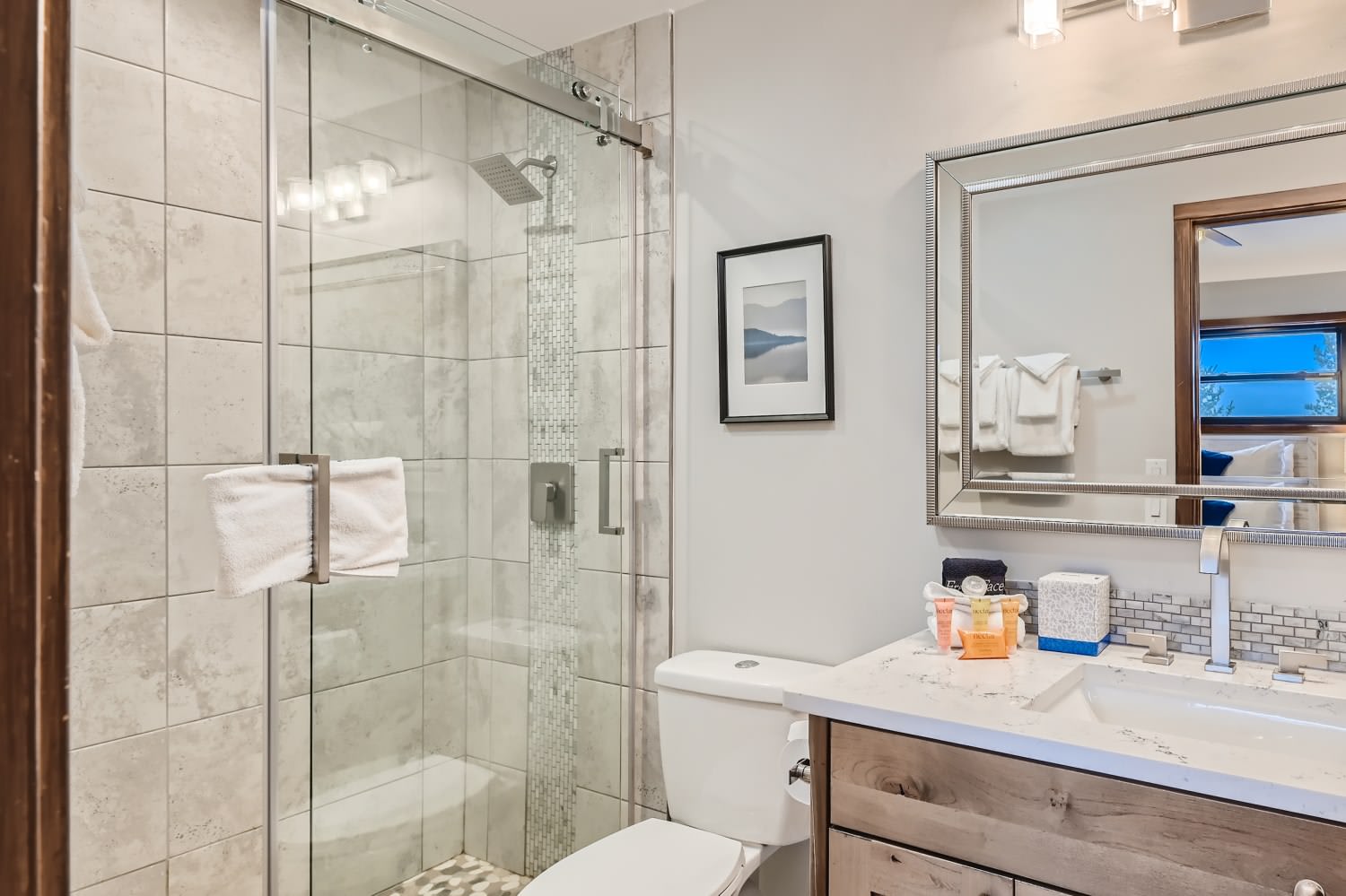 • Bedroom 2 (Primary): Queen bed, smart TV, ensuite bathroom with walk-in shower