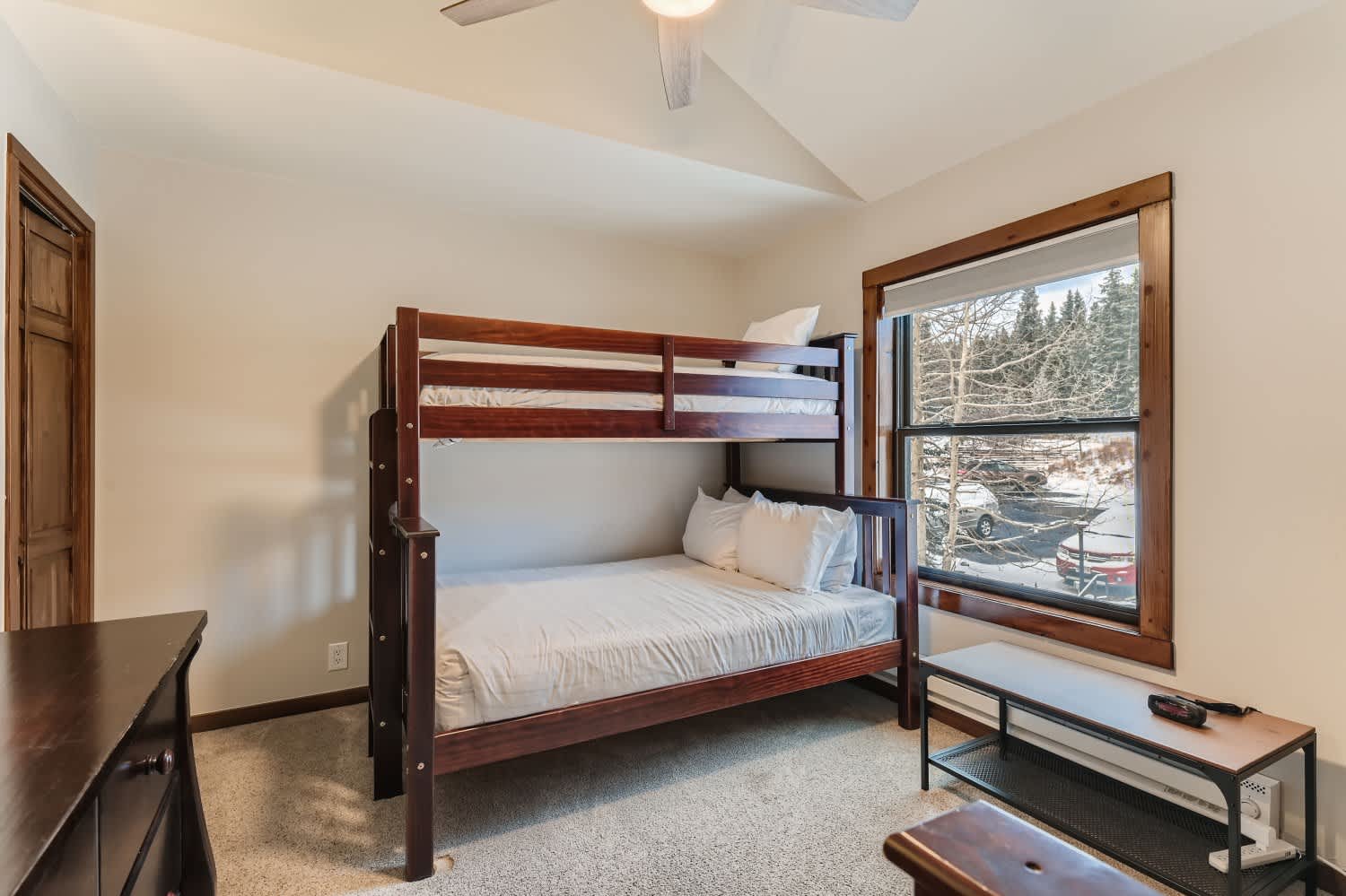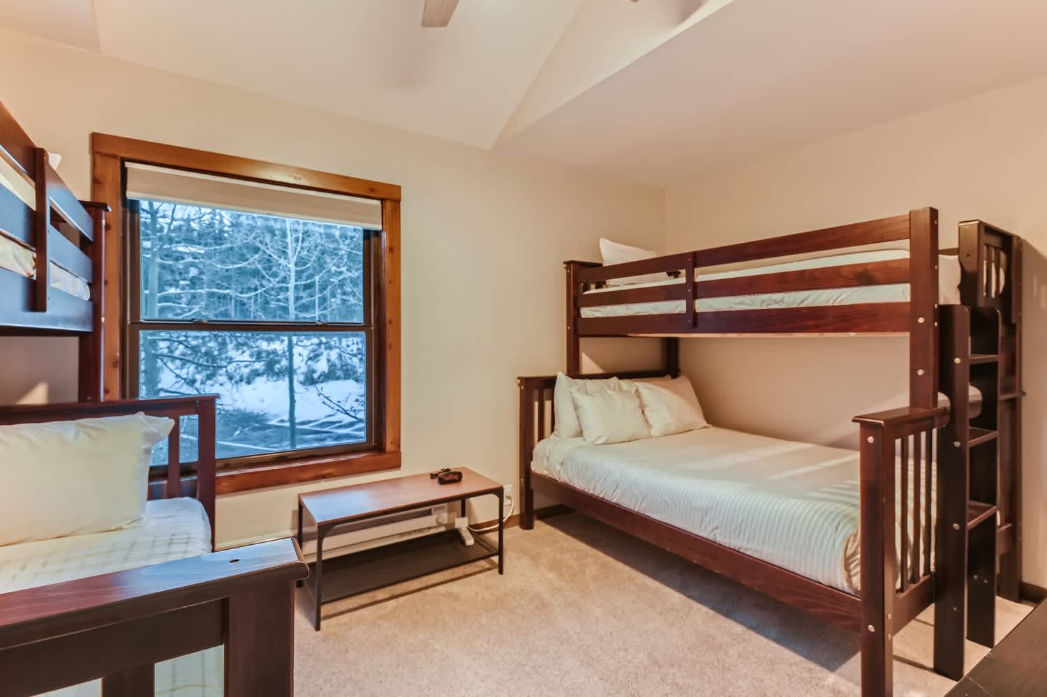 • Bedroom 1 (Bunk Room): Two bunk beds, each with a full-size bed on the bottom and a twin-size bed on top