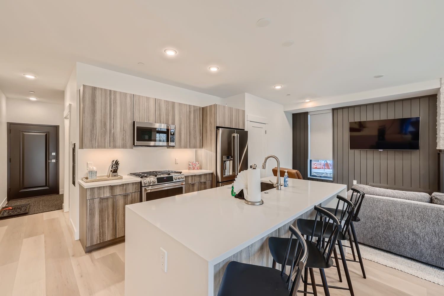 Set up for comfort and simplicity, this modern condo is a great fit for families or small groups. Sleep up to 6 across two bedrooms plus a living room sleeper sofa. The primary suite features a king bed and ensuite bath, while the second bedroom with a full-over-queen bunk is ideal for kids or friends. Unwind in the living area between outings, and take advantage of in-home essentials like WiFi and a private washer/dryer. Enjoy access to a communal hot tub when you’re ready to relax after a day of exploring Summit County.