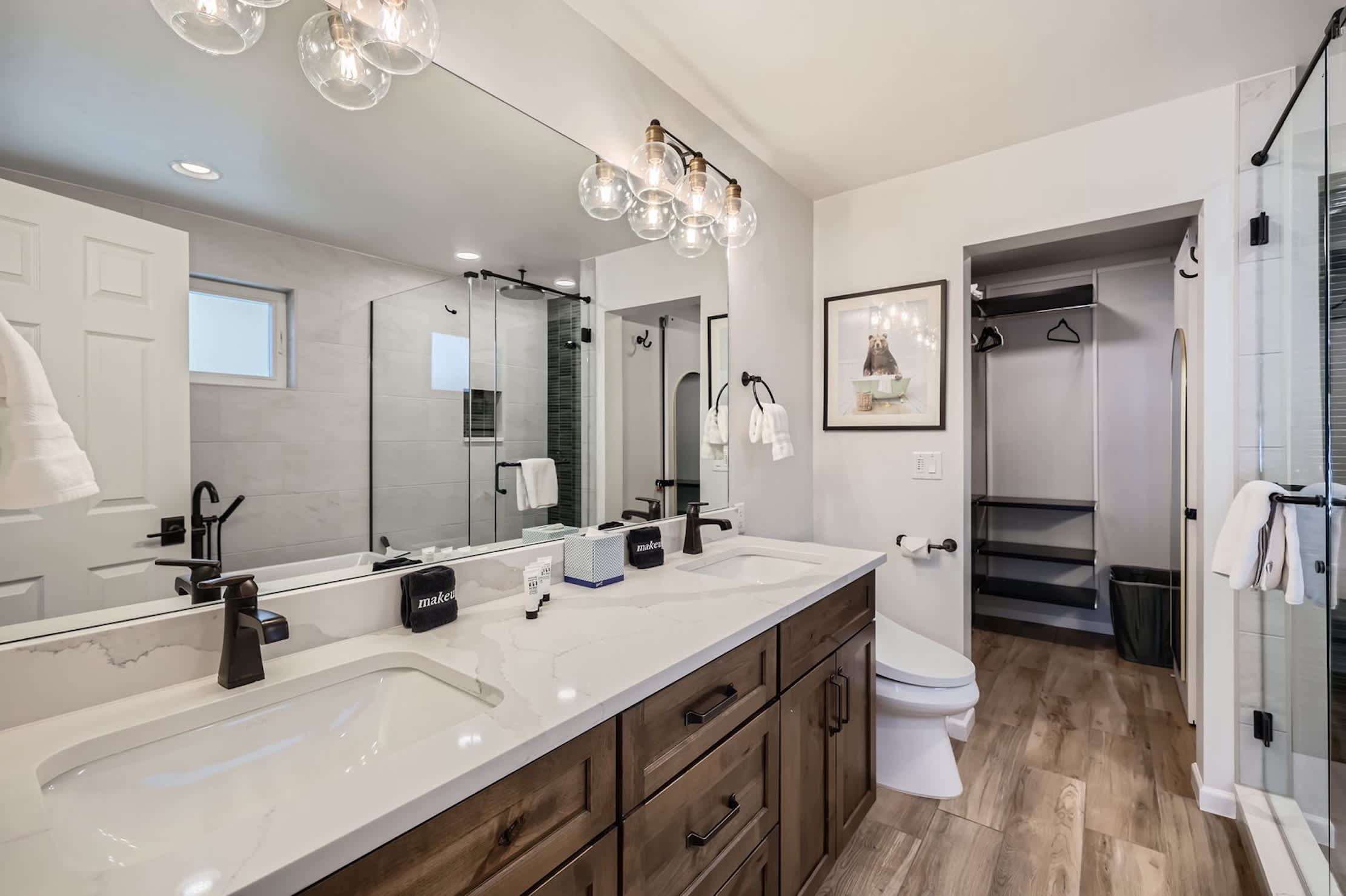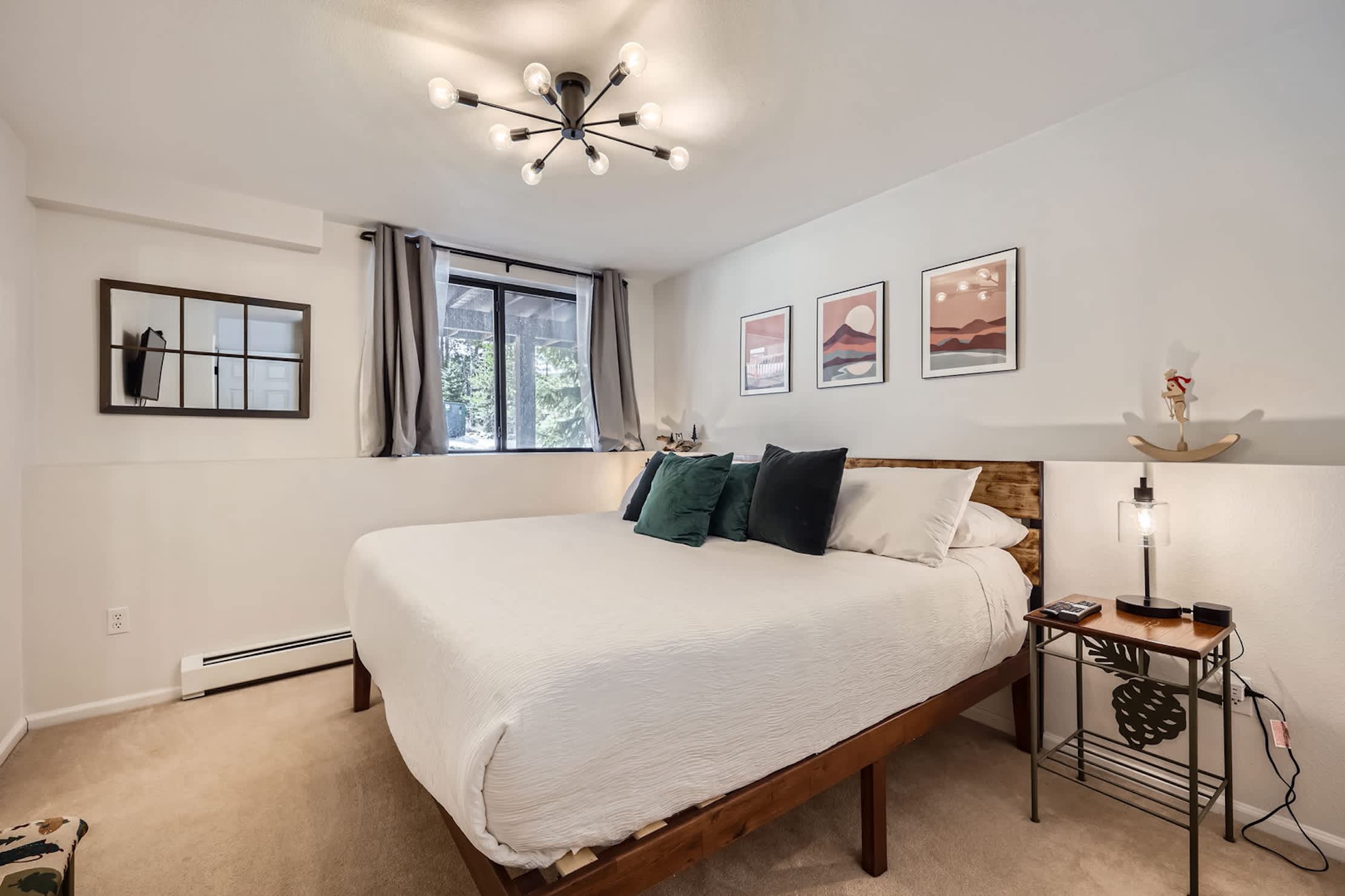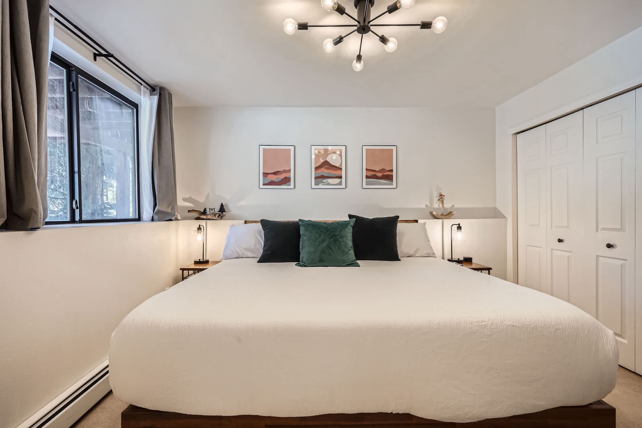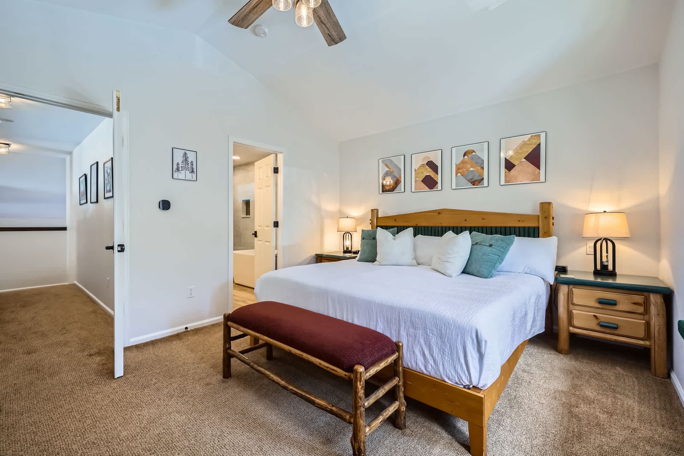 • Bedroom 1: King bed, reading nook, office area, and remodeled ensuite bathroom
