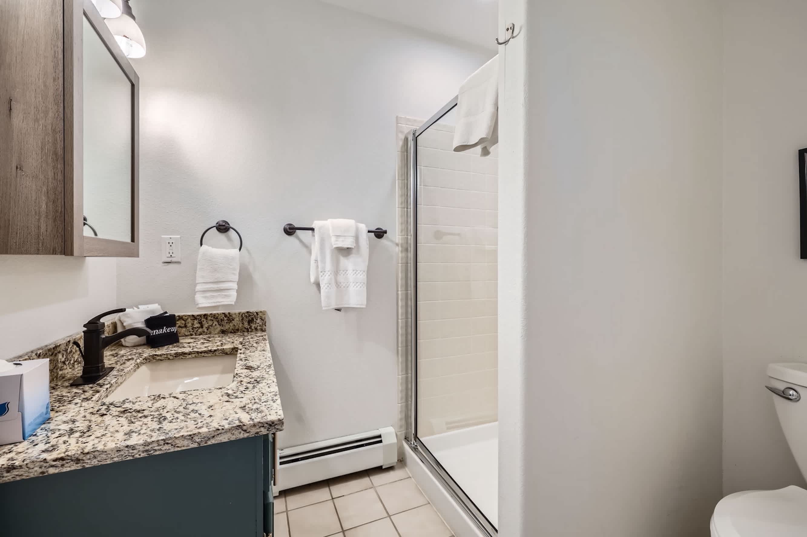 • Den: Queen-size sleeper sofa; a full bathroom is on the same level