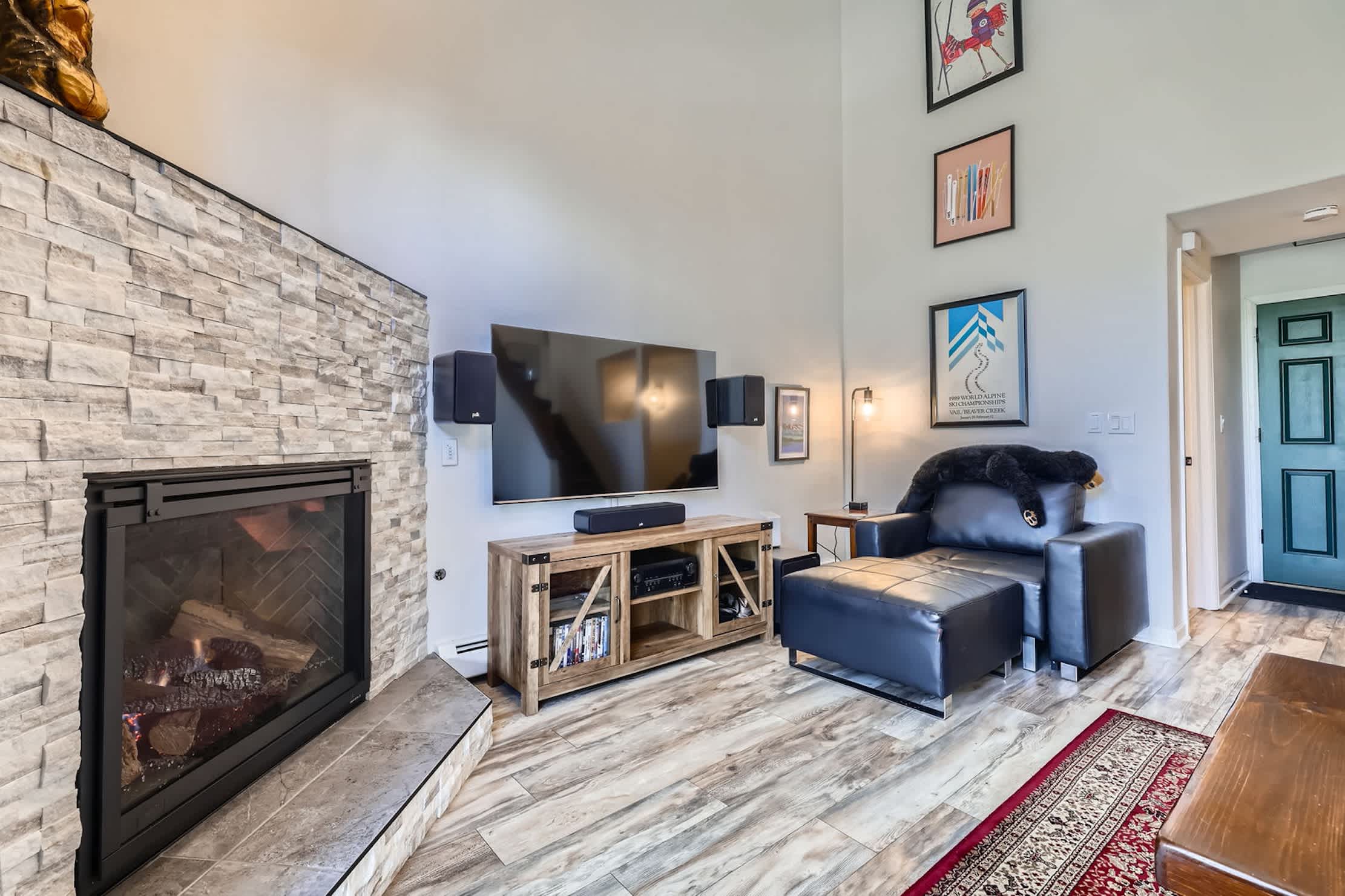 • Cozy living room with gas fireplace and large TV + home theater surround sound