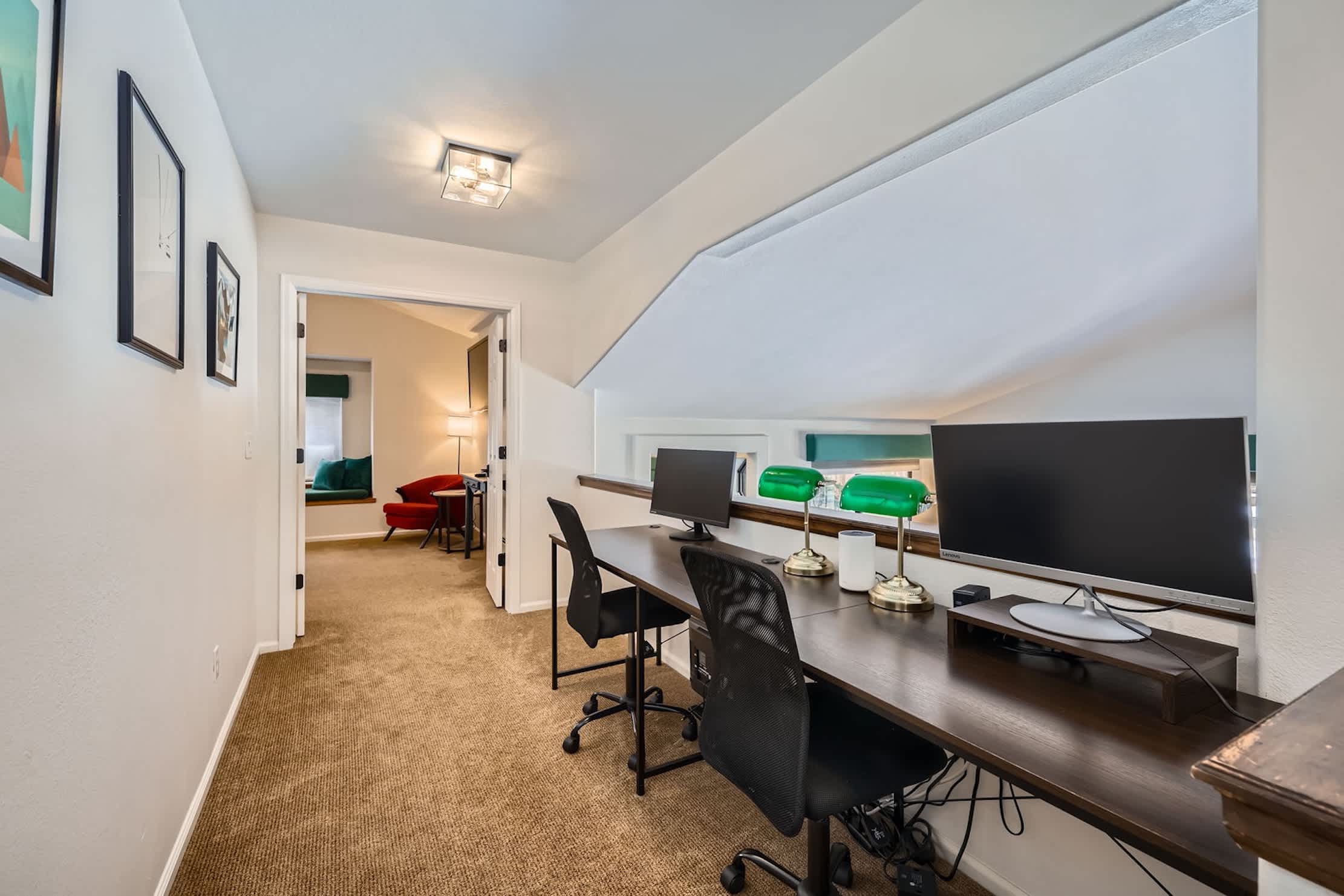 • Desk area for two with dual external monitors + high-speed Wi-Fi