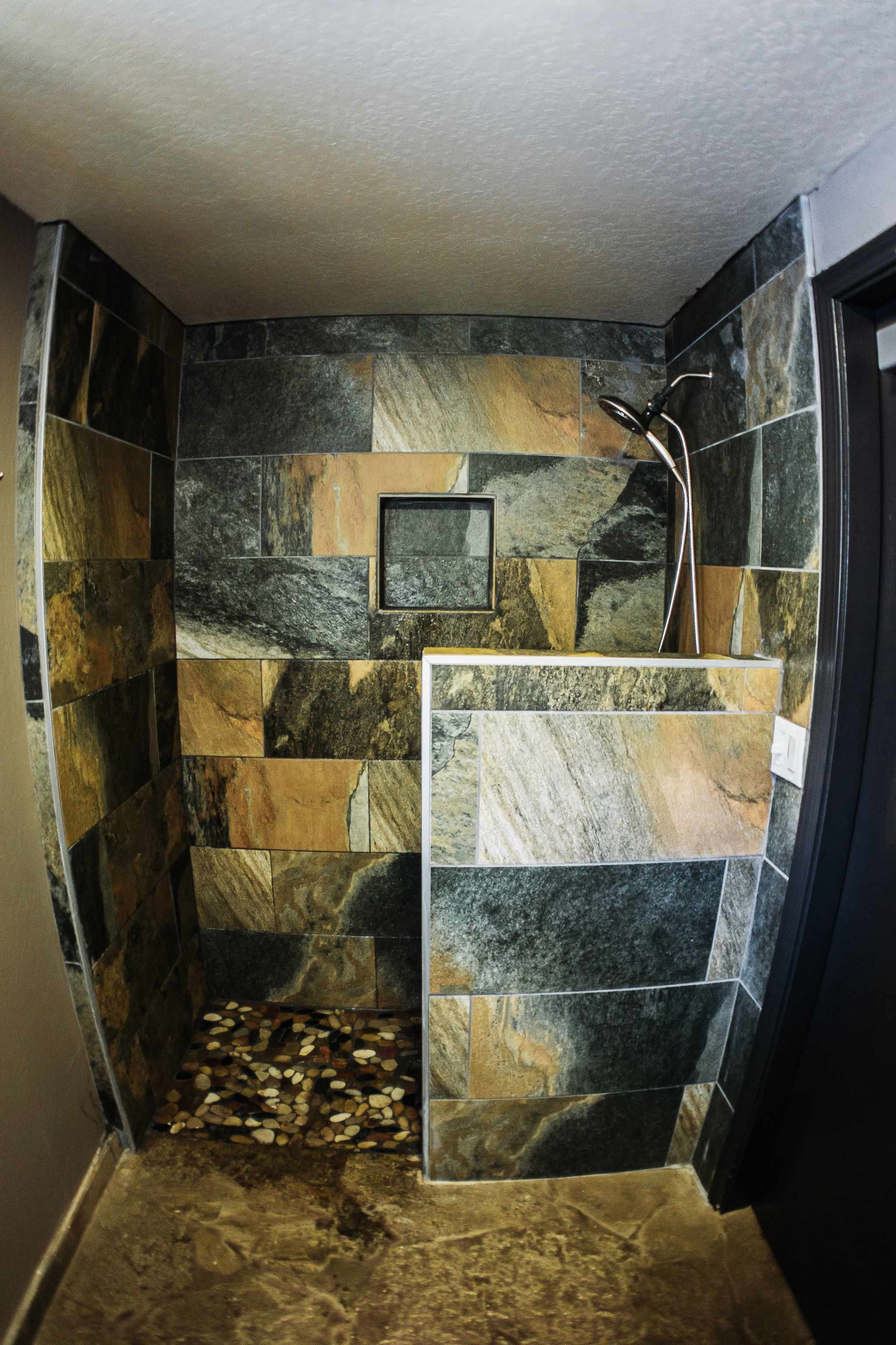 • Bedroom 1: King bed, small flat-screen TV, ensuite bathroom with standalone walk-in shower and large vanity