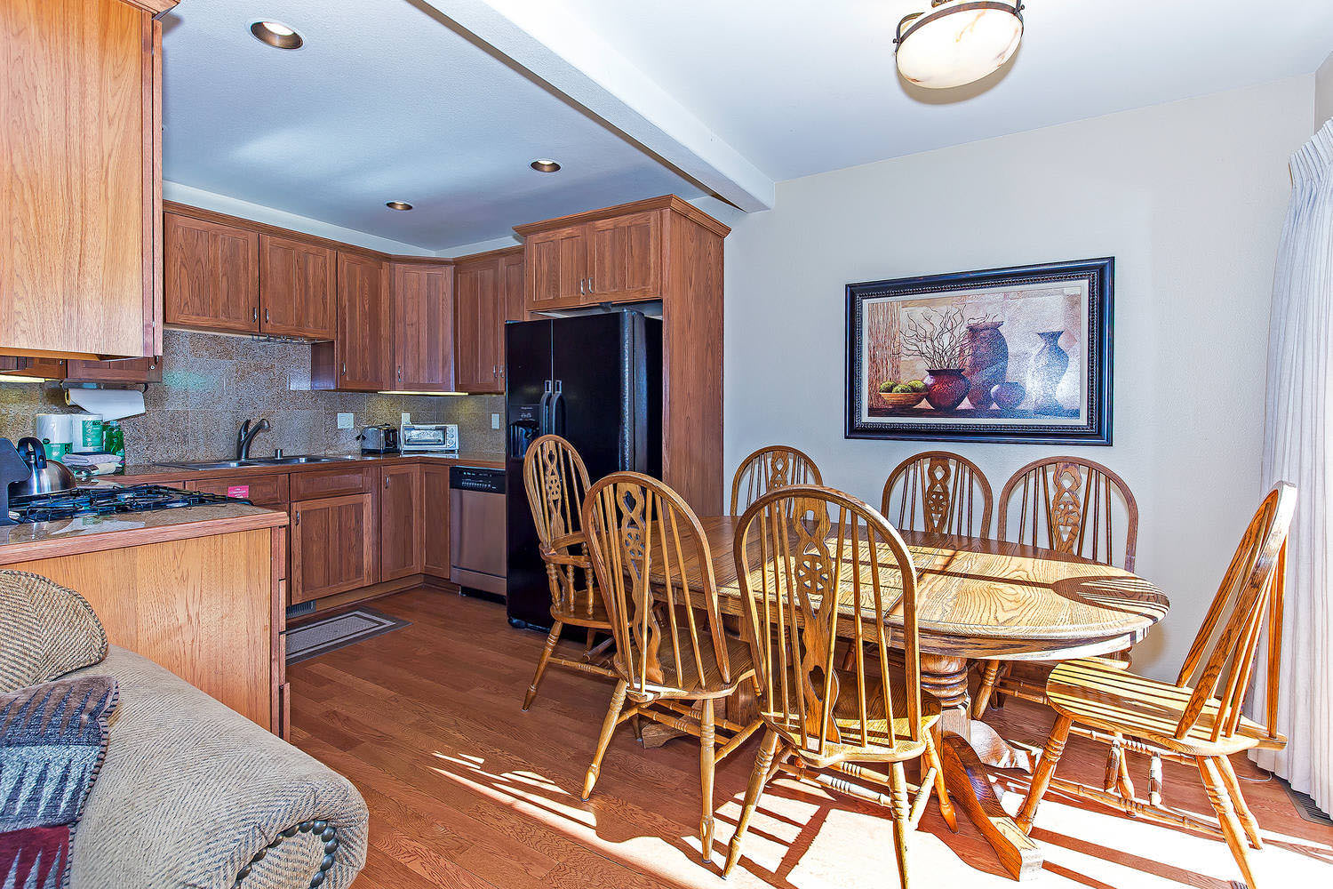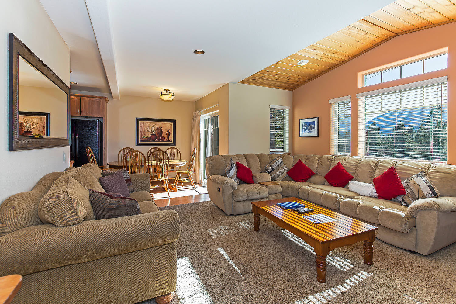 Entering into this Mammoth Lakes vacation home guests will find a spacious open floor plan. This common living space has a living room, kitchen, dining area, and sunny balcony. The living room has an ample amount of seating options between the sectional couch and smaller loveseat couch. The couch further assembles into a sofa sleeper for 2 guests. A fireplace and flat screen TV are available for your enjoyment. Light the fireplace on a chilly night and to set a cozy ambiance while you and your guests gather for a movie. The TV is equipped with a BluRay DVD player. There is also WIFI for your entertainment. A washer and dryer are tucked away handy for longer stays or for wet swimsuits after a dip in the hot tub.
