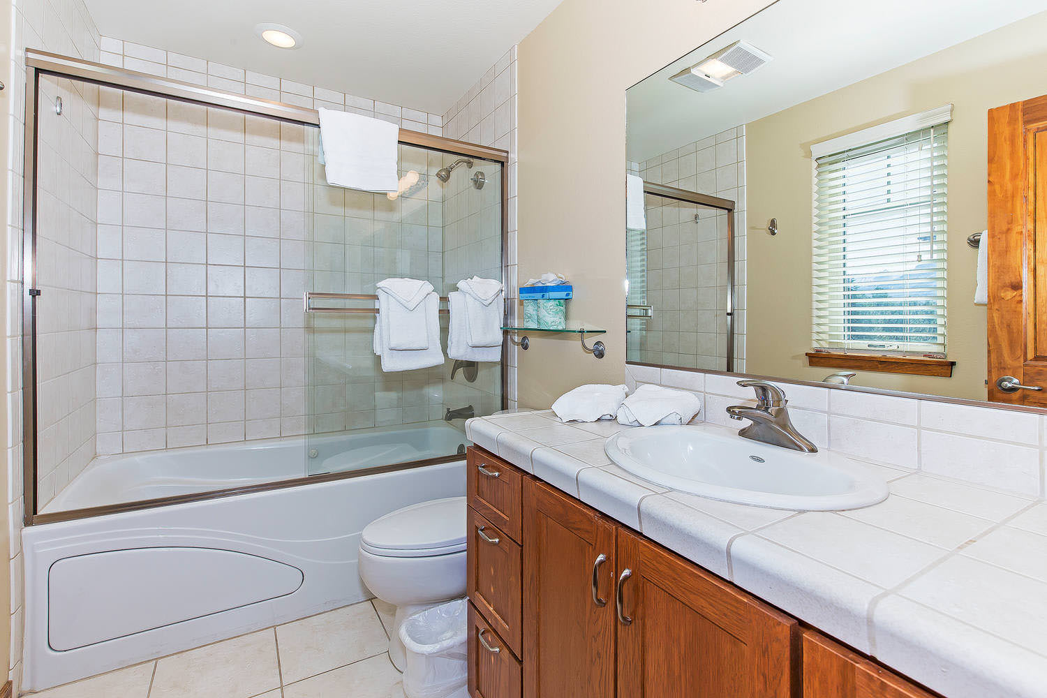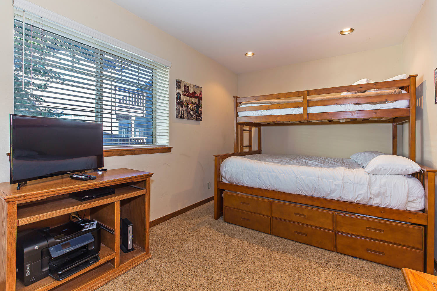 Each of the bedrooms has a flat screen TV with a BluRay DVD player. One of the guest bedrooms is located on the main level of this vacation rental. This guest bedroom is suitable for accommodating the kids as there is an XL Twin over Queen bunk bed. You will also find a Twin trundle and attached guest bathroom. This guest bathroom has a shower/tub combo.