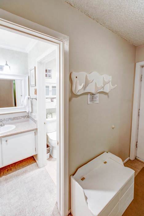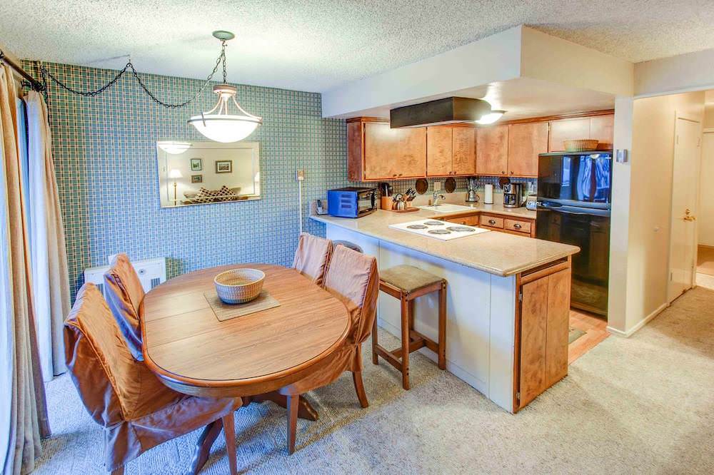 The kitchen has updated appliances and an ample amount of counter space. 2 seats are placed at the breakfast bar, offering dining space and encouraging guests to keep a conversation going with the chef in the kitchen. When your meal is ready to be served, call everyone over to the formal dining table. You can access the balcony from here as well. Step outside for a breath of fresh air and enjoy the partial view of the mountain and tall pine trees.
