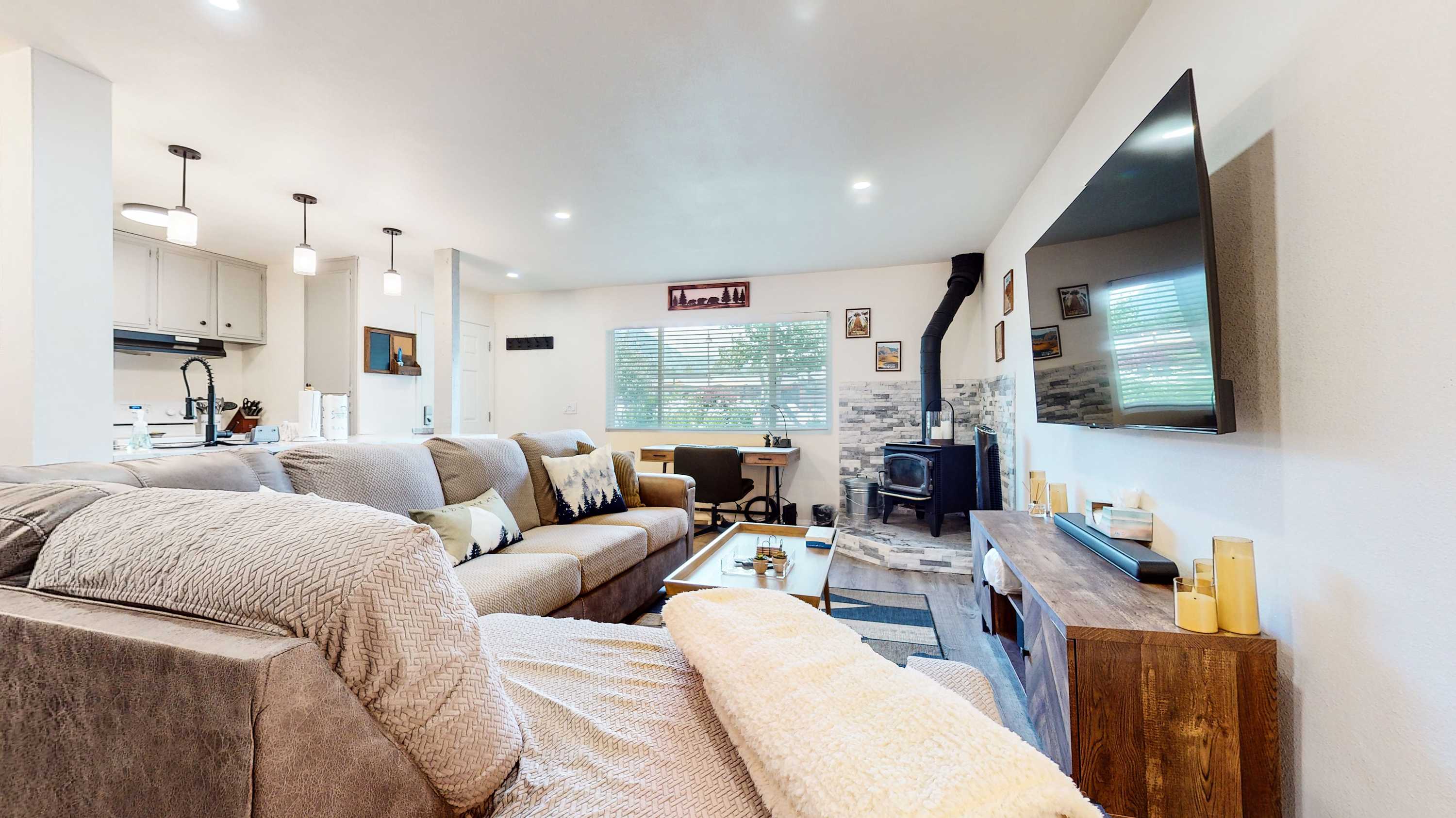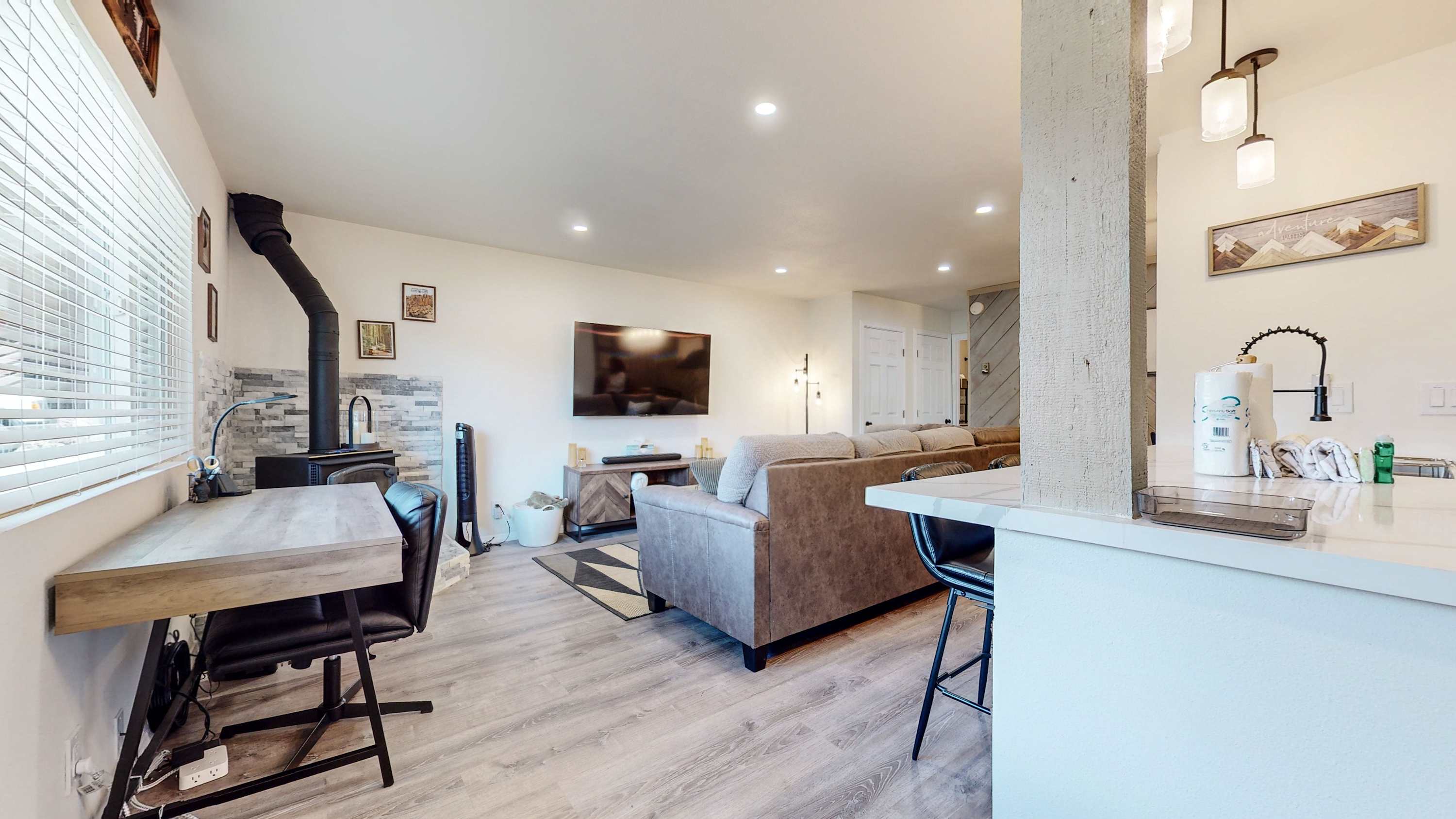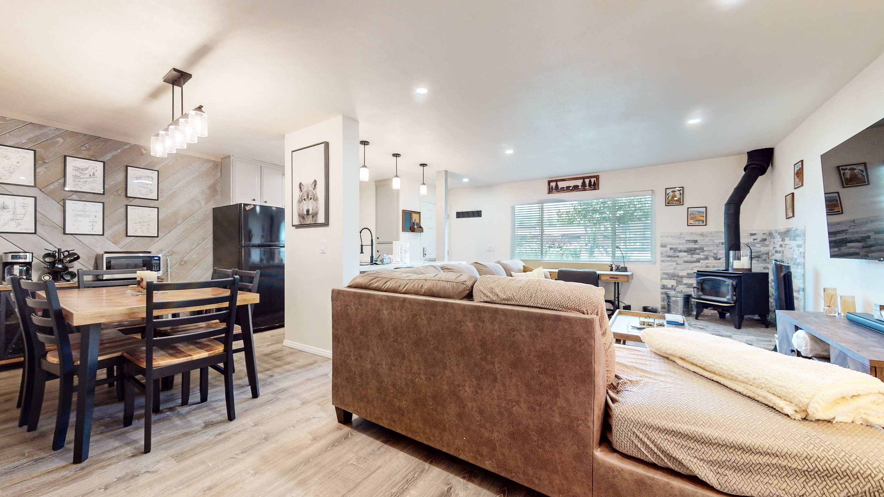 The home’s charming interior is a welcome sight at the end of busy days out and about, a desirable blend of modern-meets-rustic design elements and contemporary furnishings to maximize rest and rejuvenation. Gather together on the cushy L-shaped sofa to binge episodes of all your favorite shows on the mounted smart TV, a wood-burning fireplace providing warmth and ambiance in the colder months. If needed, a dedicated workspace offers a private space for keeping up with emails or taking important phone calls. The open floorplan flows you organically into the kitchen, fully equipped for all your culinary needs and showcasing newly painted cabinets, new utensils, and glossy stone countertops. Seat everyone together at the table for dining or a family game night, while high-top stools at the counter keep things light and casual for snack time or happy hour.
